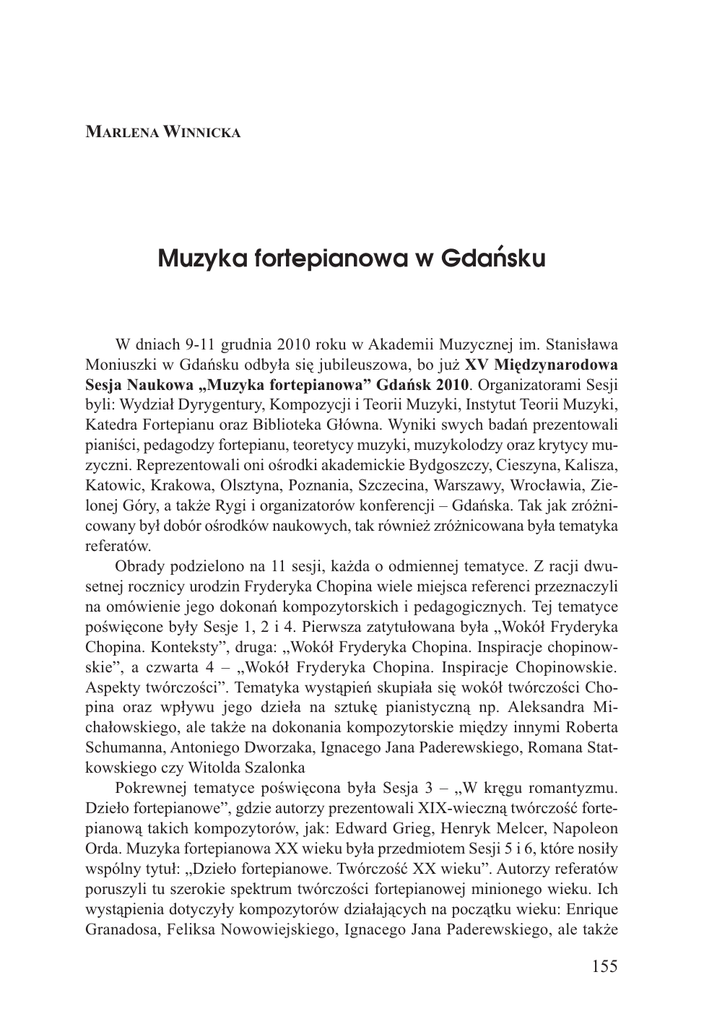 MARLENA WINNICKA Muzyka fortepianowa w Gdańsku W dniach 9-11 grudnia 2010 roku w Akademii Muzycznej im. Stanisława Moniuszki w Gdańsku odbyła się jubileuszowa, bo już XV Międzynarodowa Sesja Naukowa „Muzyka fortepianowa” Gdańsk 2010. Organizatorami Sesji byli: Wydział Dyrygentury, Kompozycji i Teorii Muzyki, Instytut Teorii Muzyki, Katedra Fortepianu oraz Biblioteka Główna. Wyniki swych badań prezentowali pianiści, pedagodzy fortepianu, teoretycy muzyki, muzykolodzy oraz krytycy muzyczni. Reprezentowali oni ośrodki akademickie Bydgoszczy, Cieszyna, Kalisza, Katowic, Krakowa, Olsztyna, Poznania, Szczecina, Warszawy, Wrocławia, Zielonej Góry, a także Rygi i organizatorów konferencji – Gdańska. Tak jak zróżnicowany był dobór ośrodków naukowych, tak również zróżnicowana była tematyka referatów. Obrady podzielono na 11 sesji, każda o odmiennej tematyce. Z racji dwusetnej rocznicy urodzin Fryderyka Chopina wiele miejsca referenci przeznaczyli na omówienie jego dokonań kompozytorskich i pedagogicznych. Tej tematyce poświęcone były Sesje 1, 2 i 4. Pierwsza zatytułowana była „Wokół Fryderyka Chopina. Konteksty”, druga: „Wokół Fryderyka Chopina. Inspiracje chopinowskie”, a czwarta 4 – „Wokół Fryderyka Chopina. Inspiracje Chopinowskie. Aspekty twórczości”. Tematyka wystąpień skupiała się wokół twórczości Chopina oraz wpływu jego dzieła na sztukę pianistyczną np. Aleksandra Michałowskiego, ale także na dokonania kompozytorskie między innymi Roberta Schumanna, Antoniego Dworzaka, Ignacego Jana Paderewskiego, Romana Statkowskiego czy Witolda Szalonka Pokrewnej tematyce poświęcona była Sesja 3 – „W kręgu romantyzmu. Dzieło fortepianowe”, gdzie autorzy prezentowali XIX-wieczną twórczość fortepianową takich kompozytorów, jak: Edward Grieg, Henryk Melcer, Napoleon Orda. Muzyka fortepianowa XX wieku była przedmiotem Sesji 5 i 6, które nosiły wspólny tytuł: „Dzieło fortepianowe. Twórczość XX wieku”. Autorzy referatów poruszyli tu szerokie spektrum twórczości fortepianowej minionego wieku. Ich wystąpienia dotyczyły kompozytorów działających na początku wieku: Enrique Granadosa, Feliksa Nowowiejskiego, Ignacego Jana Paderewskiego, ale także 155 MARLENA WINNICKA kompozytorów czasów nam współczesnych, m.in.: Krzysztofa Pendereckiego, Zygmunta Krauze, Juliusza Łuciuka, Andrzeja Cwojdzińskiego czy Augustyna Blocha i Pawła Szymańskiego. Pedagogice fortepianowej poświęcone były obrady w Sesji 7 – „Pianistyka. Wielcy pianiści i pedagodzy”. Mieliśmy okazję poznać tu pianistów i pedagogów tej miary, co Sergiusz Rachmaninow, Aleksander Skriabin, Włodzimierz Sofronicki. Najnowszych dokonań kompozytorskich dotyczyły Sesje: 8 – „Dzieło fortepianowe. Formy, gatunki, technologie” i 10 – „Dzieło fortepianowe. Twórczość XX i XXI wieku”. W referatach przedstawiono zarówno muzykę Iannisa Xenakisa, jak i Antoniego Kątskiego, Andrzeja Dobrowolskiego i Henryka Szopowicza, Andrzeja Dziadka i Mariusza Dubaja. Oprócz tradycyjnego traktowania i wykorzystania fortepianu ukazano nowe, niekonwencjonalne sposoby traktowania tego instrumentu. Tematyka posiedzenia Sesji 11 wynikała z jej tytułu: „Pianistyka. Z problematyki wykonawstwa”. Trzydniową Sesję zamknęły obrady plenarne. Ich tematem były „Koncepcje, teorie, interpretacje” oraz „Budownictwo fortepianowe”. W gdańskiej Akademii poruszono więc wszechstronnie zagadnienia dotyczące twórczości fortepianowej różnych epok i jej wykonawstwa, omówiono dydaktykę fortepianową, zaprezentowano sylwetki wybitnych wirtuozów światowej pianistyki, jak również znakomitych pedagogów. Wystąpienia wszystkich wykładowców kończyły się ożywionymi dyskusjami i pytaniami do nich. Większość referatów ilustrowana była nagraniami dźwiękowymi, co umożliwiało lepsze zrozumienie omawianych zagadnień. Wartościowym uzupełnieniem rozważań teoretycznych były dwa koncerty dotyczące muzyki fortepianowej. Obrady czwartkowe (9 grudnia) zakończył koncert pt. „Impresje chopinowskie”, którego wykonawcami było Classic Trio Leszka Kułakowskiego w składzie: Leszek Kułakowski – fortepian, Jacek Pelc – perkusja, Piotr Kułakowski – kontrabas. Trio zaprezentowało jazzowe interpretacje utworów F. Chopina w opracowaniu lidera zespołu – L. Kułakowskiego. Z kolei w dniu następnym, w piątek (10 grudnia), przedstawiono utwory fortepianowe kompozytorów gdańskich: Eugeniusza Głowskiego, Andrzeja Dziadka, Krzysztofa Olczaka, Marka Czerniewicza, Radosława Łuczkowskiego i Tadeusza Dixa. Wykonawcami koncertu byli pedagodzy Akademii Muzycznej w Gdańsku.
