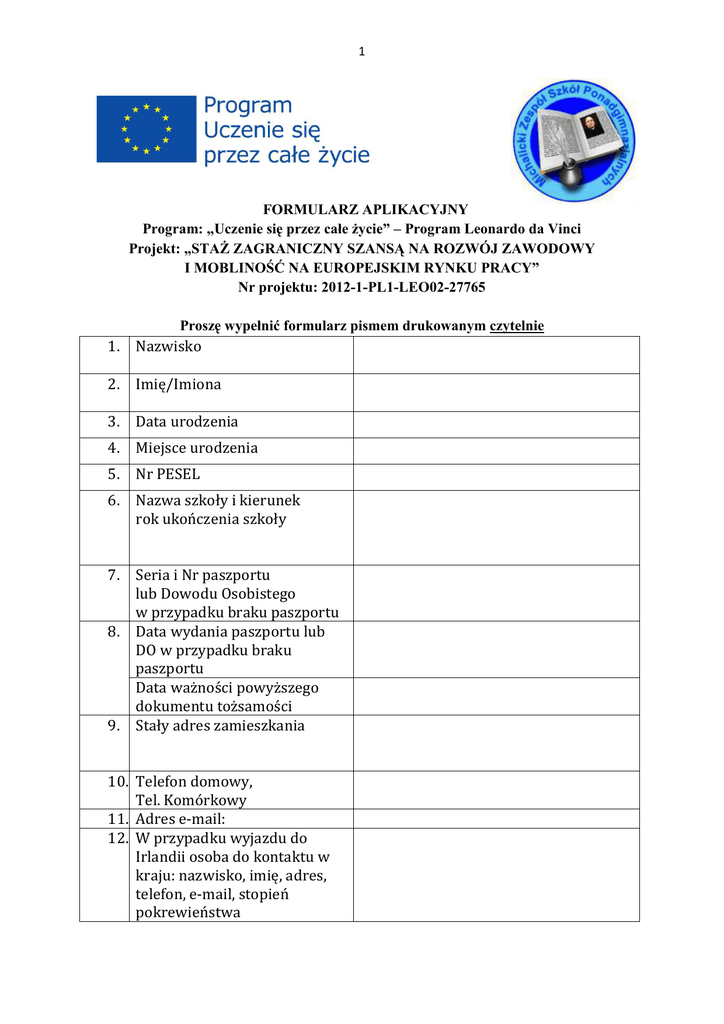 1 FORMULARZ APLIKACYJNY Program: „Uczenie się przez całe życie” – Program Leonardo da Vinci Projekt: „STAŻ ZAGRANICZNY SZANSĄ NA ROZWÓJ ZAWODOWY I MOBLINOŚĆ NA EUROPEJSKIM RYNKU PRACY” Nr projektu: 2012-1-PL1-LEO02-27765 Proszę wypełnić formularz pismem drukowanym czytelnie 1. Nazwisko 2. Imię/Imiona 3. Data urodzenia 4. Miejsce urodzenia 5. Nr PESEL 6. Nazwa szkoły i kierunek rok ukończenia szkoły 7. Seria i Nr paszportu lub Dowodu Osobistego w przypadku braku paszportu Data wydania paszportu lub DO w przypadku braku paszportu Data ważności powyższego dokumentu tożsamości Stały adres zamieszkania 8. 9. 10. Telefon domowy, Tel. Komórkowy 11. Adres e-mail: 12. W przypadku wyjazdu do Irlandii osoba do kontaktu w kraju: nazwisko, imię, adres, telefon, e-mail, stopień pokrewieństwa 2 13. Średnia ocen na zakończenie szkoły z przedmiotów zawodowych (weryfikacja na podstawie załączonej kserokopii świadectwa ukończenia szkoły) 14. Ocena z j. angielskiego i j. angielskiego zawodowego na zakończenie szkoły (weryfikacja na podstawie załączonej kserokopii świadectwa ukończenia szkoły) 15. Test znajomość j. angielskiego (liczba zdobytych punktów) 16. Znajomość j. angielskiego (bardzo dobra, komunikatywna, słaba) 17. Posiadane certyfikaty (proszę załączyć kserokopie) 18. Motywacja do wyjazdu (dlaczego chcesz wyjechać na staż, jakie widzisz korzyści) 19. Czy brałeś/łaś udział w stażu, stażu zagranicznym? (jeśli tak, w jakich i kiedy?) 20. Dotychczasowe doświadczenie zawodowe – odbyte praktyki zawodowe (gdzie i kiedy?) (wypełnia MZSP) (wypełnia MZSP) (wypełnia MZSP) 3 21. Zainteresowania 22. Stan zdrowia, przeciwwskazania lekarskie: Wyrażam zgodę na przetwarzanie moich danych osobowych zawartych w formularzu dla potrzeb niezbędnych do realizacji procesu rekrutacji (zgodnie z ustawą z dnia 29.08.1997 r. o Ochronie Danych Osobowych Dz. U. Nr 133 poz. 883) Data i czytelny podpis składającego aplikację: ___________________________________ Czytelny podpis rodziców/opiekunów: 1) __________________________________ 2) __________________________________ 3) lub opiekun _______________________ Dokumenty załączone do formularza aplikacyjnego: 1. Kserokopia świadectwa ukończenia szkoły ___________ szt. 2. Posiadane certyfikaty ______________ szt. 3. Inne _________ szt. Dokumenty przyjęto: Data: _____________________ Podpis: ___________________________________ _____________________________________________________________________ Projekt: „STAŻ ZAGRANICZNY SZANSĄ NA ROZWÓJ ZAWODOWY I MOBLINOŚĆ NA EUROPEJSKIM RYNKU PRACY” Nr projektu: 2012-1-PL1-LEO02-27765 jest realizowany w ramach Programu: „Uczenie się przez całe życie” przy wsparciu finansowym Komisji Europejskiej