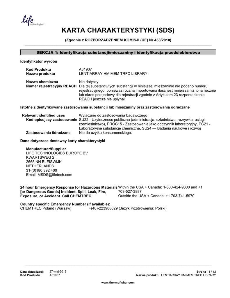 KARTA CHARAKTERYSTYKI (SDS) (Zgodnie z ROZPORZADZENIEM KOMISJI (UE) Nr 453/2010) ________________________________________________________________________________________________________________ SEKCJA 1: Identyfikacja substancji/mieszaniny i identyfikacja przedsiebiorstwa Identyfikator wyrobu Kod Produktu Nazwa produktu A31937 LENTIARRAY HM MEM TRFC LIBRARY Nie dotyczy Nazwa chemiczna Numer rejestracyjny REACH Dla tej substancji/tych substancji w niniejszej mieszaninie nie podano numeru rejestracyjnego, poniewaz roczna importowana ilosc jest mniejsza niz tona rocznie lub okres przejsciowy dla rejestracji zgodnie z Artykulem 23 rozporzadzenia REACH jeszcze nie uplynal. Istotne zidentyfikowane zastosowania substancji lub mieszaniny oraz zastosowania odradzane Wylacznie do zastosowania badawczego Relevant identified uses Kod opisujacy zastosowanie SU22 - Uzytecznosc publiczna (administracja, szkolnictwo, rozrywka, uslugi, rzemieslnictwo), PROC15 - Zastosowanie jako odczynnik laboratoryjny, PC21 Labor at or yj nesubst ancj echemi czne,SU24— Badani anaukoweir ozwój Nie do uzytku konsumenckiego. Zastosowania 0dradzane Dane dotyczace dostawcy karty charakterystyki Manufacturer/Supplier LIFE TECHNOLOGIES EUROPE BV KWARTSWEG 2 2665 NN BLEISWIJK NETHERLANDS 31-(0)180 392 400 Email: [email protected] 24 hour Emergency Response for Hazardous Materials Within the USA + Canada: 1-800-424-9300 and +1 703-527-3887 [or Dangerous Goods] Incident. Spill, Leak, Fire, Outside the USA + Canada: +1 703-741-5970 Exposure, or Accident. Call CHEMTREC Country specific Emergency Number (if available): CHEMTREC Poland (Warsaw) +(48)-223988029 (Jezyk Pozdrowienia: Polski) ________________________________________________________________________________________________________________ Data aktualizacji Kod Produktu 27-maj-2016 A31937 Strona 1 / 12 Nazwa produktu LENTIARRAY HM MEM TRFC LIBRARY www.thermofisher.com SEKCJA 2: Identyfikacja zagrozen Klasyfikacja substancji lub mieszaniny Klasyfikacja zgodna z Regulacja (WE) nr 1272/2008 (CLP) Zagrozenia fizyczne Nie klasyfikowany Zagrozenia dla zdrowia Nie klasyfikowany Zagrozenia dla srodowiska Nie klasyfikowany Additional information Nie dotyczy Skladniki etykiety Etykietowanie zgodne z Regulacja (WE) nr 1272/2008 (CLP) Piktogramy oznaczajace zagrozenie Brak piktogramu Haslo Ostrzegawcze Zaden(-a,-e) zwroty wskazujace na rodzaj zagrozenia Nie dotyczy Zwroty wskazujace na szczególne zagrozenia UE Nie dotyczy zwroty wskazujace na srodki ostroznosci Nie dotyczy zwroty wskazujace na srodki ostroznosci Nie dotyczy Zapobieganie Nie dotyczy Response Nie dotyczy Storage Nie dotyczy Utylizacja Nie dotyczy Inne zagrozenia Ta mieszanina nie zawiera zadnych substancji ocenianych jako PBT lub vPvB. ________________________________________________________________________________________________________________ Data aktualizacji Kod Produktu 27-maj-2016 A31937 Strona 2 / 12 Nazwa produktu LENTIARRAY HM MEM TRFC LIBRARY www.thermofisher.com SEKCJA 3: Sklad/informacja o skladnikach Component Nr CAS Nr EINECS Procent wagowy Numer rejestracyjny REACH Classification according to Regulation (EC) No 1272/2008 [CLP] 01-2119985427-23-X Acute Tox. 2 XXX H300Tox. 2 H330Irrit. 2 - H315Irrit. 2 - H319Sens. 1 H317Chronic 2 - H411 - Sodium selenite 10102-18-8 ( <0.00011 ) 10102-18-8 - <0.00011 Ammonium compounds ( <0.01 ) Tin compounds ( <0.01 ) Silver compounds ( <0.01 ) - Not Listed <0.01 - Not Listed <0.01 - - - Listed <0.01 01-2119513705-43-X XXX Cadmium compounds ( <0.01 ) Barium compouns ( <0.01 ) - Not Listed <0.01 - Oxid. Sol. 2 H272Corr. 1B H314Acute 1 H400Chronic 1 - H410 - - Not Listed <0.01 - - SEKCJA 4: Srodki pierwszej pomocy Opis srodków pierwszej pomocy Przeplukac duza iloscia wody. Nie ma koniecznosci zasiegniecia natychmiastowej pomocy medycznej. Ostroznie plukac woda przez kilka minut. Zdjac soczewki kontaktowe w przypadku ich noszenia, jesli ich zdjecie jest latwe. W przewidzianych warunkach normalnego uzycia nie powinno wystapic znaczace niebezpieczenstwo spozycia. Jesli czujesz sie zle, skorzystaj z porady lekarskiej. W przewidzianych warunkach normalnego uzycia tego materialu nie powinno wystapic niebezpieczenstwo wdychania. W razie koniecznosci skontaktuj sie z lekarzem. Leczyc objawowo. Kontakt ze skóra Kontakt z oczyma SPOZYCIE Wdychanie Uwagi dla lekarza Najwazniejsze objawy i dzialania, zarówno ostre i opóznione Nie dotyczy. Wskazanie ewentualnej koniecznosci bezzwlocznej pomocy medycznej i leczenia specjalnego Zaden(-a,-e). SEKCJA 5: Postepowanie w przypadku pozaru Srodki gasnicze Rozpylona woda. Dwutlenek wegla (CO2). Piana. Sucha substancja chemiczna. Brak danych. Odpowiednie srodki gasnicze Nieodpowiednie srodki gasnicze Szczególne zagrozenia zwiazane z substancja lub mieszanina Nieznane. Wskazówki dla strazy pozarnej Standardowa procedura w przypadku pozarów substancji chemicznych. ________________________________________________________________________________________________________________ Data aktualizacji Kod Produktu 27-maj-2016 A31937 Strona 3 / 12 Nazwa produktu LENTIARRAY HM MEM TRFC LIBRARY www.thermofisher.com SEKCJA 6: Postepowanie w przypadku niezamierzonego uwolnienia do srodowiska Indywidualne srodki ostroznosci, wyposazenie ochronne i procedury w sytuacjach awaryjnych Zapewnic odpowiednia wentylacje. Zawsze nosic zalecany osobisty sprzet ochronny. Stosowac wyposazenie ochrony indywidualnej. Wiecej szczególów znajduje sie w Czesci 8. Srodki ostroznosci w zakresie ochrony srodowiska Brak szczególnych wymagan co do ochrony srodowiska. Metody i materialy zapobiegajace rozprzestrzenianiu sie skazenia i sluzace do usuwania skazenia Zanurzyc w obojetnym srodku absorbujacym. Odniesienia do innych sekcji Patrz sekcja 8 po dalsze informacje. SEKCJA 7: Postepowanie z substancjami i mieszaninami oraz ich magazynowanie Srodki ostroznosci dotyczace bezpiecznego postepowania Stosowac wymagane srodki ochrony indywidualnej. . Warunki bezpiecznego magazyno