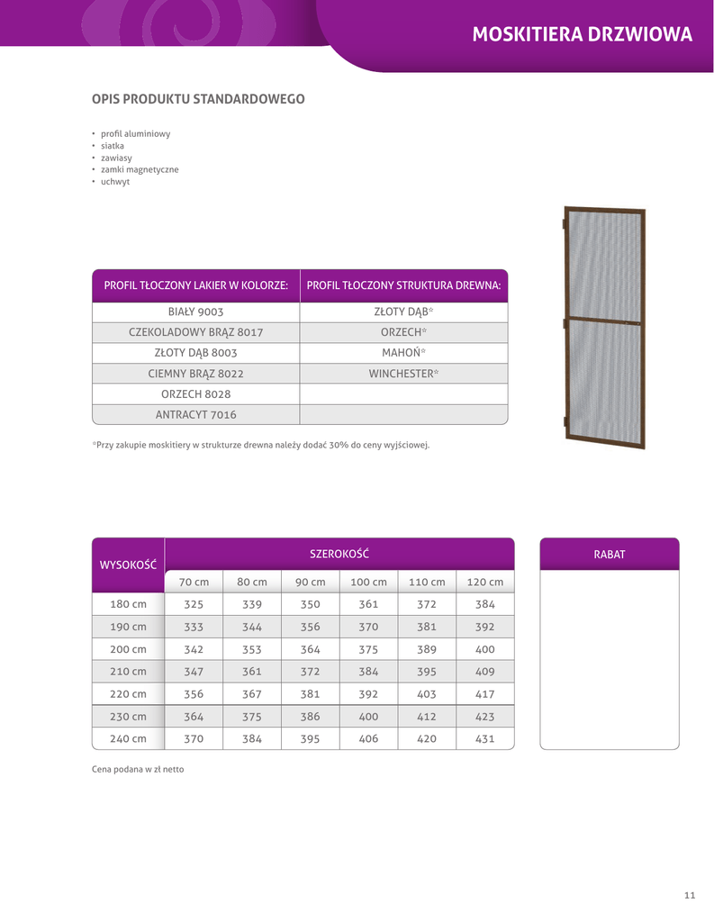 MOSKITIERA DRZWIOWA OPIS PRODUKTU STANDARDOWEGO • • • • • profil aluminiowy siatka zawiasy zamki magnetyczne uchwyt PROFIL TŁOCZONY LAKIER W KOLORZE: PROFIL TŁOCZONY STRUKTURA DREWNA: BIAŁY 9003 ZŁOTY DĄB* CZEKOLADOWY BRĄZ 8017 ORZECH* ZŁOTY DĄB 8003 MAHOŃ* CIEMNY BRĄZ 8022 WINCHESTER* ORZECH 8028 ANTRACYT 7016 *Przy zakupie moskitiery w strukturze drewna należy dodać 30% do ceny wyjściowej. SZEROKOŚĆ WYSOKOŚĆ RABAT 70 cm 80 cm 90 cm 100 cm 110 cm 120 cm 180 cm 325 339 350 361 372 384 190 cm 333 344 356 370 381 392 200 cm 342 353 364 375 389 400 210 cm 347 361 372 384 395 409 220 cm 356 367 381 392 403 417 230 cm 364 375 386 400 412 423 240 cm 370 384 395 406 420 431 Cena podana w zł netto 11 MOSKITIERA DRZWIOWA MOSKITIERA DRZWIOWA OPIS Moskitiera drzwiowa otwierana na zawiasach stanowi doskonałą ochronę przed owadami, gwarantując swobodne korzystaniezbalkonówczytarasów.Nieograniczawidocznościwświetledrzwi. Wykonana jest ze specjalnych aluminiowych profili drzwiowych z poprzeczką w środku lub bez , w kolorach białym, brązowym. Ramadrzwiowawypełnionajestsiatkązwłóknaszklanegokolorupopielatego. Istniejemożliwośćwypełnieniadolnejczęściramydo80cmwysokościpłytązpoliwęglanu. Moskitieradrzwiowamocowanajestzjednejstronyzapomocątrzechzawiasówdofutrynydrzwi,azdrugiejstronyprzy pomocydwóchzamkówmagnetycznychutrzymywanajestwpozycjizamkniętej. MoskitierędrzwiowąmożnamontowaćzarównododrzwizPCV,jakidrewnianych. POMIAR MOSKITIERY DRZWIOWEJ 1.Zmierzyćnajmniejszeświatło(szerokość,wysokość)wościeżnicydrzwiowejpootwarciukwaterynp.750x2100 UWAGA:przydrzwiachdrewnianychzokapnikiemwysokośćmierzymydookapnika. 2.Dozmierzonychwymiarówdodajemywartośćod30÷40mmdodrzwizPCV np.750+(30÷40mm)i2100+(30÷40mm) Dodrzwidrewnianychzokapnikiemnp.750+(30÷40mm)i2100+15mm 3. Do powyższych pomiarów musi być spełniony warunek – ościeżnica drzwi na obwodzie musi być widoczna z muru (szpalt)40mm. Winnychprzypadkachpomiarnależyrozpatrywaćindywidualnieidostosowaćdoistniejącychwarunków. 4.Należypodaćwysokośćpoprzeczkimontowanejwdrzwiachmoskitiery. Rozmieszczenie poprzeczki moskitiery drzwiowej wina pokrywać się z poprzeczką drzwi balkonowych ( jeżeli taka istnieje) 5. Należy podać rodzaj drzwi prawe lub lewe. Stojąc przed moskitierą drzwiową od strony montowania zawiasów do futrynyokreślamyrodzajdrzwi. -zawiasymontowanezprawejstrony-drzwiprawe -zawiasymontowanezlewejstrony-drzwilewe INSTRUKCJA MONTAŻU DRZWI 1.Montowanedrzwiprzystawiamydofutrynytak,abyrównomierniezachodziłynafutrynęnacałymobwodzie. 2.Przyużyciuołówkaodznaczamypołożeniepodstawyzawiasównafutrynie. 3.Ściągamypodstawyzawiasówprzezwyciągnięciemetalowychbolców. 4.Przykładamyściągniętepodstawyzawiasówdowyznaczonychwcześniejobrysównafutrynieiodznaczamymiejsca, gdziemająbyćmontowanewkręty. 5.Punktujemyzaznaczonemiejscainawiercamyprowadzeniewkrętówwiertłemø1mm. 6.Przykręcamypodstawyzawiasówdofutryny,zakładamymoskitierędrzwiowąiwsuwamymetalowebolce. 7.Pozamocowaniumoskitierydrzwiowejzdrugiejstronyfutrynyodznaczamyiprzykręcamyblaszkizamknięćmagnetycznych. 12