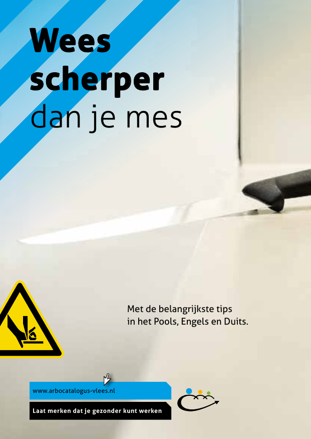 Wees scherper dan je mes Met de belangrijkste tips in het Pools, Engels en Duits. www.arbocatalogus-vlees.nl Laat merken dat je gezonder kunt werken Mesveiligheid 5 tips 2 3 1 4 5 De Arbocatalogus Vlees is een gezamenlijk initiatief van: Het mes is scherp en moet scherp blijven 1 Nóż jest ostry i taki musi pozostać The knife is sharp and must remain sharp Das Messer ist sehr scharf und es muss immer scharf sein 2 Kies het juiste mes voor de juiste handeling Wybieraj nóż odpowiedni do wykonywania danej czynności Choose the correct knife for the activity Wählen Sie das richtige Messer für die richtige Tätigkeit Lopen met je mes doe je alleen met je mes in een beschermhoes of messenrek Przemieszczając się z nożem trzymaj go zawsze w futerale ochronnym lub w przeznaczonym do tego stojaku Only walk carrying a knife if it is in a protective sheath or rack Tragen Sie das Messer immer in einer Schutzhülle oder in einem Messerblock bei sich 3 4 Draag de juiste beschermingsmiddelen Noś odpowiednią odzież ochronną Wear the correct personal protection equipment Tragen Sie die passende Schutzkleidung Houd voldoende vrije werkruimte Zachowaj odpowiednio dużo wolnej przestrzeni wokół siebie podczas wykonywania pracy Keep sufficient free space to work Halten Sie genügend freien Arbeitsraum 5 Op www.arbocatalogus-vlees.nl vind je richtlijnen en oplossingen voor veilig werken. Neem een kijkje en zoek hulpmiddelen die jouw werk verbeteren. En win een leuke prijs. Voorkom snij- of steekwonden bij jezelf of jouw collega’s. Meer weten over werken met messen? Kijk op www.arbocatalogus-vlees.nl of vraag je leidinggevende. Chciałbyś wiedzieć więcej na temat pracy z nożem i nożycami? Odwiedź stronę www.arbocatalogusvlees.nl lub zapytaj swojego przełożonego. Do you want to know more about working with knives? Click www.arbocatalogus-vlees.nl or ask your supervisor. Mehr Informationen über das Arbeiten mit Messern finden Sie auf www.arbocatalogus-vlees.nl oder fragen Sie Ihren Abteilungsleiter. © Copyright 2010 PVE | De Arbocatalogus Vlees is een initiatief van werkgevers en werknemers. Werken met messen is niet zonder gevaren.
