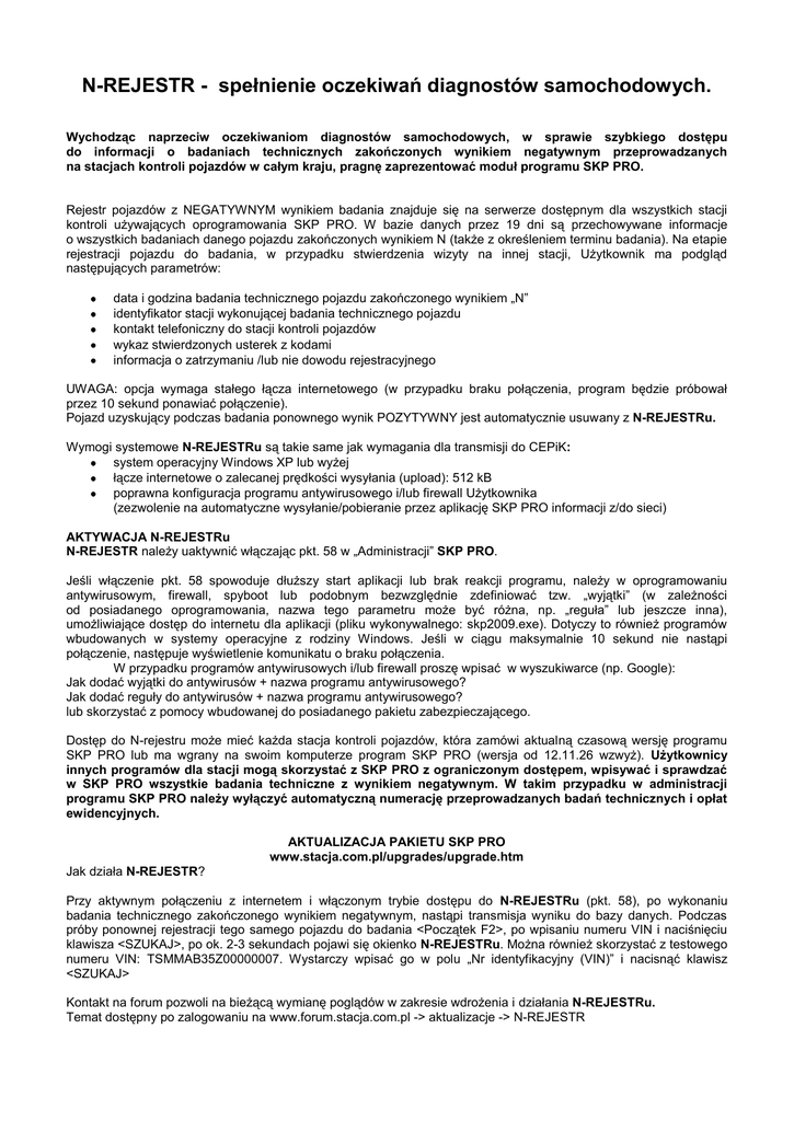 N-REJESTR - spełnienie oczekiwań diagnostów samochodowych. Wychodząc naprzeciw oczekiwaniom diagnostów samochodowych, w sprawie szybkiego dostępu do informacji o badaniach technicznych zakończonych wynikiem negatywnym przeprowadzanych na stacjach kontroli pojazdów w całym kraju, pragnę zaprezentować moduł programu SKP PRO. Rejestr pojazdów z NEGATYWNYM wynikiem badania znajduje się na serwerze dostępnym dla wszystkich stacji kontroli używających oprogramowania SKP PRO. W bazie danych przez 19 dni są przechowywane informacje o wszystkich badaniach danego pojazdu zakończonych wynikiem N (także z określeniem terminu badania). Na etapie rejestracji pojazdu do badania, w przypadku stwierdzenia wizyty na innej stacji, Użytkownik ma podgląd następujących parametrów: data i godzina badania technicznego pojazdu zakończonego wynikiem „N” identyfikator stacji wykonującej badania technicznego pojazdu kontakt telefoniczny do stacji kontroli pojazdów wykaz stwierdzonych usterek z kodami informacja o zatrzymaniu /lub nie dowodu rejestracyjnego UWAGA: opcja wymaga stałego łącza internetowego (w przypadku braku połączenia, program będzie próbował przez 10 sekund ponawiać połączenie). Pojazd uzyskujący podczas badania ponownego wynik POZYTYWNY jest automatycznie usuwany z N-REJESTRu. Wymogi systemowe N-REJESTRu są takie same jak wymagania dla transmisji do CEPiK: system operacyjny Windows XP lub wyżej łącze internetowe o zalecanej prędkości wysyłania (upload): 512 kB poprawna konfiguracja programu antywirusowego i/lub firewall Użytkownika (zezwolenie na automatyczne wysyłanie/pobieranie przez aplikację SKP PRO informacji z/do sieci) AKTYWACJA N-REJESTRu N-REJESTR należy uaktywnić włączając pkt. 58 w „Administracji” SKP PRO. Jeśli włączenie pkt. 58 spowoduje dłuższy start aplikacji lub brak reakcji programu, należy w oprogramowaniu antywirusowym, firewall, spyboot lub podobnym bezwzględnie zdefiniować tzw. „wyjątki” (w zależności od posiadanego oprogramowania, nazwa tego parametru może być różna, np. „reguła” lub jeszcze inna), umożliwiające dostęp do internetu dla aplikacji (pliku wykonywalnego: skp2009.exe). Dotyczy to również programów wbudowanych w systemy operacyjne z rodziny Windows. Jeśli w ciągu maksymalnie 10 sekund nie nastąpi połączenie, następuje wyświetlenie komunikatu o braku połączenia. W przypadku programów antywirusowych i/lub firewall proszę wpisać w wyszukiwarce (np. Google): Jak dodać wyjątki do antywirusów + nazwa programu antywirusowego? Jak dodać reguły do antywirusów + nazwa programu antywirusowego? lub skorzystać z pomocy wbudowanej do posiadanego pakietu zabezpieczającego. Dostęp do N-rejestru może mieć każda stacja kontroli pojazdów, która zamówi aktualną czasową wersję programu SKP PRO lub ma wgrany na swoim komputerze program SKP PRO (wersja od 12.11.26 wzwyż). Użytkownicy innych programów dla stacji mogą skorzystać z SKP PRO z ograniczonym dostępem, wpisywać i sprawdzać w SKP PRO wszystkie badania techniczne z wynikiem negatywnym. W takim przypadku w administracji programu SKP PRO należy wyłączyć automatyczną numerację przeprowadzanych badań technicznych i opłat ewidencyjnych. AKTUALIZACJA PAKIETU SKP PRO www.stacja.com.pl/upgrades/upgrade.htm Jak działa N-REJESTR? Przy aktywnym połączeniu z internetem i włączonym trybie dostępu do N-REJESTRu (pkt. 58), po wykonaniu badania technicznego zakończonego wynikiem negatywnym, nastąpi transmisja wyniku do bazy danych. Podczas próby ponownej rejestracji tego samego pojazdu do badania <Początek F2>, po wpisaniu numeru VIN i naciśnięciu klawisza <SZUKAJ>, po ok. 2-3 sekundach pojawi się okienko N-REJESTRu. Można również skorzystać z testowego numeru VIN: TSMMAB35Z00000007. Wystarczy wpisać go w polu „Nr identyfikacyjny (VIN)” i nacisnąć klawisz <SZUKAJ> Kontakt na forum pozwoli na bieżącą wymianę poglądów w zakresie wdrożenia i działania N-REJESTRu. Temat dostępny po zalogowaniu na www.forum.stacja.com.pl -> aktualizacje -> N-REJESTR