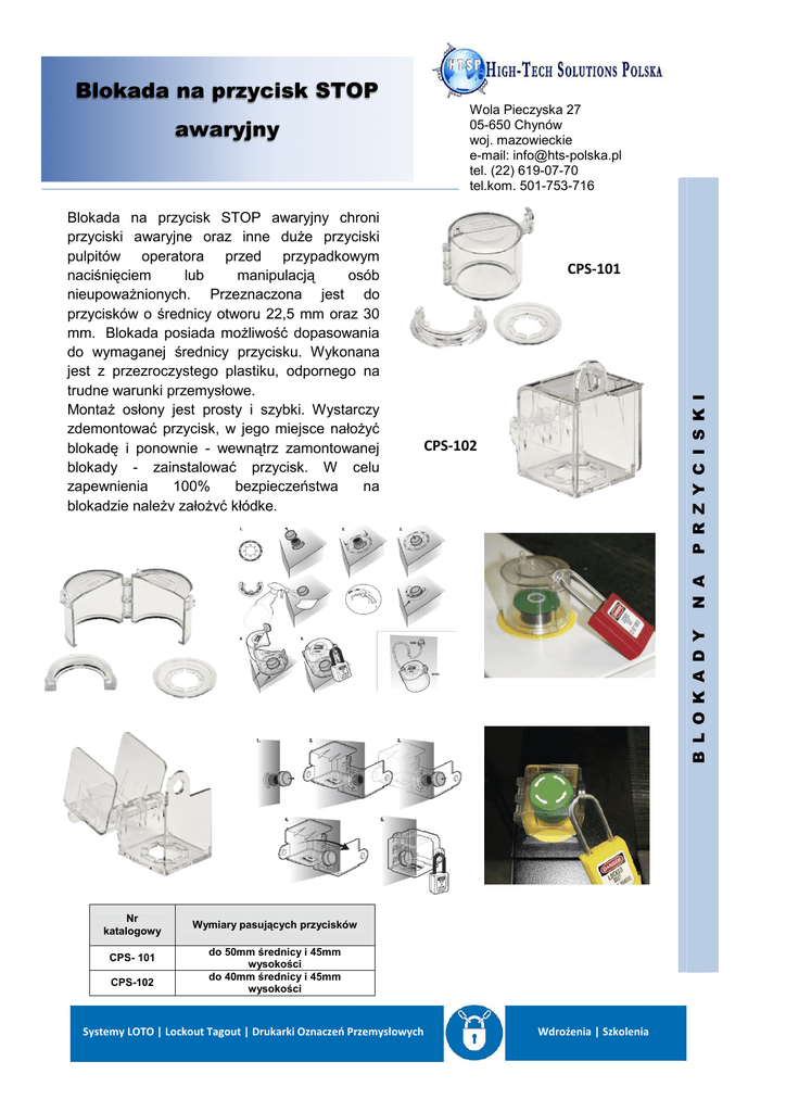 Blokada na przycisk STOP CPS-101 CPS-102 B L O K A D Y N A Blokada na przycisk STOP awaryjny chroni przyciski awaryjne oraz inne duże przyciski pulpitów operatora przed przypadkowym naciśnięciem lub manipulacją osób nieupoważnionych. Przeznaczona jest do przycisków o średnicy otworu 22,5 mm oraz 30 mm. Blokada posiada możliwość dopasowania do wymaganej średnicy przycisku. Wykonana jest z przezroczystego plastiku, odpornego na trudne warunki przemysłowe. Montaż osłony jest prosty i szybki. Wystarczy zdemontować przycisk, w jego miejsce nałożyć blokadę i ponownie - wewnątrz zamontowanej blokady - zainstalować przycisk. W celu zapewnienia 100% bezpieczeństwa na blokadzie należy założyć kłódkę. P R Z Y C I S K I awaryjny Wola Pieczyska 27 05-650 Chynów woj. mazowieckie e-mail: [email protected] tel. (22) 619-07-70 tel.kom. 501-753-716 Nr katalogowy CPS- 101 CPS-102 Wymiary pasujących przycisków do 50mm średnicy i 45mm wysokości do 40mm średnicy i 45mm wysokości Systemy LOTO | Lockout Tagout | Drukarki Oznaczeń Przemysłowych Wdrożenia | Szkolenia