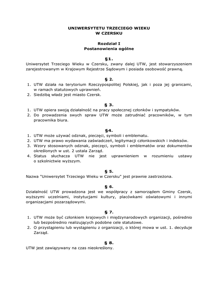 UNIWERSYTETU TRZECIEGO WIEKU W CZERSKU Rozdział I Postanowienia ogólne §1. Uniwersytet Trzeciego Wieku w Czersku, zwany dalej UTW, jest stowarzyszeniem zarejestrowanym w Krajowym Rejestrze Sądowym i posiada osobowość prawną. § 2. 1. UTW działa na terytorium Rzeczypospolitej Polskiej, jak i poza jej granicami, w ramach statutowych uprawnień. 2. Siedzibą władz jest miasto Czersk. § 3. 1. UTW opiera swoją działalność na pracy społecznej członków i sympatyków. 2. Do prowadzenia swych spraw UTW może zatrudniać pracowników, w tym pracownika biura. §4. 1. UTW może używać odznak, pieczęci, symboli i emblematu. 2. UTW ma prawo wydawania zaświadczeń, legitymacji członkowskich i indeksów. 3. Wzory stosowanych odznak, pieczęci, symboli i emblematów oraz dokumentów określonych w ust. 2 ustala Zarząd. 4. Status słuchacza UTW nie jest uprawnieniem w rozumieniu ustawy o szkolnictwie wyższym. § 5. Nazwa "Uniwersytet Trzeciego Wieku w Czersku" jest prawnie zastrzeżona. § 6. Działalność UTW prowadzona jest we współpracy z samorządem Gminy Czersk, wyższymi uczelniami, instytucjami kultury, placówkami oświatowymi i innymi organizacjami pozarządowymi. § 7. 1. UTW może być członkiem krajowych i międzynarodowych organizacji, pośrednio lub bezpośrednio realizujących podobne cele statutowe. 2. O przystąpieniu lub wystąpieniu z organizacji, o której mowa w ust. 1. decyduje Zarząd. § 8. UTW jest zawiązywany na czas nieokreślony. Rozdział II Cele i sposoby działania § 9. Celem UTW jest: 1. stymulowanie rozwoju osobowego oraz sprawności intelektualnej i fizycznej osób starszych, 2. aktywizacja społeczna osób chętnych do uczestniczenia w pracach UTW, 3. upowszechnianie profilaktyki gerontologicznej, 4. podejmowanie działań na rzecz ludzi starszych, w tym także niepełnosprawnych, 5. podejmowanie działań zmierzających do utrzymania, nawiązania i zacieśnienia więzi i kontaktów osobistych między mieszkańcami regionu, a szczególnie pomiędzy osobami starszymi oraz z młodym pokoleniem. § 10. UTW realizuje swoje cele w szczególności poprzez: 1. prowadzenie działalności edukacyjno - informacyjnej; w szczególności organizacja wykładów, seminariów, lektoratów języków obcych, odczytów, konferencji, spotkań, prelekcji, konkursów, warsztatów, koncertów i in., 2. prowadzenie praktycznych zajęć z zakresu kultury fizycznej i rekreacji, organizowanie wycieczek turystycznych i krajoznawczych, 3. przekazywanie przez członków UTW nabytych doświadczeń życiowych i zawodowych młodzieży i innym grupom społecznym potrzebującym wsparcia, 4. współpracę z innymi uniwersytetami trzeciego wieku oraz ich międzynarodową federacją, ze szkołami wyższymi, placówkami naukowo - badawczymi, instytucjami rządowymi, jednostkami samorządu terytorialnego oraz instytucjami samorządowymi, organizacjami pozarządowymi, środkami masowego przekazu i sektorem gospodarczym, a także z osobami o uznanym autorytecie, 5. prowadzenie ewentualnej działalności wydawniczej, 6. realizację zadań profilaktyki oraz ochrony i promocji zdrowia, 7. włączanie się w realizację inicjatyw dotyczących ochrony przyrody i ekologii, 8. integrację społeczności lokalnej, 9. inne zadania zgodne z celami statutowymi. § 11. UTW współpracuje: 1. z instytucjami i organizacjami o pokrewnych celach, a w szczególności z krajowymi i zagranicznymi uniwersytetami trzeciego wieku – ich międzynarodową federacją, 2. z innymi instytucjami i organizacjami wyrażającymi chęć współuczestnictwa w realizacji celów UTW. § 12. UTW może prowadzić akcje informacyjne i propagandowe o zakresie swej działalności m. in. za pośrednictwem środków masowego przekazu oraz może wydawać publikacje o tematyce związanej z celami i działalnością UTW. § 13. UTW może - na zasadach określonych w odrębnych przepisach - prowadzić działalność gospodarczą. Dochód z działalności gospodarczej UTW służy wyłącznie do realizacji celów statutowych UTW i nie może być przeznaczony do podziału pomiędzy jego członków Rozdział III Członkowie, ich prawa i obowiązki § 14. Członkowie UTW dzielą się na: 1. zwyczajnych, 2. wspierających, 3. honorowych. § 15. 1. Członkiem zwyczajnym może być każdy pełnoletni obywatel R.P., który pragnie wnieść swój wkład pracy społecznej w urzeczywistnienie celów UTW, złoży pisemną deklarację o przystąpieniu do UTW oraz będzie opłacał należną składkę. 2. Przyjmowanie i skreślanie z listy członków zwyczajnych następuje na podstawie uchwały Zarządu. § 16. Członkiem wspierającym może zostać w oparciu o złożoną deklarację: a. osoba fizyczna, która zobowiąże się do systematycznego opłacania składki członkowskiej, dobrowolnie ustalonej, ale przewyższającej składkę członka zwyczajnego, bądź do honorowego świadczenia usług potrzebnych w realizacji celów UTW określonych w § 9. b. osoba prawna, która zobowiąże się do systematycznego opłacania składki członkowskiej dobrowolnie ustalonej, ale przewyższającej składkę członka zwyczajnego, bądź zobowiąże się do bezpłatnych, stałych świadczeń rzeczowych (np. użyczenia lokalu, sal wykładowych, seminaryjnych, gimnastycznych i innych lub pomocy technicznej) i innych świadczeń rzeczowych służących prawidłowemu funkcjonowaniu UTW. § 17. być osoba 1. Członkiem honorowym może fizyczna szczególnie zasłużona w urzeczywistnianiu celów UTW. 2. Nadanie godności członka honorowego następuje na podstawie uchwały Walnego Zebrania Członków. § 18. 1. Członek zwyczajny ma prawo do: a) czynnego i biernego prawa wyborczego do władz UTW, b) uczestniczenia w zebraniach, odczytach, konferencjach, sympozjach itp. organizowanych przez władze UTW, c) korzystania z pomocy i urządzeń UTW zgodnie z regulaminem, d) zgłaszania wniosków dotyczących działalności UTW. 2. Członek zwyczajny zobowiązany 
