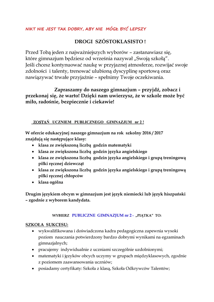 NIKT NIE JEST TAK DOBRY, ABY NIE MÓGŁ BYĆ LEPSZY DROGI SZÓSTOKLASISTO ! Przed Tobą jeden z najważniejszych wyborów – zastanawiasz się, które gimnazjum będziesz od września nazywał „Swoją szkołą”. Jeśli chcesz kontynuować naukę w przyjaznej atmosferze, rozwijać swoje zdolności i talenty, trenować ulubioną dyscyplinę sportową oraz nawiązywać trwałe przyjaźnie – spełnimy Twoje oczekiwania. Zapraszamy do naszego gimnazjum – przyjdź, zobacz i przekonaj się, że warto! Dzięki nam uwierzysz, że w szkole może być miło, radośnie, bezpiecznie i ciekawie! ZOSTAŃ UCZNIEM PUBLICZNEGO GIMNAZJUM nr 2 ! W ofercie edukacyjnej naszego gimnazjum na rok szkolny 2016 / 2017 znajdują się następujące klasy: klasa ze zwiększoną liczbą godzin matematyki klasa ze zwiększona liczbą godzin języka angielskiego klasa ze zwiększona liczbą godzin języka angielskiego i grupą treningową piłki ręcznej dziewcząt klasa ze zwiększona liczbą godzin języka angielskiego i grupą treningową piłki ręcznej chłopców klasa ogólna Drugim językiem obcym w gimnazjum jest język niemiecki lub język hiszpański – zgodnie z wyborem kandydata. WYBIERZ PUBLICZNE GIMNAZJUM nr 2 - „PIĄTKA” TO: SZKOŁA SUKCESU: wykwalifikowana i doświadczona kadra pedagogiczna zapewnia wysoki poziom nauczania potwierdzony bardzo dobrymi wynikami na egzaminach gimnazjalnych; pracujemy indywidualnie z uczniami szczególnie uzdolnionymi; matematyki i języków obcych uczymy w grupach międzyklasowych, zgodnie z poziomem zaawansowania uczniów; posiadamy certyfikaty: Szkoła z klasą, Szkoła Odkrywców Talentów; stawiamy wysokie wymagania, zapewniając jednocześnie dobrą atmosferę i życzliwy stosunek do każdego ucznia; promujemy sport – w naszej szkole powstał Ośrodek Szkolenia w Piłce Ręcznej, grupy treningowe prowadzą doświadczeni trenerzy; SZKOŁA BEZPIECZNA I ATRAKCYJNA: posiadamy nowoczesną bazę dydaktyczną; zapewniamy całodobowy monitoring budynku i otoczenia szkoły; korzystamy z bogatej bazy sportowej; prowadzimy różnorodne zajęcia dodatkowe, koła zainteresowań oraz międzynarodowe projekty edukacyjne; promujemy zdrowy styl życia; posiadamy zasobną bibliotekę i czytelnię ze stale powiększającą się bazą multimedialną; SZKOŁA TRADYCJI: edukacja historyczna, patriotyczna i kulturalna jest naszym priorytetem; uczniowie biorą udział w akcjach charytatywnych, aktywnie pracują w szkolnym wolontariacie; uroczyście obchodzimy Dzień Patrona Szkoły, wyróżniamy uczniów podczas uroczystości Nasi Najlepsi; SZKOŁA PRZYJAZNA UCZNIOM I RODZICOM: zapewniamy naukę w życzliwej atmosferze i bezpiecznych warunkach; troszczymy się o bezpieczeństwo fizyczne i psychiczne uczniów, zapewniamy wsparcie psychologiczno-pedagogiczne psychologa i pedagogów szkolnych; zapewniamy wykwalifikowaną opiekę medyczną; rodzice mają zapewniony dostęp do dziennika elektronicznego oraz możliwość indywidualnych konsultacji ze wszystkimi nauczycielami