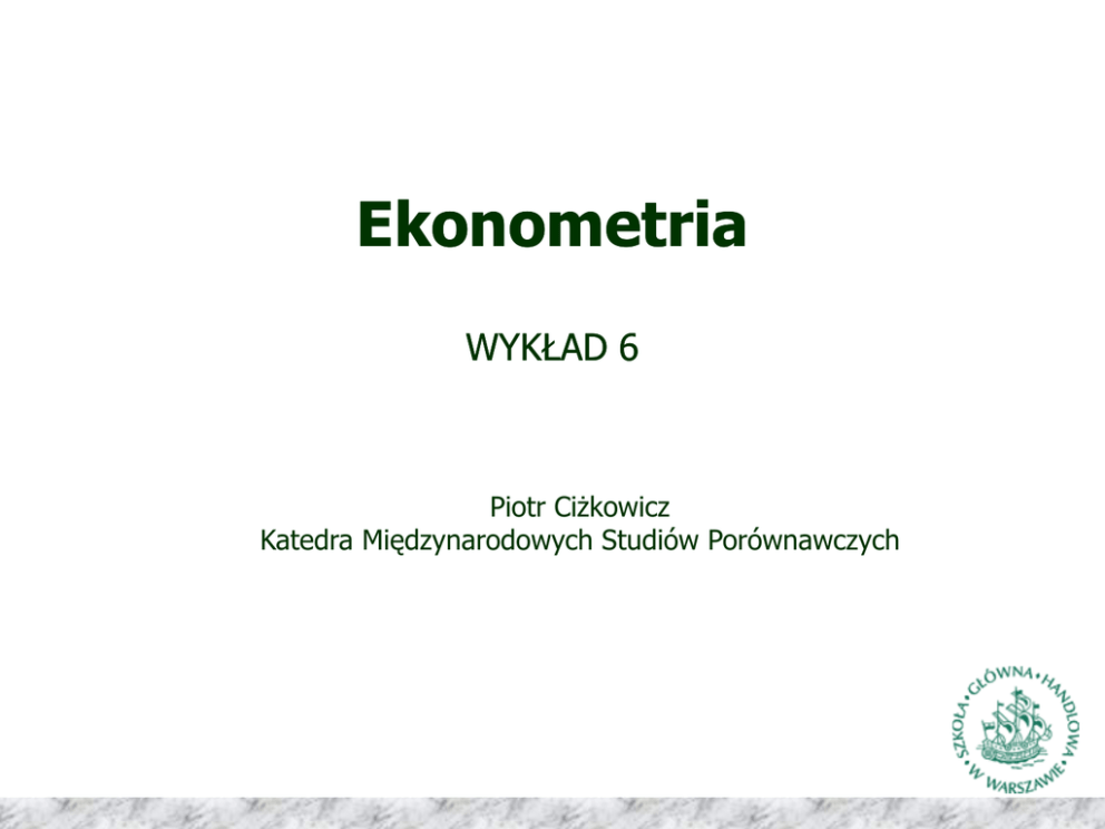 Ekonometria WYKŁAD 6 Piotr Ciżkowicz Katedra Międzynarodowych Studiów Porównawczych Plan Czym się zajmiemy: 1. Błędy HAC - uzupełnienie 2. Modele zmiennej jakościowej Skorygowane błędy standardowe w przypadku autokorelacji i heteroskedastyczności ► Postać ogólna macierzy kowariancji składnika losowego ► Postać ogólna macierzy kowariancji estymatora: ►Postać macierzy kowariancji dla estymatora FGLS (feasible generalized least squares) lub EGLS (od estimated): Heteroscedasticity- consistent standard errors (błędy White’a lub błędy HC) ► Na podstawie macierz kowariancji można zapisać też jako: ► White (1980) pokazał, że do estymacji tej macierzy potrzebny jest jedynie zgodny estymator macierzy Heteroscedasticity- consistent standard errors (błędy White’a lub błędy HC) ► Przy dość ogólnych założeniach zgodnym estymatorem powyższej macierzy jest co pozwala na estymację „prawdziwej” macierzy kowariancji estymatora OLS ► Na tej postawie można wyznaczyć zgodne błędy szacunku Heteroscedasticity-and-autocorellation- consistent standard errors (błędy HAC lub błędy Neweya-Westa) ► Podejście HA jest szczególnym przypadkiem estymacji błędów HAC postaci: gdzie ►Dla w(j)=0 otrzymujemy błędy HA. Przy autokorelacji najczęściej stosuje się wago Bartletta postaci ► Intuicyjnie oddają one fakt, że zazwyczaj autokorelacja maleje wraz z rzędem opóźnienia j. Modele zmiennej jakościowej ►Zmienne jakościowe stosowane są do kwantyfikacji cech jakościowych np. płci, przedziału dochodów, jakości produktu itp. ►Bardzo często zmienne te przyjmują postać binarną (zerojedynkową) np. 1- kobieta, 0- mężczyzna ►Modele zmiennej jakościowej to takie, w których zmienną objaśnianą w modelu jest zmienna jakościowa zazwyczaj zerojedynkowa. ►Zmienne objaśniające mogą być zarówno zmiennymi jakościowymi, jak i ilościowymi ►Postać funkcyjna zależności może być różna, w szczególności może mieć charakter nieliniowy Liniowy Model Prawdopodobieństwa (1) ►LMP w postaci teoretycznej zapisujemy jako gdzie y(i) jest zmienną zero-jedynkową ►Wartości empiryczne zmiennej objaśnianej są równe 0 lub 1, jednak wartości teoretyczne (wynikające z modelu) nie mają takich ograniczeń ►Jaka jest interpretacja wartości teoretycznych y(i)? Co oznacza wartość 0.3, jeśli zmienna objaśniana przyjmuje wartość 1, gdy dana osoba jest bezrobotna, a 0 gdy pracująca? ►Należy zauważyć, że: natomiast z postaci funkcyjnej modelu wynika, że Liniowy Model Prawdopodobieństwa (2) ►Z powyższego wynika że: co oznacza, że wartość teoretyczna zmiennej objaśnianej może być interpretowana jako prawdopodobieństwo tego, że zmienna y(i) przyjmie wartość 1 ► Interpretacja parametrów strukturalnych LMP odnosi się do zmian prawdopodobieństwa w reakcji na jednostkową zmianę wartości zmiennej objaśniającej przy innych czynnikach niezmienionych. Liniowy Model Prawdopodobieństwa (3) ►Przykład: oszacowano LMP postaci: gdzie y(i) przyjmuje wartość 1, gdy dane gospodarstwo domowe posiada mieszkanie na własność i 0 w pozostałych przypadkach, zaś zmienna x określa miesięczny dochód rozporządzalny gospodarstwa domowego w tys. zł. ►Przy dochodzie rozporządzalnym równym 10 tys. zł prawdopodobieństwo tego, że dane gospodarstwo domowe posiada mieszkanie na własność wynosi 0.5, zaś wzrost dochodu o 1 tys. zł prowadzi do wzrostu prawdopodobieństwa posiadania mieszkania o 0.03. Liniowy Model Prawdopodobieństwa (4) Główne ograniczenia LMP: ►Ograniczenie nr 1: ► składniki losowe w LMP nie mają rozkładu normalnego; ► analizując własności składnika losowego na podstawie poznanych wcześniej testów, dochodzimy do wniosku, że charakteryzuje się on heteroskedastycznością gdyż zachodzi: ► utrudniona jest więc ocena istotności dokonywana na podstawie standardowych testów ►Ograniczenie nr 2: ► teoretyczne wartości zmiennej objaśnianej mogą być mniejsze od 0 i większe od 1 ► uniemożliwia to ich interpretację w kategoriach prawdopodobieństwa Liniowy Model Prawdopodobieństwa (5) Model logitowy (1) ►Model logitowy bazuje na funkcji logistycznej określonej wzorem ►Przykład funkcji logistycznej: Model logitowy (2) ►Funkcję logistyczną można sformułować w innej wersji, w której przyjmuje wartość nasycenia równą 1, stąd nadaje się do modelowania prawdopodobieństwa: ►Model prawdopodobieństwa ma więc postać: gdzie: ►Z powyższego wynika, że Model logitowy (3) ►Logit to logarytm ilorazu szans, czyli relacji prawdopodobieństwa zdarzenia, dla którego y przyjmuje wartość 1 i zdarzenia przeciwnego – relacja z zakładów bukmacherskich ►Przykład: przy strzelaniu do tarczy i prawdopodobieństwie trafienia w jej środek równym 0.33 iloraz szans wynosi ½, czyli szansa na trafienie vs. szansa na nietrafienie mają się jak 1 do 2. ►Iloraz szans ma postać zaś logit: Model logitowy (4) ►Z powyższego wynika interpretacja parametrów strukturalnych, która jest inna niż w LMP. ►Z powyższego wynika, że zmiana wartości zmiennej jednostkę prowadzi do wzrostu ilorazu szans o o ►Wpływ zmian wartości zmiennej na wartość prawdopodobieństwa przyjęcia przez zmienną objaśnianą wartości 1 definiujemy jako efekt krańcowy i wyznaczamy ze wzoru Model logitowy (5) ►Uwaga do interpretacji efektu krańcowego: wartość efektu krańcowego jest funkcją wartości pozostałych zmiennych objaśniających modelu. Oznacza to, że efekt krańcowy jest nieliniowy: ► wpływ na prawdopodobieństwo tej samej zmiany jednostkowej zmiennej objaśniającej prowadzi do innej zmiany prawdopodobieństwa w zależności od pozostałych wartości zmiennych objaśniających ► wartość efektu krańcowego podaje się dla zadanej wartości wszystkich zmiennych objaśniających modelu. ►W pakietach ekonometrycznych podaje się efekty k