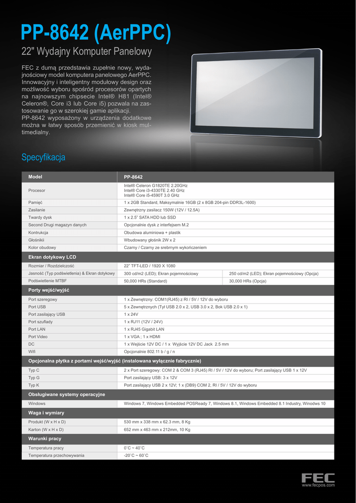 PP-8642 (AerPPC) 22" Wydajny Komputer Panelowy FEC z dumą przedstawia zupełnie nowy, wydajnościowy model komputera panelowego AerPPC. Innowacyjny i inteligentny modułowy design oraz możliwość wyboru spośród procesorów opartych na najnowszym chipsecie Intel® H81 (Intel® Celeron®, Core i3 lub Core i5) pozwala na zastosowanie go w szerokiej gamie aplikacji. PP-8642 wyposażony w urządzenia dodatkowe można w łatwy sposób przemienić w kiosk multimedialny. Specyfikacja Model PP-8642 Procesor Intel® Celeron G1820TE 2.20GHz Intel® Core i3-4330TE 2.40 GHz Intel® Core i5-4590T 3.0 GHz Pamięć 1 x 2GB Standard, Maksymalnie 16GB (2 x 8GB 204-pin DDR3L-1600) Zasilanie Zewnętrzny zasilacz 150W (12V / 12.5A) Twardy dysk 1 x 2.5” SATA HDD lub SSD Second Drugi magazyn danych Opcjonalnie dysk z interfejsem M.2 Kontrukcja Obudowa aluminiowa + plastik Głośnikii Wbudowany głośnik 2W x 2 Kolor obudowy Czarny / Czarny ze srebrnym wykończeniem Ekran dotykowy LCD Rozmiar / Rozdzielczość 22” TFT-LED / 1920 X 1080 Jasność (Typ podświetlenia) & Ekran dotykowy 300 cd/m2 (LED); Ekran pojemnościowy 250 cd/m2 (LED); Ekran pojemnościowy (Opcja) Podświetlenie MTBF 50,000 HRs (Standard) 30,000 HRs (Opcja) Porty wejść/wyjść Port szeregowy 1 x Zewnętrzny: COM1(RJ45) z RI / 5V / 12V do wyboru Port USB 5 x Zewnętrznych (Tył USB 2.0 x 2, USB 3.0 x 2, Bok USB 2.0 x 1) Port zasilający USB 1 x 24V Port szuflady 1 x RJ11 (12V / 24V) Port LAN 1 x RJ45 Gigabit LAN Port Video 1 x VGA ; 1 x HDMI DC 1 x Wejście 12V DC / 1 x Wyjście 12V DC Jack 2.5 mm Wifi Opcjonalnie 802.11 b / g / n Opcjonalna płytka z portami wejść/wyjść (instalowana wyłącznie fabrycznie) Typ C 2 x Port szeregowy: COM 2 & COM 3 (RJ45) RI / 5V / 12V do wyboru; Port zasilający USB 1 x 12V Typ G Port zasilający USB: 3 x 12V Typ K Port zasilający USB 2 x 12V; 1 x (DB9) COM 2, RI / 5V / 12V do wyboru Obsługiwane systemy operacyjne Windows Windows 7, Windows Embedded POSReady 7, Windows 8.1, Windows Embedded 8.1 Industry, Winodws 10 Waga i wymiary Produkt (W x H x D) 530 mm x 338 mm x 62.3 mm, 8 Kg Karton (W x H x D) 652 mm x 463 mm x 212mm, 10 Kg Warunki pracy Temperatura pracy 0˚C ~ 40˚C Temperatura przechowywania -20˚C ~ 60˚C