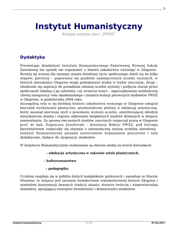 1 Instytut Humanistyczny Kolejna witryna sieci „PWSZ” Dydaktyka Prezentując działalność Instytutu Humanistycznego Państwowej Wyższej Szkoły Zawodowej nie sposób nie wspomnieć o historii szkolnictwa wyższego w Głogowie. Rozwój tej ważnej dla naszego miasta dziedziny życia społecznego dzieli się na kilka etapów; pierwszy – pojawienie się punktów zamiejscowych uczelni wyższych, w których mieszkańcy Głogowa mogli podejmować studia w trybie zaocznym, drugi – obudzenie się aspiracji do posiadania własnej uczelni wyższej i podjęcia starań przez społeczność lokalną o jej założenie, czy wreszcie trzeci – zapoczątkowany symboliczną chwilą inauguracji roku akademickiego i immatry-kulacji pierwszych studentów PWSZ w Głogowie, w październiku 2004 roku. Szczególną rolę w tej krótkiej historii szkolnictwa wyższego w Głogowie odegrał kierunek wychowanie plastyczne, przekształcony później w edukację artystyczną, który nasunął pierwszą myśl o powołaniu wyższej uczelni, umożliwiającej młodym mieszkańcom miasta i regionu odbywanie bezpłatnych studiów dziennych w miejscu zamieszkania. Za sprawą ówczesnych studiów zaocznych rozpoczął pracę w Głogowie prof. dr hab. Eugeniusz Józefowski – dzisiejszy Rektor PWSZ, pod którego kierownictwem rozpoczęły się starania o autonomiczną wyższą uczelnię zawodową. Instytut Humanistyczny posiada nowocześnie wyposażone pracownie i sale dydaktyczne, będące do dyspozycji studentów. W Instytucie Humanistycznym realizowane są obecnie studia na trzech kierunkach: – edukacja artystyczna w zakresie sztuk plastycznych, – kulturoznawstwo – pedagogika Uczelnia znajduje się w pobliżu dużych kompleksów parkowych i sąsiaduje ze Starym Miastem; to miejsce jest zarazem świadectwem wielokulturowej historii Głogowa i symbolem kontynuacji dawnych tradycji miasta, stwarza twórczą i niepowtarzalną atmosferę, sprzyjającą rozwojowi świadomości i kreatywności studentów. Instytut Humanistyczny -1/2- 07.03.2017 2 Instytut Humanistyczny -2/2- 07.03.2017