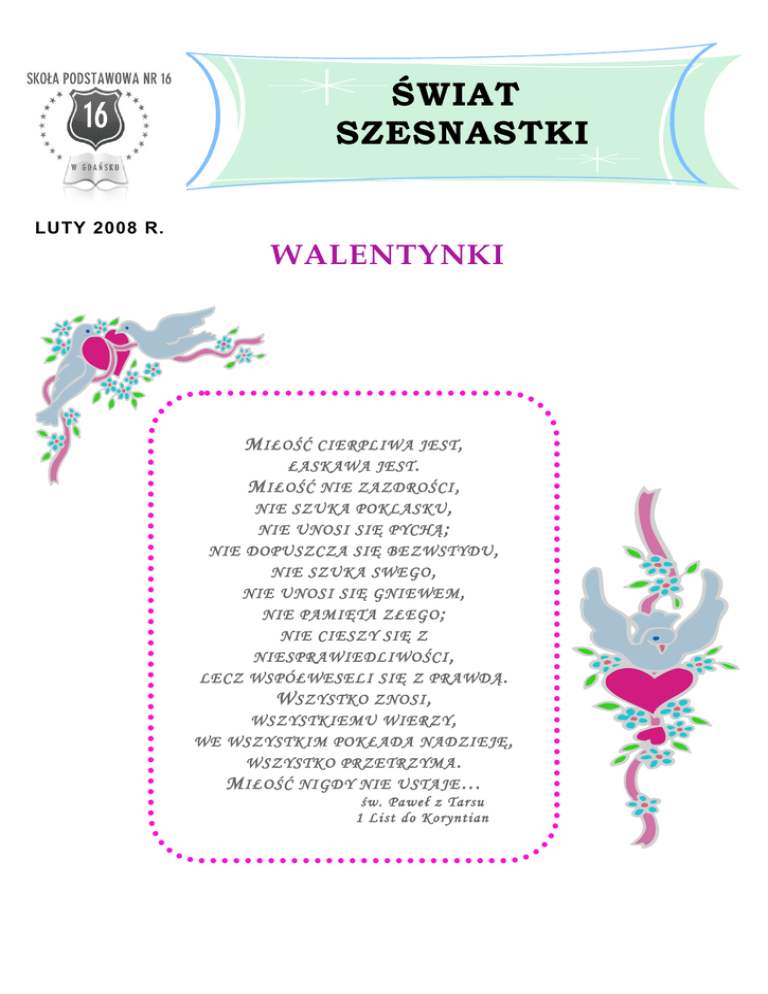 ŚWIAT SZESNASTKI LUTY 2008 R. WALENTYNKI M IŁOŚĆ CIERPLIWA JEST , ŁASKAWA JEST . M IŁOŚĆ NIE ZAZDROŚCI , NIE SZUKA POKLASKU , NIE UNOSI SIĘ PYCHĄ ; NIE DOPUSZCZA SIĘ BE ZWSTYDU , NIE SZUKA SWEGO , NIE UNOSI SIĘ GNIEWE M , NIE PAMIĘTA ZŁEGO ; NIE CIESZY SIĘ Z NIESPRAWIEDLIWOŚCI , LECZ WSPÓŁWESELI SIĘ Z PRAWDĄ . W SZYSTKO ZNOSI , WSZYSTKIEMU WIERZY , WE WSZYSTKIM POKŁADA NADZIEJĘ , WSZYSTKO PRZETRZYMA . M IŁOŚĆ NIGDY NIE USTAJE … św. Paweł z Tarsu 1 List do Koryntian
