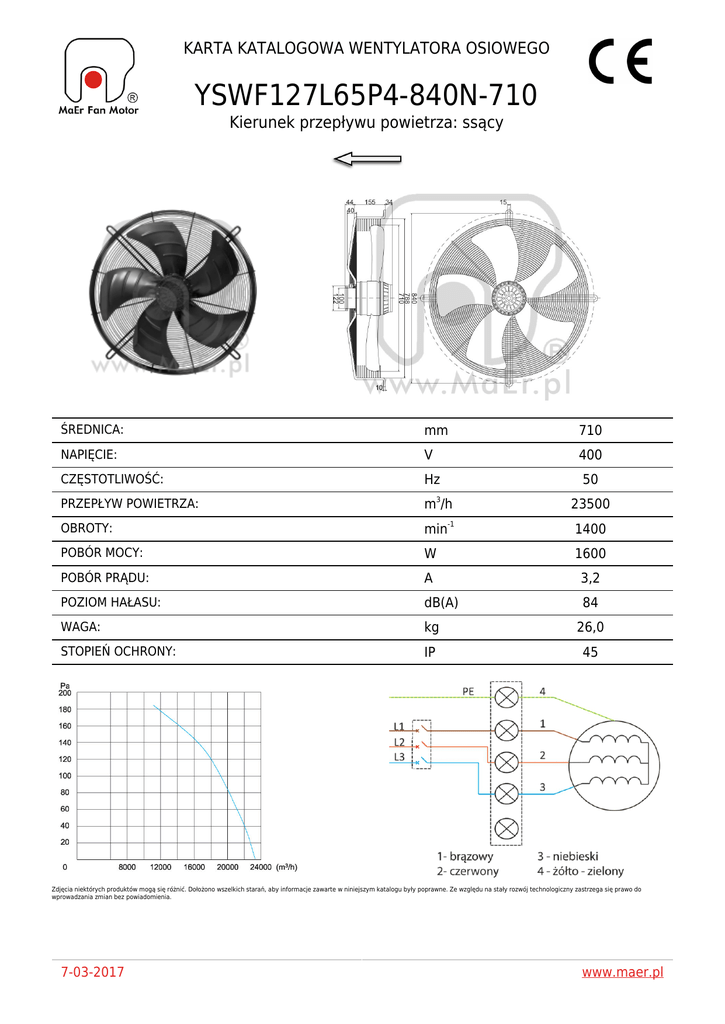 KARTA KATALOGOWA WENTYLATORA OSIOWEGO YSWF127L65P4-840N-710 Kierunek przepływu powietrza: ssący ŚREDNICA: mm 710 NAPIĘCIE: V 400 CZĘSTOTLIWOŚĆ: Hz 50 PRZEPŁYW POWIETRZA: m3/h 23500 OBROTY: min-1 1400 POBÓR MOCY: W 1600 POBÓR PRĄDU: A 3,2 POZIOM HAŁASU: dB(A) 84 WAGA: kg 26,0 STOPIEŃ OCHRONY: IP 45 Zdjęcia niektórych produktów mogą się różnić. Dołożono wszelkich starań, aby informacje zawarte w niniejszym katalogu były poprawne. Ze względu na stały rozwój technologiczny zastrzega się prawo do wprowadzania zmian bez powiadomienia. 7-03-2017 www.maer.pl