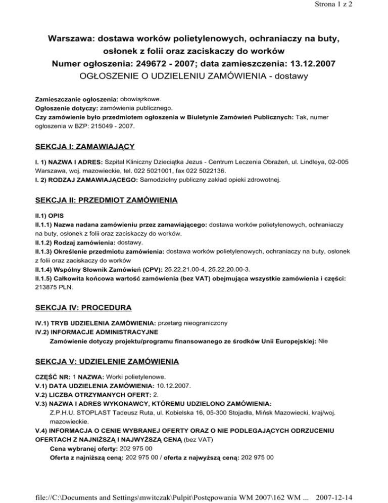 Strona 1 z 2 Warszawa: dostawa worków polietylenowych, ochraniaczy na buty, osłonek z folii oraz zaciskaczy do worków Numer ogłoszenia: 249672 - 2007; data zamieszczenia: 13.12.2007 OGŁOSZENIE O UDZIELENIU ZAMÓWIENIA - dostawy Zamieszczanie ogłoszenia: obowiązkowe. Ogłoszenie dotyczy: zamówienia publicznego. Czy zamówienie było przedmiotem ogłoszenia w Biuletynie Zamówień Publicznych: Tak, numer ogłoszenia w BZP: 215049 - 2007. SEKCJA I: ZAMAWIAJĄCY I. 1) NAZWA I ADRES: Szpital Kliniczny Dzieciątka Jezus - Centrum Leczenia Obrażeń, ul. Lindleya, 02-005 Warszawa, woj. mazowieckie, tel. 022 5021001, fax 022 5022136. I. 2) RODZAJ ZAMAWIAJĄCEGO: Samodzielny publiczny zakład opieki zdrowotnej. SEKCJA II: PRZEDMIOT ZAMÓWIENIA II.1) OPIS II.1.1) Nazwa nadana zamówieniu przez zamawiającego: dostawa worków polietylenowych, ochraniaczy na buty, osłonek z folii oraz zaciskaczy do worków. II.1.2) Rodzaj zamówienia: dostawy. II.1.3) Określenie przedmiotu zamówienia: dostawa worków polietylenowych, ochraniaczy na buty, osłonek z folii oraz zaciskaczy do worków II.1.4) Wspólny Słownik Zamówień (CPV): 25.22.21.00-4, 25.22.20.00-3. II.1.5) Całkowita końcowa wartość zamówienia (bez VAT) obejmująca wszystkie zamówienia i części: 213875 PLN. SEKCJA IV: PROCEDURA IV.1) TRYB UDZIELENIA ZAMÓWIENIA: przetarg nieograniczony IV.2) INFORMACJE ADMINISTRACYJNE Zamówienie dotyczy projektu/programu finansowanego ze środków Unii Europejskiej: Nie SEKCJA V: UDZIELENIE ZAMÓWIENIA CZĘŚĆ NR: 1 NAZWA: Worki polietylenowe. V.1) DATA UDZIELENIA ZAMÓWIENIA: 10.12.2007. V.2) LICZBA OTRZYMANYCH OFERT: 2. V.3) NAZWA I ADRES WYKONAWCY, KTÓREMU UDZIELONO ZAMÓWIENIA: Z.P.H.U. STOPLAST Tadeusz Ruta, ul. Kobielska 16, 05-300 Stojadła, Mińsk Mazowiecki, kraj/woj. mazowieckie. V.4) INFORMACJA O CENIE WYBRANEJ OFERTY ORAZ O NIE PODLEGAJĄCYCH ODRZUCENIU OFERTACH Z NAJNIŻSZĄ I NAJWYŻSZĄ CENĄ (bez VAT) Cena wybranej oferty: 202 975 00 Oferta z najniższą ceną: 202 975 00 / oferta z najwyższą ceną: 202 975 00 file://C:\Documents and Settings\mwitczak\Pulpit\Postępowania WM 2007\162 WM ... 2007-12-14 Strona 2 z 2 Waluta: PLN. CZĘŚĆ NR: 2 NAZWA: Ochraniacze, osłonki, zaciskacze. V.1) DATA UDZIELENIA ZAMÓWIENIA: 10.12.2007. V.2) LICZBA OTRZYMANYCH OFERT: 2. V.3) NAZWA I ADRES WYKONAWCY, KTÓREMU UDZIELONO ZAMÓWIENIA: Z.P.H.U. STOPLAST Tadeusz Ruta, ul. Kobielska 16, 05-300 Mińsk Mazowiecki Stojadła, kraj/woj. mazowieckie. V.4) INFORMACJA O CENIE WYBRANEJ OFERTY ORAZ O NIE PODLEGAJĄCYCH ODRZUCENIU OFERTACH Z NAJNIŻSZĄ I NAJWYŻSZĄ CENĄ (bez VAT) Cena wybranej oferty: 10 900 Oferta z najniższą ceną: 10 900 / oferta z najwyższą ceną: 10 900 Waluta: PLN. file://C:\Documents and Settings\mwitczak\Pulpit\Postępowania WM 2007\162 WM ... 2007-12-14