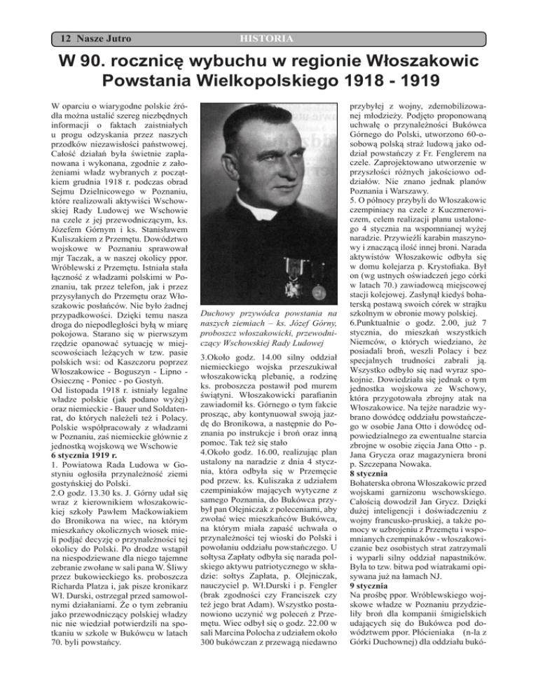 12 Nasze Jutro 12 Nasze Jutro HISTORIA HISTORIA W 90. rocznicę wybuchu w regionie Włoszakowic Powstania Wielkopolskiego 1918 - 1919 W oparciu o wiarygodne polskie źródła można ustalić szereg niezbędnych informacji o faktach zaistniałych u progu odzyskania przez naszych przodków niezawisłości państwowej. Całość działań była świetnie zaplanowana i wykonana, zgodnie z założeniami władz wybranych z początkiem grudnia 1918 r. podczas obrad Sejmu Dzielnicowego w Poznaniu, które realizowali aktywiści Wschowskiej Rady Ludowej we Wschowie na czele z jej przewodniczącym, ks. Józefem Górnym i ks. Stanisławem Kuliszakiem z Przemętu. Dowództwo wojskowe w Poznaniu sprawował mjr Taczak, a w naszej okolicy ppor. Wróblewski z Przemętu. Istniała stała łączność z władzami polskimi w Poznaniu, tak przez telefon, jak i przez przysyłanych do Przemętu oraz Włoszakowic posłańców. Nie było żadnej przypadkowości. Dzięki temu nasza droga do niepodległości byłą w miarę pokojowa. Starano się w pierwszym rzędzie opanować sytuację w miejscowościach leżących w tzw. pasie polskich wsi: od Kaszczoru poprzez Włoszakowice - Boguszyn - Lipno Osiecznę - Poniec - po Gostyń. Od listopada 1918 r. istniały legalne władze polskie (jak podano wyżej) oraz niemieckie - Bauer und Soldatenrat, do których należeli też i Polacy. Polskie współpracowały z władzami w Poznaniu, zaś niemieckie głównie z jednostką wojskową we Wschowie 6 stycznia 1919 r. 1. Powiatowa Rada Ludowa w Gostyniu ogłosiła przynależność ziemi gostyńskiej do Polski. 2.O godz. 13.30 ks. J. Górny udał się wraz z kierownikiem włoszakowickiej szkoły Pawłem Maćkowiakiem do Bronikowa na wiec, na którym mieszkańcy okolicznych wiosek mieli podjąć decyzję o przynależności tej okolicy do Polski. Po drodze wstąpił na niespodziewane dla niego tajemne zebranie zwołane w sali pana W. Śliwy przez bukowieckiego ks. proboszcza Richarda Platza i, jak pisze kronikarz Wł. Durski, ostrzegał przed samowolnymi działaniami. Że o tym zebraniu jako przewodniczący polskiej władzy nic nie wiedział potwierdzili na spotkaniu w szkole w Bukówcu w latach 70. byli powstańcy. Duchowy przywódca powstania na naszych ziemiach – ks. Józef Górny, proboszcz włoszakowicki, przewodniczący Wschowskiej Rady Ludowej 3.Około godz. 14.00 silny oddział niemieckiego wojska przeszukiwał włoszakowicką plebanię, a rodzinę ks. proboszcza postawił pod murem świątyni. Włoszakowicki parafianin zawiadomił ks. Górnego o tym fakcie prosząc, aby kontynuował swoją jazdę do Bronikowa, a następnie do Poznania po instrukcje i broń oraz inną pomoc. Tak też się stało 4.Około godz. 16.00, realizując plan ustalony na naradzie z dnia 4 stycznia, która odbyła się w Przemęcie pod przew. ks. Kuliszaka z udziałem czempiniaków mających wytyczne z samego Poznania, do Bukówca przybył pan Olejniczak z poleceniami, aby zwołać wiec mieszkańców Bukówca, na którym miała zapaść uchwała o przynależności tej wioski do Polski i powołaniu oddziału powstańczego. U sołtysa Zapłaty odbyła się narada polskiego aktywu patriotycznego w składzie: sołtys Zapłata, p. Olejniczak, nauczyciel p. Wł.Durski i p. Fengler (brak zgodności czy Franciszek czy też jego brat Adam). Wszystko postanowiono uczynić wg poleceń z Przemętu. Wiec odbył się o godz. 22.00 w sali Marcina Polocha z udziałem około 300 bukówczan z przewagą niedawno przybyłej z wojny, zdemobilizowanej młodzieży. Podjęto proponowaną uchwałę o przynależności Bukówca Górnego do Polski, utworzono 60-osobową polską straż ludową jako oddział powstańczy z Fr. Fenglerem na czele. Zaprojektowano utworzenie w przyszłości różnych jakościowo oddziałów. Nie znano jednak planów Poznania i Warszawy. 5. O północy przybyli do Włoszakowic czempiniacy na czele z Kuczmerowiczem, celem realizacji planu ustalonego 4 stycznia na wspomnianej wyżej naradzie. Przywieźli karabin maszynowy i znaczącą ilość innej broni. Narada aktywistów Włoszakowic odbyła się w domu kolejarza p. Krystofiaka. Był on (wg ustnych oświadczeń jego córki w latach 70.) zawiadowcą miejscowej stacji kolejowej. Zasłynął kiedyś bohaterską postawą swoich córek w strajku szkolnym w obronie mowy polskiej. 6.Punktualnie o godz. 2.00, już 7 stycznia, do mieszkań wszystkich Niemców, o których wiedziano, że posiadali broń, weszli Polacy i bez specjalnych trudności zabrali ją. Wszystko odbyło się nad wyraz spokojnie. Dowiedziała się jednak o tym jednostka wojskowa ze Wschowy, która przygotowała zbrojny atak na Włoszakowice. Na tejże naradzie wybrano dowódcę oddziału powstańczego w osobie Jana Otto i dowódcę odpowiedzialnego za ewentualne starcia zbrojne w osobie zięcia Jana Otto - p. Jana Grycza oraz magazyniera broni p. Szczepana Nowaka. 8 stycznia Bohaterska obrona Włoszakowic przed wojskami garnizonu wschowskiego. Całością dowodził Jan Grycz. Dzięki dużej inteligencji i doświadczeniu z wojny francusko-pruskiej, a także pomocy w uzbrojeniu z Przemętu i wspomnianych czempinaków - włoszakowiczanie bez osobistych strat zatrzymali i wyparli silny oddział napastników. Była to tzw. bitwa pod wiatrakami opisywana już na łamach NJ. 9 stycznia Na prośbę ppor. Wróblewskiego wojskowe władze w Poznaniu przydzieliły broń dla kompanii śmigielskich udających się do Bukówca pod dowództwem ppor. Płócieniaka (n-la z Górki Duchownej) dla oddziału bukó-