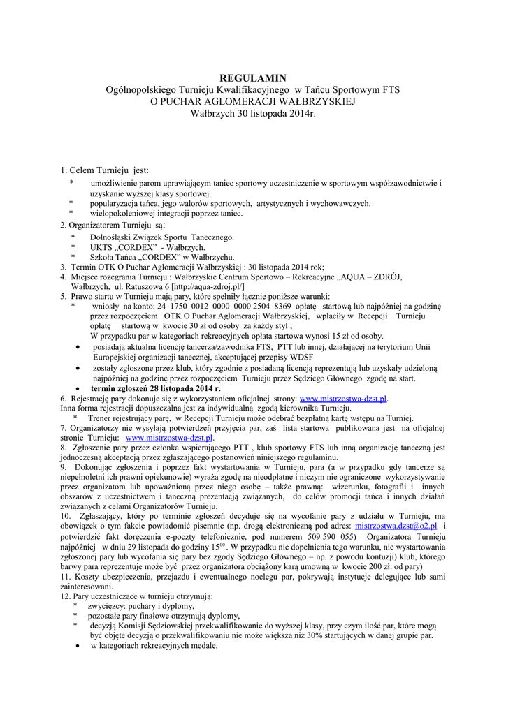REGULAMIN Ogólnopolskiego Turnieju Kwalifikacyjnego w Tańcu Sportowym FTS O PUCHAR AGLOMERACJI WAŁBRZYSKIEJ Wałbrzych 30 listopada 2014r. 1. Celem Turnieju jest: * umożliwienie parom uprawiającym taniec sportowy uczestniczenie w sportowym współzawodnictwie i uzyskanie wyższej klasy sportowej. * popularyzacja tańca, jego walorów sportowych, artystycznych i wychowawczych. * wielopokoleniowej integracji poprzez taniec. 2. Organizatorem Turnieju są: * Dolnośląski Związek Sportu Tanecznego. * UKTS „CORDEX” - Wałbrzych. * Szkoła Tańca „CORDEX” w Wałbrzychu. 3. Termin OTK O Puchar Aglomeracji Wałbrzyskiej : 30 listopada 2014 rok; 4. Miejsce rozegrania Turnieju : Wałbrzyskie Centrum Sportowo – Rekreacyjne „AQUA – ZDRÓJ, Wałbrzych, ul. Ratuszowa 6 [http://aqua-zdroj.pl/] 5. Prawo startu w Turnieju mają pary, które spełniły łącznie poniższe warunki: * wniosły na konto: 24 1750 0012 0000 0000 2504 8369 opłatę startową lub najpóźniej na godzinę przez rozpoczęciem OTK O Puchar Aglomeracji Wałbrzyskiej, wpłaciły w Recepcji Turnieju opłatę startową w kwocie 30 zł od osoby za każdy styl ; W przypadku par w kategoriach rekreacyjnych opłata startowa wynosi 15 zł od osoby. posiadają aktualna licencję tancerza/zawodnika FTS, PTT lub innej, działającej na terytorium Unii Europejskiej organizacji tanecznej, akceptującej przepisy WDSF zostały zgłoszone przez klub, który zgodnie z posiadaną licencją reprezentują lub uzyskały udzieloną najpóźniej na godzinę przez rozpoczęciem Turnieju przez Sędziego Głównego zgodę na start. termin zgłoszeń 28 listopada 2014 r. 6. Rejestrację pary dokonuje się z wykorzystaniem oficjalnej strony: www.mistrzostwa-dzst.pl. Inna forma rejestracji dopuszczalna jest za indywidualną zgodą kierownika Turnieju. * Trener rejestrujący parę, w Recepcji Turnieju może odebrać bezpłatną kartę wstępu na Turniej. 7. Organizatorzy nie wysyłają potwierdzeń przyjęcia par, zaś lista startowa publikowana jest na oficjalnej stronie Turnieju: www.mistrzostwa-dzst.pl. 8. Zgłoszenie pary przez członka wspierającego PTT , klub sportowy FTS lub inną organizację taneczną jest jednoczesną akceptacją przez zgłaszającego postanowień niniejszego regulaminu. 9. Dokonując zgłoszenia i poprzez fakt wystartowania w Turnieju, para (a w przypadku gdy tancerze są niepełnoletni ich prawni opiekunowie) wyraża zgodę na nieodpłatne i niczym nie ograniczone wykorzystywanie przez organizatora lub upoważnioną przez niego osobę – także prawną: wizerunku, fotografii i innych obszarów z uczestnictwem i taneczną prezentacją związanych, do celów promocji tańca i innych działań związanych z celami Organizatorów Turnieju. 10. Zgłaszający, który po terminie zgłoszeń decyduje się na wycofanie pary z udziału w Turnieju, ma obowiązek o tym fakcie powiadomić pisemnie (np. drogą elektroniczną pod adres: [email protected] i potwierdzić fakt doręczenia e-poczty telefonicznie, pod numerem 509 590 055) Organizatora Turnieju najpóźniej w dniu 29 listopada do godziny 15 00 . W przypadku nie dopełnienia tego warunku, nie wystartowania zgłoszonej pary lub wycofania się pary bez zgody Sędziego Głównego – np. z powodu kontuzji) klub, którego barwy para reprezentuje może być przez organizatora obciążony karą umowną w kwocie 200 zł. od pary) 11. Koszty ubezpieczenia, przejazdu i ewentualnego noclegu par, pokrywają instytucje delegujące lub sami zainteresowani. 12. Pary uczestniczące w turnieju otrzymują: * zwycięzcy: puchary i dyplomy, * pozostałe pary finałowe otrzymują dyplomy, * decyzją Komisji Sędziowskiej przekwalifikowanie do wyższej klasy, przy czym ilość par, które mogą być objęte decyzją o przekwalifikowaniu nie może większa niż 30% startujących w danej grupie par. w kategoriach rekreacyjnych medale. 13. W trakcie OTK O Puchar Aglomeracji Wałbrzyskiej działają: * Komisja Sędziowska. * Komisja Skrutacyjna. * Kierownik Turnieju. * Punkt pomocy medycznej. * Biuro Turnieju. * Recepcja. 14. Przebieg i sędziowanie OTK O Puchar Aglomeracji Wałbrzyskiej: * turniej rozgrywany jest w poniżej opisanych blokach: > dla par grupy wiekowej 12 - 13 lat z klasy E do klasy D oraz z klasy D do klasy C; > dla par grupy wiekowej 14 – 15 lat z klasy D do klasy C oraz z klasy C do klasy B; > dla par powyżej 15 lat z klasy D do klasy C > dla par powyżej 15 lat z klasy C do klasy B * o ilości par i grup w poszczególnych rundach decyduje Sędzia Główny, * w Turnieju stosuje się zasadę przechodzenia do następnej rundy co najmniej 50% uczestniczących par do półfinału włącznie; do finału typuje się 6 par, ogłoszenie par awansujących do następnej rundy odbywa się natychmiast po obliczeniu wyników, typowania sędziów do zakończenia rundy finałowej są niejawne, w rundzie finałowej sędziowanie jest niejawne, nie stosuje się dogrywek, muzyka dla wszystkich grup jest jednakowa, we wszystkich rundach turnieju czas trwania utworów wynosi 1,5 minuty – 2 minut (WA, T, F, Q, S, CCC, R, Pd); Sędzia Główny ustala rzeczywisty w zakreślonym przedziale czasowym, czas trwania utworów w danej rundzie w podanych powyżej przedziałach, długość przerwy między rundami danej kategorii powinna wynosić co najmniej 10 minut. wymiary parkietu: min. 18 m x 12 m, w przypadku wycofania się uczestnika opłata startowa nie podlega zwrotowi, dokonanie zgłoszenia i udział w Turnieju równoznaczne są z wyrażeniem na zawsze i bezwarunkowo nieodpłatnej zgody na rejestrację fotograficzną, video i telewizyjną wszystkich prezentacji oraz ich wykorzystanie, publikację i emisję w dowolnych mediach przez Federację Tańca Sportowego, DZST oraz przez organizatorów 15. Repertuar i stroje: zgodnie z przepisami FTS, obowiązkowe ochraniacze obcasów damskiego obuwia. 16 Bilet wstępu : 30 zł , uczniowie i studenci po okazaniu legitymacji szkolnej: 15 zł ; zorganizo