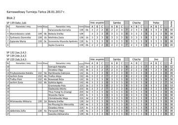 Karnawałowy Turnieju Tańca 28.01.2017 r. Blok 2 4 Marcinkiewicz Julek 5 Zychewicz Dominika 7 Gątarska Marta 8 Szkoła Klasa Nazwisko i imię Karaczewska Kornelia 139 0b Bolesta Emilka 139 1b Molińska Zosia Klasa A 139 0b 2 Szkoła 139 139 1b 3 139 0c Sosnowska-Wysocka Apolonia 139 0c Gąska Zuzanna 139 0b 3 SP 132 2ae,3,4,5 SP 139 2de,3,4,5 SP 225 2ab,3,4,5 Nr 10 12 13 14 16 17 18 19 20 21 22 23 24 25 26 27 Nazwisko i imię 3 2 B 2 3 3 C 2 3 3 3 2 3 2 6 9 9 A 2 3 3 B 2 3 3 C 3 3 3 9 6 3 2 3 2 3 3 Szkoła Klasa Przybyszewska Natalia Jochim Zosia Trafisz Piotr Jochim Zosia 132 132 132 132 5b 4b 4b 4b Wiśniewska Wiktoria 139 2d Jabłońska Zofia 139 4a Nazwisko i imię Szenajch Natalka Dziadosz Olga Rychlewska Gabrysia Trafisz Alicja Nowosad Róża Galicka Agata Graniewska Pola Śladewska Marta Thuy Trang Vu (Czang) Wysocka Hania Chmielewska Maja Bolesta Emilka Ha Phuong Do Weronika Osiadacz Anna Parzyszek Maja Sawicka Aleksandra Szkoła 132 132 132 132 132 132 225 225 225 225 225 139 139 225 139 139 Klasa A 2e 2 3b 2 3b 3 4b 3 3b 3 4b 3 2b 2 3b 2 3d 3 3c 3 3d 2 2d 3 4a 3 3c 3 4a 3 3b 3 B 3 3 3 2 3 3 3 3 3 3 3 3 3 3 3 3 C 2 2 3 2 3 3 3 2 3 3 2 3 3 3 3 3 7 9 9 A 2 3 3 B 3 3 3 C 3 3 3 9 7 3 2 3 3 3 3 Samba Walc angielski 7 7 9 7 9 9 8 7 9 9 7 9 9 9 9 9 A 3 2 3 2 3 3 2 2 3 3 3 3 3 3 3 3 B 3 3 3 2 3 3 3 3 3 3 3 3 3 3 3 3 Polka 8 9 9 A 3 3 3 B 3 3 3 C 3 3 3 9 9 9 30 36 36 9 8 3 3 3 3 3 3 9 9 36 30 C 3 3 3 2 3 2 2 3 3 3 3 3 3 3 3 3 9 6 9 6 9 7 8 9 9 9 9 9 9 9 9 9 Chacha C 3 2 3 2 3 3 3 3 3 3 3 3 3 3 3 3 9 7 9 6 9 9 8 8 9 9 9 9 9 9 9 9 A 2 2 3 2 3 3 3 2 3 3 3 3 3 3 3 3 B 2 2 3 2 3 3 3 2 3 3 3 3 3 3 3 3 Suma Nazwisko i imię Chacha Jive C 3 2 3 2 3 3 3 2 3 3 3 3 3 3 3 3 7 6 9 6 9 9 9 6 9 9 9 9 9 9 9 9 A 3 1 3 2 3 2 3 3 3 3 3 3 3 3 3 3 B 3 2 3 2 3 3 3 3 3 3 3 3 3 3 3 3 Suma Nr 1 Samba Walc angielski SP 139 0abc,1ab 32 26 36 25 36 34 33 30 36 36 34 36 36 36 36 36