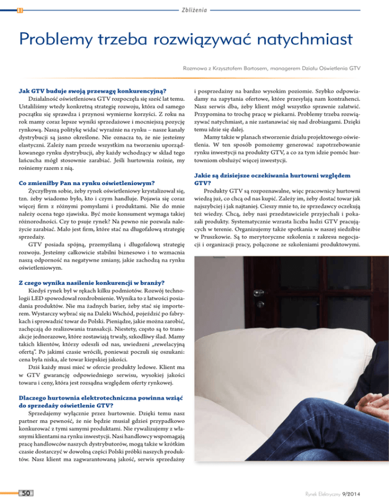 Zbliżenia Problemy trzeba rozwiązywać natychmiast Rozmowa z Krzysztofem Bartosem, managerem Działu Oświetlenia GTV Jak GTV buduje swoją przewagę konkurencyjną? Działalność oświetleniowa GTV rozpoczęła się sześć lat temu. Ustaliliśmy wtedy konkretną strategię rozwoju, która od samego początku się sprawdza i przynosi wymierne korzyści. Z roku na rok mamy coraz lepsze wyniki sprzedażowe i mocniejszą pozycję rynkową. Naszą politykę widać wyraźnie na rynku – nasze kanały dystrybucji są jasno określone. Nie oznacza to, że nie jesteśmy elastyczni. Zależy nam przede wszystkim na tworzeniu uporządkowanego rynku dystrybucji, aby każdy wchodzący w skład tego łańcucha mógł stosownie zarabiać. Jeśli hurtownia rośnie, my rośniemy razem z nią. Co zmieniłby Pan na rynku oświetleniowym? Życzyłbym sobie, żeby rynek oświetleniowy krystalizował się, tzn. żeby wiadomo było, kto i czym handluje. Pojawia się coraz więcej firm z różnymi pomysłami i produktami. Nie do mnie należy ocena tego zjawiska. Być może konsument wymaga takiej różnorodności. Czy to psuje rynek? Na pewno nie pozwala należycie zarabiać. Mało jest firm, które stać na długofalową strategię sprzedaży. GTV posiada spójną, przemyślaną i długofalową strategię rozwoju. Jesteśmy całkowicie stabilni biznesowo i to wzmacnia naszą odporność na negatywne zmiany, jakie zachodzą na rynku oświetleniowym. i posprzedażny na bardzo wysokim poziomie. Szybko odpowiadamy na zapytania ofertowe, które przesyłają nam kontrahenci. Nasz serwis dba, żeby klient mógł wszystko sprawnie załatwić. Przypomina to trochę pracę w piekarni. Problemy trzeba rozwiązywać natychmiast, a nie zastanawiać się nad drobiazgami. Dzięki temu idzie się dalej. Mamy także w planach stworzenie działu projektowego oświetlenia. W ten sposób pomożemy generować zapotrzebowanie rynku inwestycji na produkty GTV, a co za tym idzie pomóc hurtowniom obsłużyć więcej inwestycji. Jakie są dzisiejsze oczekiwania hurtowni względem GTV? Produkty GTV są rozpoznawalne, więc pracownicy hurtowni wiedzą już, co chcą od nas kupić. Zależy im, żeby dostać towar jak najszybciej i jak najtaniej. Cieszy mnie to, że sprzedawcy oczekują też wiedzy. Chcą, żeby nasi przedstawiciele przyjechali i pokazali produkty. Systematycznie wzrasta liczba ludzi GTV pracujących w terenie. Organizujemy także spotkania w naszej siedzibie w Pruszkowie. Są to merytoryczne szkolenia z zakresu negocjacji i organizacji pracy, połączone ze szkoleniami produktowymi. Z czego wynika nasilenie konkurencji w branży? Kiedyś rynek był w rękach kilku podmiotów. Rozwój technologii LED spowodował rozdrobnienie. Wynika to z łatwości posiadania produktów. Nie ma żadnych barier, żeby stać się importerem. Wystarczy wybrać się na Daleki Wschód, pojeździć po fabrykach i sprowadzić towar do Polski. Pieniądze, jakie można zarobić, zachęcają do realizowania transakcji. Niestety, często są to transakcje jednorazowe, które zostawiają trwały, szkodliwy ślad. Mamy takich klientów, którzy odeszli od nas, uwiedzeni „rewelacyjną ofertą”. Po jakimś czasie wrócili, ponieważ poczuli się oszukani: cena była niska, ale towar kiepskiej jakości. Dziś każdy musi mieć w ofercie produkty ledowe. Klient ma w GTV gwarancję odpowiedniego serwisu, wysokiej jakości towaru i ceny, która jest rozsądna względem oferty rynkowej. Dlaczego hurtownia elektrotechniczna powinna wziąć do sprzedaży oświetlenie GTV? Sprzedajemy wyłącznie przez hurtownie. Dzięki temu nasz partner ma pewność, że nie będzie musiał gdzieś przypadkowo konkurować z tymi samymi produktami. Nie rywalizujemy z własnymi klientami na rynku inwestycji. Nasi handlowcy wspomagają pracę handlowców naszych dystrybutorów, mogą także w krótkim czasie dostarczyć w dowolną części Polski próbki naszych produktów. Nasz klient ma zagwarantowaną jakość, serwis sprzedażny 50 Rynek Elektryczny 9/2014 Zbliżenia Wspomagamy w ten sposób naszych klientów, mamy ogromny wkład w uświadamianie rynku o dobrych i złych wyborach sprzętu oświetleniowego. Przyznam, że mamy bardzo pozytywny feedback z rynku o naszej działalności szkoleniowej. Jak GTV zbiera doświadczenia na rynku? Podkreślam pracownikom: jeśli jest źle, trzeba wiedzieć dlaczego. Jeśli jest dobrze, też trzeba wiedzieć dlaczego. Można się cieszyć z każdego przyrostu, ale trzeba być także na niego przygotowanym. Tylko przypadek sprawia, że obroty wymykają się spod kontroli i są nieprzewidywalnie wysokie. Wtedy należy przypuszczać, że np. konkurencja popełniła błąd albo nieoczekiwanie poprawiły się warunki makroekonomiczne. Nikt nie poradzi sobie ze zmianami, na które nie jest przygotowany. Trzeba mieć cały czas kontakt z tym, co się dzieje na rynku. Ja też jestem konsumentem, bacznym obserwatorem. Wiem, czego rynek może potrzebować. GTV szuka najlepszych rozwiązań, a to oznacza między innymi stworzenie poczucia maksymalnego komfortu dla użytkowników naszych produktów. Czy nie brakuje Panu relacji z końcowymi użytkownikami? Faktycznie nie mamy bezpośrednich relacji z projektantami czy końcowymi użytkownikami. Jednak pozycja GTV pozwala już na kreowanie trendów na rynku, sugerowania klientom rozwiązań, jakie mogą zastosować. Robimy to między innymi za pomocą reklam naszych produktów oświetleniowych, które są zamieszczane w kilkunastu tytułach prasowych. Bierzemy także udział w setkach spotkań szkoleniowych, jakie przeprowadzamy wspólnie z naszymi dystrybutorami. Dzięki temu produkty GTV są dobrze oceniane, samoistnie pojawiają się też w projektach. Jaka jest perspektywa rozwoju biznesu GTV? Nasz sposób pracy na rynku jest jasno określony. Poprzez rzetelność, szerokość oferty oraz kompetentny zespół sprzedażowy będziemy starali się poszerzać nasz udział w rynku. W tym mome