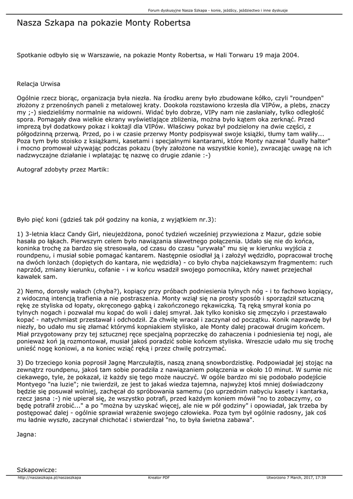 Forum dyskusyjne Nasza Szkapa - konie, jeźdźcy, jeździectwo i inne dyskusje Nasza Szkapa na pokazie Monty Robertsa Spotkanie odbyło się w Warszawie, na pokazie Monty Robertsa, w Hali Torwaru 19 maja 2004. Relacja Urwisa Ogólnie rzecz biorąc, organizacja była niezła. Na środku areny było zbudowane kółko, czyli "roundpen" złożony z przenośnych paneli z metalowej kraty. Dookoła rozstawiono krzesła dla VIPów, a plebs, znaczy my ;-) siedzieliśmy normalnie na widowni. Widać było dobrze, VIPy nam nie zasłaniały, tylko odległość spora. Pomagały dwa wielkie ekrany wyświetlające zbliżenia, można było kątem oka zerknąć. Przed imprezą był dodatkowy pokaz i koktajl dla VIPów. Właściwy pokaz był podzielony na dwie części, z półgodzinną przerwą. Przed, po i w czasie przerwy Monty podpisywał swoje książki, tłumy tam waliły... Poza tym było stoisko z książkami, kasetami i specjalnymi kantarami, które Monty nazwał "dually halter" i mocno promował używając podczas pokazu (były założone na wszystkie konie), zwracając uwagę na ich nadzwyczajne działanie i wplatając tę nazwę co drugie zdanie :-) Autograf zdobyty przez Martik: Było pięć koni (gdzieś tak pół godziny na konia, z wyjątkiem nr.3): 1) 3-letnia klacz Candy Girl, nieujeżdżona, ponoć tydzień wcześniej przywieziona z Mazur, gdzie sobie hasała po łąkach. Pierwszym celem było nawiązania sławetnego połączenia. Udało się nie do końca, koninka trochę za bardzo się stresowała, od czasu do czasu "urywała" mu się w kierunku wyjścia z roundpenu, i musiał sobie pomagać kantarem. Następnie osiodłał ją i założył wędzidło, popracował trochę na dwóch lonżach (dopiętych do kantara, nie wędzidła) - co było chyba najciekawszym fragmentem: ruch naprzód, zmiany kierunku, cofanie - i w końcu wsadził swojego pomocnika, który nawet przejechał kawałek sam. 2) Nemo, dorosły wałach (chyba?), kopiący przy próbach podniesienia tylnych nóg - i to fachowo kopiący, z widoczną intencją trafienia a nie postraszenia. Monty wziął się na prosty sposób i sporządził sztuczną rękę ze styliska od łopaty, okręconego gąbką i zakończonego rękawiczką. Tą ręką smyrał konia po tylnych nogach i pozwalał mu kopać do woli i dalej smyrał. Jak tylko konisko się zmęczyło i przestawało kopać - natychmiast przestawał i odchodził. Za chwilę wracał i zaczynał od początku. Konik naprawdę był niezły, bo udało mu się złamać którymś kopniakiem stylisko, ale Monty dalej pracował drugim końcem. Miał przygotowany przy tej sztucznej ręce specjalną poprzeczkę do zahaczenia i podniesienia tej nogi, ale ponieważ koń ją rozmontował, musiał jakoś poradzić sobie końcem styliska. Wreszcie udało mu się trochę unieść nogę koniowi, a na koniec wziąć ręką i przez chwilę potrzymać. 3) Do trzeciego konia poprosił Jagnę Marczułajtis, naszą znaną snowbordzistkę. Podpowiadał jej stojąc na zewnątrz roundpenu, jakoś tam sobie poradziła z nawiązaniem połączenia w około 10 minut. W sumie nic ciekawego, tyle, że pokazał, iż każdy się tego może nauczyć. W ogóle bardzo mi się podobało podejście Montyego "na luzie"; nie twierdził, ze jest to jakaś wiedza tajemna, najwyżej ktoś mniej doświadczony będzie się posuwał wolniej, zachęcał do spróbowania samemu (po uprzednim nabyciu kasety i kantarka, rzecz jasna :-) nie upierał się, że wszystko potrafi, przed każdym koniem mówił "no to zobaczymy, co będę potrafił zrobić..." a po "można by uzyskać więcej, ale nie w pół godziny" i opowiadał, jak trzeba by postępować dalej - ogólnie sprawiał wrażenie swojego człowieka. Poza tym był ogólnie radosny, jak coś mu ładnie wyszło, zaczynał chichotać i stwierdzał "no, to była świetna zabawa". Jagna: Szkapowicze: http://naszaszkapa.pl/naszaszkapa Kreator PDF Utworzono 7 March, 2017, 17:39 Forum dyskusyjne Nasza Szkapa - konie, jeźdźcy, jeździectwo i inne dyskusje Po przerwie: 4) Dalia, dorosła klacz, którą miał przyzwyczaić do foliowych torebek. Dla mnie najmniej ciekawa część pokazu. Najpierw połączenie, a potem głaskanie konia kijem z przywiązanymi torebkami - najpierw końcem bez folii, potem końcem z przytwierdzoną jedną, dwiema i wreszcie kilkoma torebkami. Szybko doszedł do machania tymi torebkami wokół stojącego konia. W sumie nic fascynującego, poza rzeczywiście imponującą szybkością, z jaką posuwał się do coraz "straszniejszych" ćwiczeń. 5) Zdecydowanie najbardziej imponujący pokaz. Klacz, która za młodu została brutalnie załadowana do przyczepki i od tego czasu nie pozwalała się ładować (ponoć właścicielka przytupała z nią 50km na piechotę, poprzedniej nocy policja zamknęła na chwilę jeden z mostów na Wiśle, żeby mogła ją przeprowadzić :-) Niestety, Monty nie pokazał (jak to robił przed innymi pokazami) jak się zwierzak zachowuje przed jego zabiegami. Próbował zacząć od połączenia, nie wyszło mu za bardzo, bo zwierzątko ustawiało się tylem i kopało, wziął ją na ten swój kantar i zaczął ćwiczyć wahadłowo przód-tył. Jak to już mu szło, ustawili przyczepę w wejściu do roundpenu, z wyjętym przedzielnikiem. I dalej to już było pięknie i prosto. Monty podprowadzał ją metodą "3 kroki w przód, 2 w tył". Prosił ją, żeby ruszyła do przodu i tuż przed momentem, kiedy chciała zaprotestować, sam ją zatrzymywał i cofał - tak, jakby chciał pokazać, że jemu wcale nie zależy, żeby ona tam weszła. Najdłużej zabawili na klapie - znowu prosił ją do przodu, tupała kopytem w trap i zanim zdążyła się spłoszyć tym dźwiękiem znowu kazał jej się cofać i tak w kółko. W pewnym momencie po prostu zamiast jeszcze raz ją cofać, ruszył energicznie do przodu i weszła. Ponieważ w przyczepce nie było przegrody, obrócił się z koniem i wyszedł. Potem wprowadzał ja jeszcze parę ra