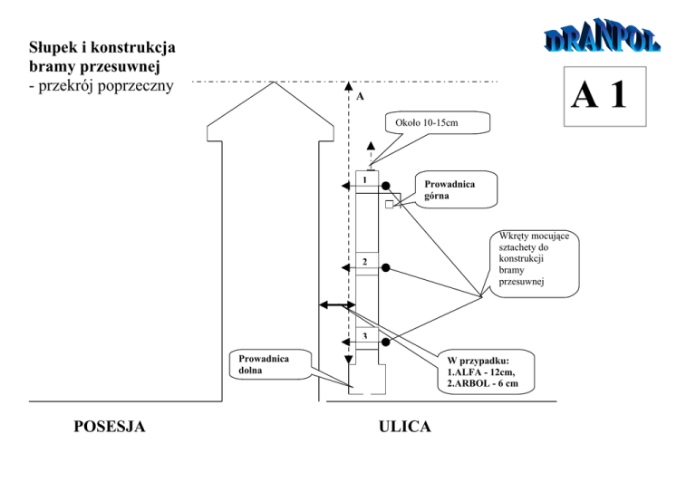 Słupek i konstrukcja bramy przesuwnej - przekrój poprzeczny A1 A Około 10-15cm 1 Prowadnica górna Wkręty mocujące sztachety do konstrukcji bramy przesuwnej 2 3 Prowadnica dolna POSESJA W przypadku: 1.ALFA - 12cm, 2.ARBOL - 6 cm ULICA
