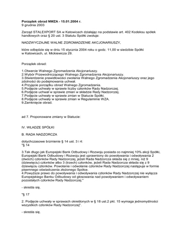 Porządek obrad NWZA - 15.01.2004 r. 9 grudnia 2003 Zarząd STALEXPORT SA w Katowicach działając na podstawie art. 402 Kodeksu spółek handlowych oraz § 20 ust. 3 Statutu Spółki zwołuje: NADZWYCZAJNE WALNE ZGROMADZENIE AKCJONARIUSZY, które odbędzie się w dniu 15 stycznia 2004 roku o godz. 11,00 w siedzibie Spółki w Katowicach, ul. Mickiewicza 29. Porządek obrad: 1.Otwarcie Walnego Zgromadzenia Akcjonariuszy. 2.Wybór Przewodniczącego Walnego Zgromadzenia Akcjonariuszy. 3.Stwierdzenie prawidłowości zwołania Walnego Zgromadzenia Akcjonariuszy oraz jego zdolności do podejmowania uchwał. 4.Przyjęcie porządku obrad Walnego Zgromadzenia. 5.Podjęcie uchwały w sprawie liczby członków Rady Nadzorczej. 6.Podjęcie uchwał w sprawie zmian w składzie Rady Nadzorczej. 7.Podjęcie uchwały w sprawie zmian w Statucie Spółki. 8.Podjęcie uchwały w sprawie zmian w Regulaminie WZA. 9.Zamknięcie obrad. ad 7. Proponowane zmiany w Statucie: IV. WŁADZE SPÓŁKI B. RADA NADZORCZA dotychczasowe brzmienie § 14 ust. 3 i 4: "§ 14 3.Tak długo jak Europejski Bank Odbudowy i Rozwoju posiada co najmniej 10% akcji Spółki, Europejski Bank Odbudowy i Rozwoju jest uprawniony do powoływania i odwoływania 2 (dwóch) członków Rady Nadzorczej, jeżeli Rada Nadzorcza składa się z mniej, niż 9 (dziewięciu) członków albo 3 (trzech) członków, jeżeli Rada Nadzorcza składa się z 9 dziewięciu członków. Powołanie i odwołanie członków Rady Nadzorczej następuje w formie pisemnego oświadczenia złożonego Spółce. 4.Powyższe prawo do powoływania i odwoływania członków Rady Nadzorczej nie wyłącza Europejskiego Banku Odbudowy od głosowania nad powoływaniem i odwoływaniem pozostałych członków Rady Nadzorczej." - skreśla się. "§ 17 2. Podjęcie uchwały w sprawach określonych w § 18 ust.2 pkt. 15 wymaga jednomyślności wszystkich członków Rady Nadzorczej". - skreśla się. C. WALNE ZGROMADZENIE dotychczasowe brzmienie § 24 ust. 2: "§ 24 2. Tak długo jak Europejski Bank Odbudowy i Rozwoju posiada co najmniej 10% akcji Spółki, podjęcie uchwał w sprawach określonych w punktach (5), (7), (9) ustępu 1, wymaga głosowania za ich przyjęciem przez Europejski Bank Odbudowy i Rozwoju." - skreśla się. Sprawy organizacyjno - prawne: 1. Zgodnie z art. 406 § 3 Kodeksu spółek handlowych i art. 11 ust. 1 ustawy z dnia 21.08.1997 r. Prawo o publicznym obrocie papierami wartościowymi (Dz.U. nr 118 z 1997 r., poz. 754, z późn. zm.) - prawo uczestnictwa w Nadzwyczajnym Walnym Zgromadzeniu przysługuje właścicielom akcji, którzy w dniach od 29.12.2003 r. do 31.12.2003 oraz od 05.01.2004 do 08. 01.2004 r. włącznie, w godz. od 9,00 do 15,00 - złożą w siedzibie Spółki, świadectwa depozytowe własności akcji - ze stwierdzeniem, że świadectwa te nie zostaną wydane przed zakończeniem Walnego Zgromadzenia. Osoby uprawnione do uczestnictwa w NWZA będą mogły dokonać rejestracji i otrzymać karty do głosowania w dniu odbycia Walnego Zgromadzenia - przed salą obrad od godz. 10,00. Wymagane przez przepisy prawa dokumenty i materiały informacyjne związane z Walnym Zgromadzeniem dostępne będą w siedzibie STALEXPORT SA w przewidzianych przepisami prawa terminach. 2. Akcjonariusze mogą uczestniczyć w Walnym Zgromadzeniu oraz wykonywać prawo głosu osobiście lub przez przedstawicieli działających na podstawie pisemnego pełnomocnictwa. Przedstawiciele osób prawnych winni okazać aktualne wyciągi z rejestrów wymieniające osoby uprawnione do reprezentowania tych podmiotów. Osoba nie wymieniona w wyciągu winna legitymować się pisemnym pełnomocnictwem.
