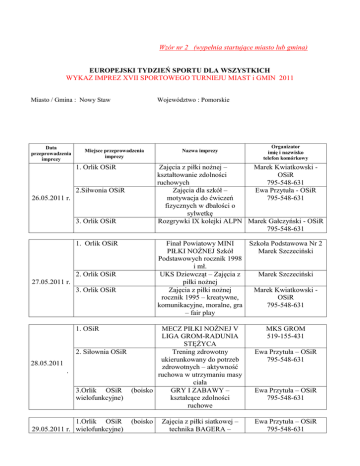 Wzór nr 2 (wypełnia startujące miasto lub gmina) EUROPEJSKI TYDZIEŃ SPORTU DLA WSZYSTKICH WYKAZ IMPREZ XVII SPORTOWEGO TURNIEJU MIAST i GMIN 2011 Województwo : Pomorskie Miasto / Gmina : Nowy Staw Data przeprowadzenia imprezy Miejsce przeprowadzenia imprezy Nazwa imprezy Zajęcia z piłki nożnej – Marek Kwiatkowski kształtowanie zdolności OSiR ruchowych 795-548-631 Zajęcia dla szkół – Ewa Przytuła - OSiR motywacja do ćwiczeń 795-548-631 fizycznych w dbałości o sylwetkę Rozgrywki IX kolejki ALPN Marek Gałczyński - OSiR 795-548-631 1. Orlik OSiR 2.Siłwonia OSiR 26.05.2011 r. 3. Orlik OSiR Finał Powiatowy MINI Szkoła Podstawowa Nr 2 PIŁKI NOŻNEJ Szkół Marek Szczeciński Podstawowych rocznik 1998 i mł. UKS Dziewcząt – Zajęcia z Marek Szczeciński piłki nożnej Zajęcia z piłki nożnej Marek Kwiatkowski rocznik 1995 – kreatywne, OSiR komunikacyjne, moralne, gra 795-548-631 – fair play 1. Orlik OSiR 2. Orlik OSiR 27.05.2011 r. 3. Orlik OSiR MECZ PIŁKI NOŻNEJ V LIGA GROM-RADUNIA STĘŻYCA 2. Siłownia OSiR Trening zdrowotny ukierunkowany do potrzeb 28.05.2011 r zdrowotnych – aktywność . ruchowa w utrzymaniu masy ciała 3.Orlik OSiR (boisko GRY I ZABAWY – wielofunkcyjne) kształcące zdolności ruchowe 1. OSiR 1.Orlik OSiR 29.05.2011 r. wielofunkcyjne) Organizator imię i nazwisko telefon komórkowy (boisko Zajęcia z piłki siatkowej – technika BAGERA – MKS GROM 519-155-431 Ewa Przytuła – OSiR 795-548-631 Ewa Przytuła – OSiR 795-548-631 Ewa Przytuła – OSiR 795-548-631 wysyłamy piłkę tam gdzie chcemy Rozgrywki tenisowe – wdrażanie gry sportowej na naszym terenie Trening obwodowy – ćwicz zdrowa 2. Orlik OSiR 3. Siłownia OSiR Mini Piłka Nożna rozgrywki 1. Orlik OSiR 30.05.2011 r. 2. Bieżnia (stadion) 3. Orlik OSiR (boisko wielofunkcyjne) Zajęcia z lekkiej atletyki przebieżki Zabawy piłką koszykową – rzuty w ruchu Marek Gałczyński - OSiR 795-548-631 Ewa Przytuła – OSiR 795-548-631 Marek Kwiatkowski OSiR 795-548-631 Marek Gałczyński - OSiR 795-548-631 Ewa Przytuła – OSiR 795-548-631 Zajęcia treningowe piłki nożnej 1. Orlik OSiR Marek Kwiatkowski OSiR 795-548-631 31.05.2011 r. 2. Orlik OSiR (boisko Mini siatkówka ½ boiska 2 Ewa Przytuła – OSiR wielofunkcyjne) na 2 – czujność na boisku 795-548-631 3. Orlik OSiR Rozgrywki X kolejki ALPN Marek Gałczyński - OSiR 795-548-631 1. Orlik OSiR wielofunkcyjne) 2. Orlik OSiR 01.06.2011 r. 3. Orlik OSiR … (boisko Gry i zabawy dla Ewa Przytuła – OSiR najmłodszych – obwód 795-548-631 stacyjny Prawidłowa współpraca w OSiR Marek zespole – kształtowanie Kwiatkowski - OSiR koordynacji, piłka nożna 795-548-631 „Zajęcia dla nie trenujących” Rozgrywki w grach Marek Gałczyński - OSiR zespołowych dla chętnych 795-548-631
