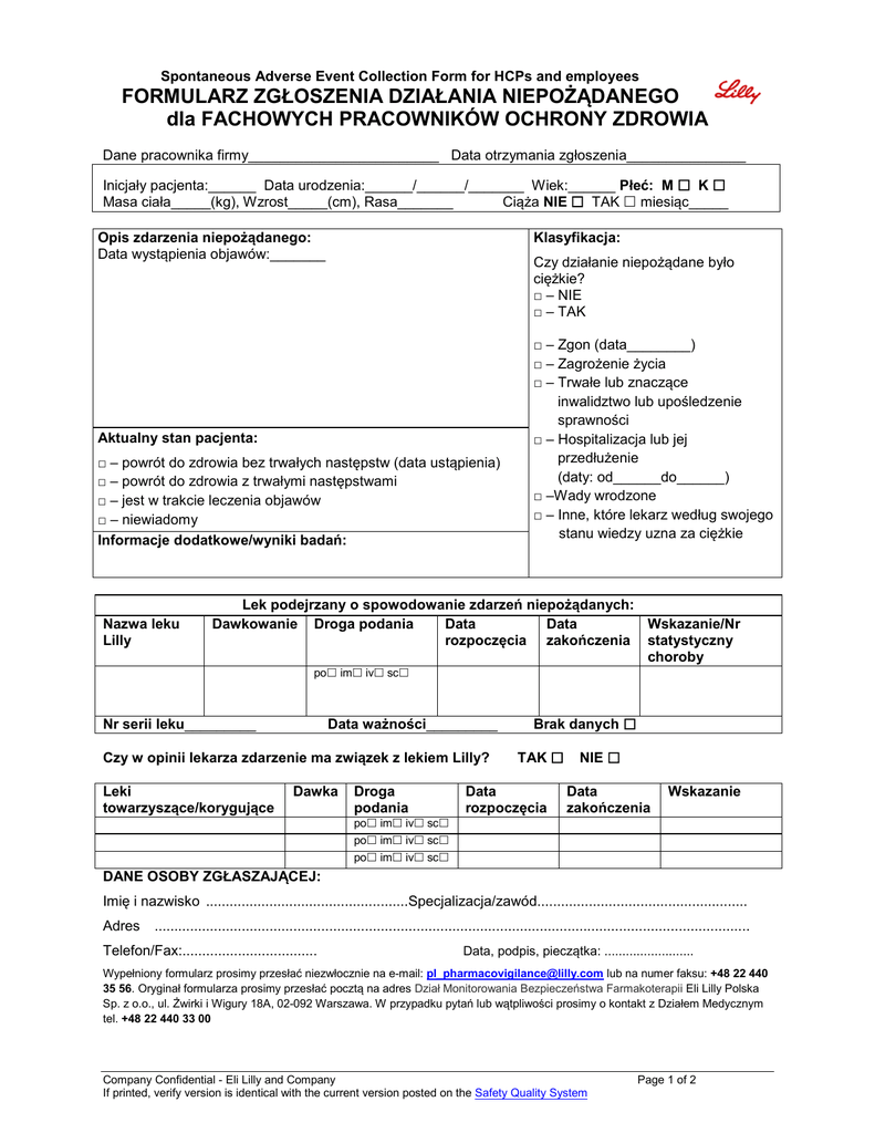 Spontaneous Adverse Event Collection Form for HCPs and employees FORMULARZ ZGŁOSZENIA DZIAŁANIA NIEPOŻĄDANEGO dla FACHOWYCH PRACOWNIKÓW OCHRONY ZDROWIA Dane pracownika firmy________________________ Data otrzymania zgłoszenia_______________ Inicjały pacjenta:______ Data urodzenia:______/______/_______ Wiek:______ Płeć: M K Masa ciała_____(kg), Wzrost_____(cm), Rasa_______ Ciąża NIE TAK miesiąc_____ Opis zdarzenia niepożądanego: Data wystąpienia objawów:_______ Klasyfikacja: Aktualny stan pacjenta: □ – Zgon (data________) □ – Zagrożenie życia □ – Trwałe lub znaczące inwalidztwo lub upośledzenie sprawności □ – Hospitalizacja lub jej przedłużenie (daty: od______do______) □ –Wady wrodzone □ – Inne, które lekarz według swojego stanu wiedzy uzna za ciężkie Czy działanie niepożądane było ciężkie? □ – NIE □ – TAK □ – powrót do zdrowia bez trwałych następstw (data ustąpienia) □ – powrót do zdrowia z trwałymi następstwami □ – jest w trakcie leczenia objawów □ – niewiadomy Informacje dodatkowe/wyniki badań: Nazwa leku Lilly Lek podejrzany o spowodowanie zdarzeń niepożądanych: Dawkowanie Droga podania Data Data Wskazanie/Nr rozpoczęcia zakończenia statystyczny choroby po im iv sc Data ważności_________ Nr serii leku_________ Czy w opinii lekarza zdarzenie ma związek z lekiem Lilly? Leki towarzyszące/korygujące Dawka Droga podania Brak danych TAK Data rozpoczęcia NIE Data zakończenia Wskazanie po im iv sc po im iv sc po im iv sc DANE OSOBY ZGŁASZAJĄCEJ: Imię i nazwisko ...................................................Specjalizacja/zawód..................................................... Adres ...................................................................................................................................................... Telefon/Fax:.................................. Data, podpis, pieczątka: ......................... Wypełniony formularz prosimy przesłać niezwłocznie na e-mail: [email protected] lub na numer faksu: +48 22 440 35 56. Oryginał formularza prosimy przesłać pocztą na adres Dział Monitorowania Bezpieczeństwa Farmakoterapii Eli Lilly Polska Sp. z o.o., ul. Żwirki i Wigury 18A, 02-092 Warszawa. W przypadku pytań lub wątpliwości prosimy o kontakt z Działem Medycznym tel. +48 22 440 33 00 Company Confidential - Eli Lilly and Company If printed, verify version is identical with the current version posted on the Safety Quality System Page 1 of 2 Uprzejmie informujemy, że podane przez Panią/Pana w zgłoszeniu działania niepożądanego dane osobowe będą przetwarzane i administrowane zgodnie z ustawą z dnia 29 sierpnia 1997 r. o ochronie danych osobowych (Dz. U. z 2002 r. Nr 101, poz. 926, ze zm.) przez firmę Eli Lilly Polska Sp. z o.o., z siedzibą w Warszawie przy ul. Żwirki i Wigury 18A. Dane te będą przetwarzane wyłącznie do celów związanych z przyjęciem zgłoszenia oraz monitorowaniem bezpieczeństwa stosowania produktów leczniczych, zgodnie z przepisami Ustawy Prawo Farmaceutyczne z dnia 6 września 2001 r. Jakiekolwiek dalsze przekazywanie informacji o działaniu niepożądanym innym podmiotom, w tym w szczególności organom administracji oraz innym podmiotom odpowiedzialnym, w celu wykonania obowiązków wynikających z przepisów prawa, następuje w formie anonimowej bez Pani/Pana danych osobowych. Przy zgłoszeniu działania niepożądanego podanie danych osobowych jest dobrowolne. Dobrowolność nie dotyczy osób wykonujących zawód medyczny, których obowiązki w zakresie zgłaszania działań niepożądanych regulują odpowiednie przepisy prawa, dotyczące zasad wykonywania zawodu. Informujemy również, że przysługuje Pani/Panu prawo dostępu do swoich danych oraz ich poprawiania. W tym celu prosimy skontaktować się z nami pod adresem: Eli Lilly Sp. z o.o., ul. Żwirki i Wigury 18 A, 02-092 Warszawa lub pod adresem e-mail: [email protected] lub pod numerem telefonu: (48) 22 440 3300. Company Confidential - Eli Lilly and Company If printed, verify version is identical with the current version posted on the Safety Quality System Page 2 of 2