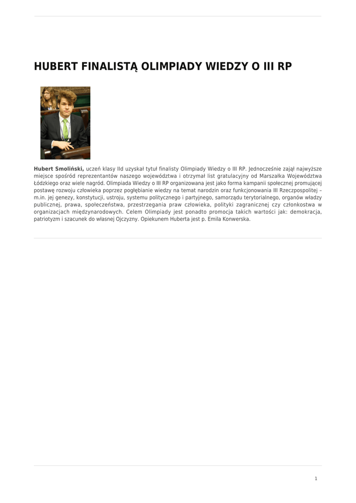 HUBERT FINALISTĄ OLIMPIADY WIEDZY O III RP Hubert Smoliński, uczeń klasy IId uzyskał tytuł finalisty Olimpiady Wiedzy o III RP. Jednocześnie zajął najwyższe miejsce spośród reprezentantów naszego województwa i otrzymał list gratulacyjny od Marszałka Województwa Łódzkiego oraz wiele nagród. Olimpiada Wiedzy o III RP organizowana jest jako forma kampanii społecznej promującej postawę rozwoju człowieka poprzez pogłębianie wiedzy na temat narodzin oraz funkcjonowania III Rzeczpospolitej – m.in. jej genezy, konstytucji, ustroju, systemu politycznego i partyjnego, samorządu terytorialnego, organów władzy publicznej, prawa, społeczeństwa, przestrzegania praw człowieka, polityki zagranicznej czy członkostwa w organizacjach międzynarodowych. Celem Olimpiady jest ponadto promocja takich wartości jak: demokracja, patriotyzm i szacunek do własnej Ojczyzny. Opiekunem Huberta jest p. Emila Konwerska. 1