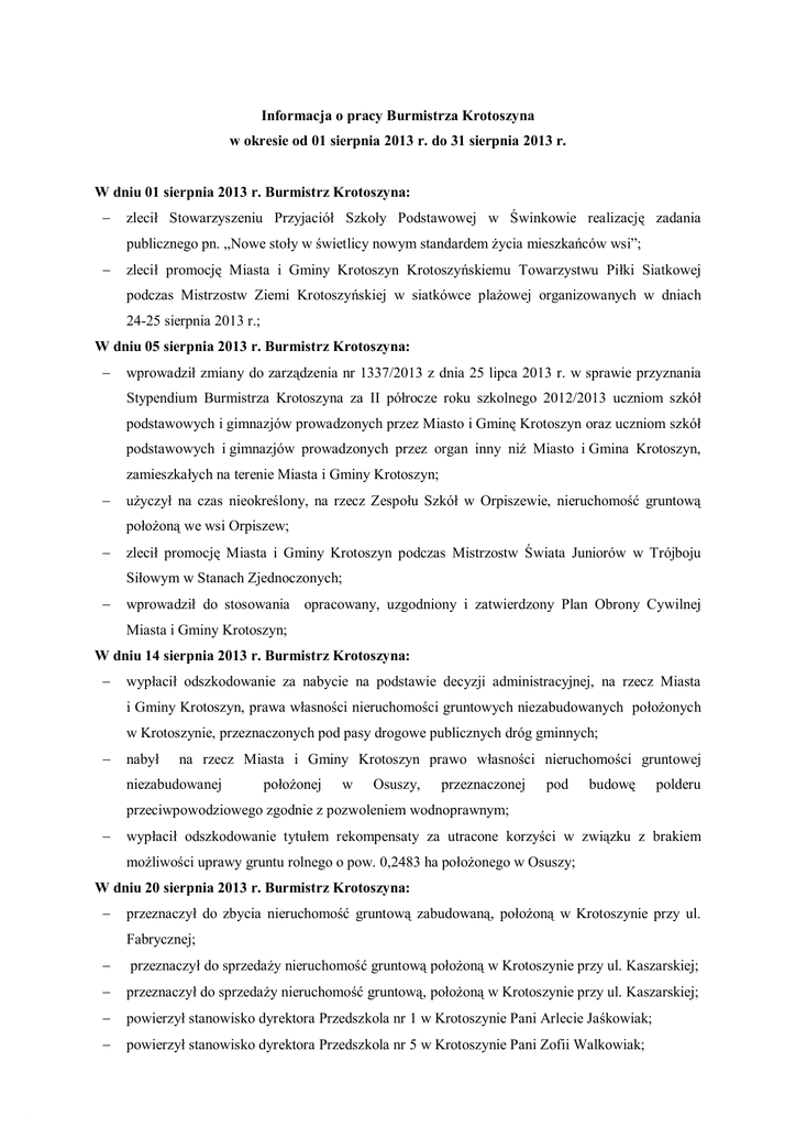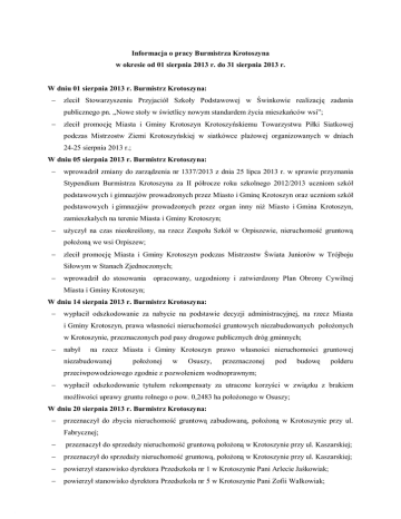 Informacja o pracy Burmistrza Krotoszyna w okresie od 01 sierpnia