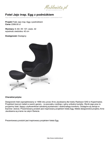 Fotel Jajo insp. Egg z podnóżkiem http://www.meblonista.pl/pl/offer/oferta/fotele/fotel-egg-insp-jacobsen-z-podnozkiem.html/ Projekt Fotel Jajo insp. Egg z podnóżkiem Cena: 2399.00 zł Wymiary: S: 83 | W: 107, siedz. 42 wysokośc siedziska: 42 cm Dostępność: Dostępny Charakterystyka: Designerski fotel zaprojektowany w 1958 roku przez Arne Jacobsena dla hotelu Radisson SAS w Kopenhadze. Projektant tworzył mebel w swoim garażu - na początku rzeźbiąc z gliny unikalne kształty. Wynik jego prac to przyjemny fotel, dający użytkownikowi odrobinę prywatności i doskonałego komfortu. Dostępne są wersje w tkaninie i skórze. Prezentowany produkt jest inspirowany projektem fotela Egg. Meble designerskie projektu Arne Jacobsena są znane na całym Świecie. Prezentowany produkt jest inspirowany projektem fotela Egg. http://www.meblonista.pl Fotel Jajo insp. Egg z podnóżkiem wykonany został z najwyższej jakości wełny. Noga wykonana jest ze stali polerowanej na wysoki połysk. Fotel Jajo insp. Egg posiada funkcje obrotową 360 stopni oraz funkcje bujania. W swojej ofercie posiadamy także Fotel Jajo insp. Egg sprzedawany bez podnóżka. http://www.meblonista.pl Dostępne wersje produktu: nazwa produktu warianty Fotel Jajo insp. Egg z kolor czerwony podnóżkiem cena 2399.00zł dostępne Dostępny Fotel Jajo insp. Egg z kolor ciemno szary podnóżkiem 2399.00zł Dostępny Fotel Jajo insp. Egg z kolor jasno szary podnóżkiem 2399.00zł Dostępny http://www.meblonista.pl Zdjęcia produktu: http://www.meblonista.pl Powered by TCPDF (www.tcpdf.org)