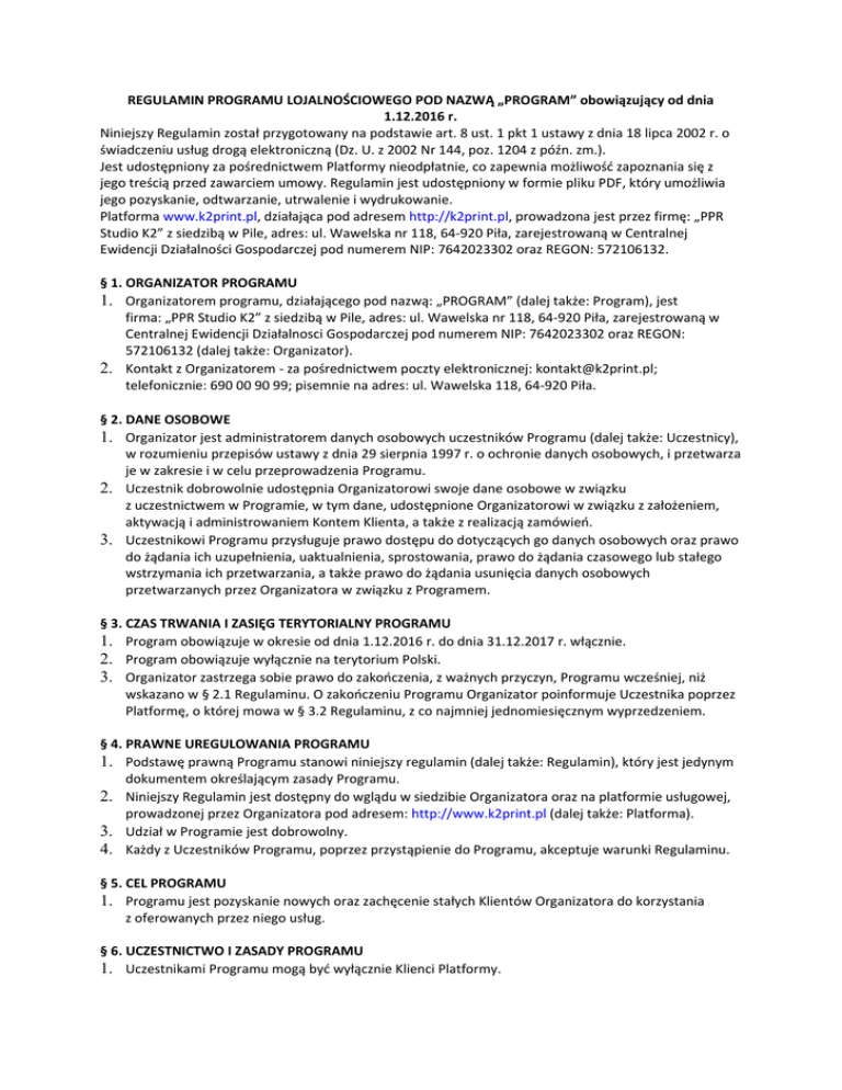 REGULAMIN PROGRAMU LOJALNOŚCIOWEGO POD NAZWĄ „PROGRAM” obowiązujący od dnia 1.12.2016 r. Niniejszy Regulamin został przygotowany na podstawie art. 8 ust. 1 pkt 1 ustawy z dnia 18 lipca 2002 r. o świadczeniu usług drogą elektroniczną (Dz. U. z 2002 Nr 144, poz. 1204 z późn. zm.). Jest udostępniony za pośrednictwem Platformy nieodpłatnie, co zapewnia możliwość zapoznania się z jego treścią przed zawarciem umowy. Regulamin jest udostępniony w formie pliku PDF, który umożliwia jego pozyskanie, odtwarzanie, utrwalenie i wydrukowanie. Platforma www.k2print.pl, działająca pod adresem http://k2print.pl, prowadzona jest przez firmę: „PPR Studio K2” z siedzibą w Pile, adres: ul. Wawelska nr 118, 64-920 Piła, zarejestrowaną w Centralnej Ewidencji Działalności Gospodarczej pod numerem NIP: 7642023302 oraz REGON: 572106132. § 1. ORGANIZATOR PROGRAMU 1. Organizatorem programu, działającego pod nazwą: „PROGRAM” (dalej także: Program), jest firma: „PPR Studio K2” z siedzibą w Pile, adres: ul. Wawelska nr 118, 64-920 Piła, zarejestrowaną w Centralnej Ewidencji Działalnosci Gospodarczej pod numerem NIP: 7642023302 oraz REGON: 572106132 (dalej także: Organizator). 2. Kontakt z Organizatorem - za pośrednictwem poczty elektronicznej: [email protected]; telefonicznie: 690 00 90 99; pisemnie na adres: ul. Wawelska 118, 64-920 Piła. § 2. DANE OSOBOWE 1. Organizator jest administratorem danych osobowych uczestników Programu (dalej także: Uczestnicy), w rozumieniu przepisów ustawy z dnia 29 sierpnia 1997 r. o ochronie danych osobowych, i przetwarza je w zakresie i w celu przeprowadzenia Programu. 2. Uczestnik dobrowolnie udostępnia Organizatorowi swoje dane osobowe w związku z uczestnictwem w Programie, w tym dane, udostępnione Organizatorowi w związku z założeniem, aktywacją i administrowaniem Kontem Klienta, a także z realizacją zamówień. 3. Uczestnikowi Programu przysługuje prawo dostępu do dotyczących go danych osobowych oraz prawo do żądania ich uzupełnienia, uaktualnienia, sprostowania, prawo do żądania czasowego lub stałego wstrzymania ich przetwarzania, a także prawo do żądania usunięcia danych osobowych przetwarzanych przez Organizatora w związku z Programem. § 3. CZAS TRWANIA I ZASIĘG TERYTORIALNY PROGRAMU 1. Program obowiązuje w okresie od dnia 1.12.2016 r. do dnia 31.12.2017 r. włącznie. 2. Program obowiązuje wyłącznie na terytorium Polski. 3. Organizator zastrzega sobie prawo do zakończenia, z ważnych przyczyn, Programu wcześniej, niż wskazano w § 2.1 Regulaminu. O zakończeniu Programu Organizator poinformuje Uczestnika poprzez Platformę, o której mowa w § 3.2 Regulaminu, z co najmniej jednomiesięcznym wyprzedzeniem. § 4. PRAWNE UREGULOWANIA PROGRAMU 1. Podstawę prawną Programu stanowi niniejszy regulamin (dalej także: Regulamin), który jest jedynym dokumentem określającym zasady Programu. 2. Niniejszy Regulamin jest dostępny do wglądu w siedzibie Organizatora oraz na platformie usługowej, prowadzonej przez Organizatora pod adresem: http://www.k2print.pl (dalej także: Platforma). 3. Udział w Programie jest dobrowolny. 4. Każdy z Uczestników Programu, poprzez przystąpienie do Programu, akceptuje warunki Regulaminu. § 5. CEL PROGRAMU 1. Programu jest pozyskanie nowych oraz zachęcenie stałych Klientów Organizatora do korzystania z oferowanych przez niego usług. § 6. UCZESTNICTWO I ZASADY PROGRAMU 1. Uczestnikami Programu mogą być wyłącznie Klienci Platformy. 2. Warunkiem wzięcia udziału w Programie jest złożenie przez Uczestnika Programu za pośrednictwem Platformy zamówienia w czasie trwania Programu oraz zaznaczenie podczas składania takiego zmówienia okna dialogowego, zawierającego oświadczenie o zamiarze przystąpienia do udziału w Programie. 3. Uczestnik ma prawo zrezygnować z udziału w Programie w każdym czasie. W tym celu powinien skierować stosowne oświadczenie w formie pisemnej na adres siedziby Organizatora albo e-mailem na adres elektronicznej skrzynki Organizatora. § 7. PUNKTY I NAGRODY 1. Za złożone w czasie trwania Programu zamówienia Uczestnik Programu otrzyma punkty w ilości przypisanej do zamawianego produktu na Platformie 2. W czasie trwania Programu Uczestnik ma możliwość otrzymania dodatkowych punktów. O zasadach przyznawania dodatkowych punktów Uczestnik zostanie poinformowany najpóźniej przed złożeniem i potwierdzeniem zamówienia na Platformie. 3. Saldo i historia punktów są rejestrowane i wyświetlane na Koncie Klienta, prowadzonym dla Uczestnika. 4. Punkty i prawa z nimi związane, uzyskiwane w ramach Programu, nie mogą być sprzedawane, przenoszone ani zbywane w inny sposób, w szczególności pomiędzy Kontami należącymi do różnych Uczestników. Nie mogą być również przedmiotem żadnych innych czynności, z wyjątkiem tych, określonych w Regulaminie. 5. Uczestnikowi nie przysługuje prawo żądania wymiany punktów na pieniądze. 6. W czasie trwania Programu, Uczestnik ma możliwość wykorzystania zebranych punktów do zamówienia i zakupu towaru lub usługi (zwanych dalej: Nagrodami) z aktualnego katalogu Nagród, udostępnionego Uczestnikowi na stronie internetowej Platformy. 7. Katalog Nagród określa liczbę punktów, która umożliwi ich wymianę na daną Nagrodę, a także cenę pozostającą do zapłaty przez Uczestnika po uwzględnieniu rabatu. 8. Z chwilą złożenia zamówienia na Nagrodę przez Uczestnika, liczba Punktów odpowiadająca zamówionej Nagrodzie, wskazana w katalogu Nagród, będzie odjęta ze stanu Konta Uczestnika, aż do wyczerpania zgromadzonych punktów. 9. Zamówienie na Nagrodę Uczestnik powinien złożyć na stronie internetowej Platformy, poprzez wybór Nagrody z udostępnionego katalogu, najpóźniej w terminie 14 dni od dnia zakończenia Programu. Informacja powinna zawierać imię i nazwisko lub firmę Uczestnika, adres do korespondencji oraz wskazanie wybranych Nagród