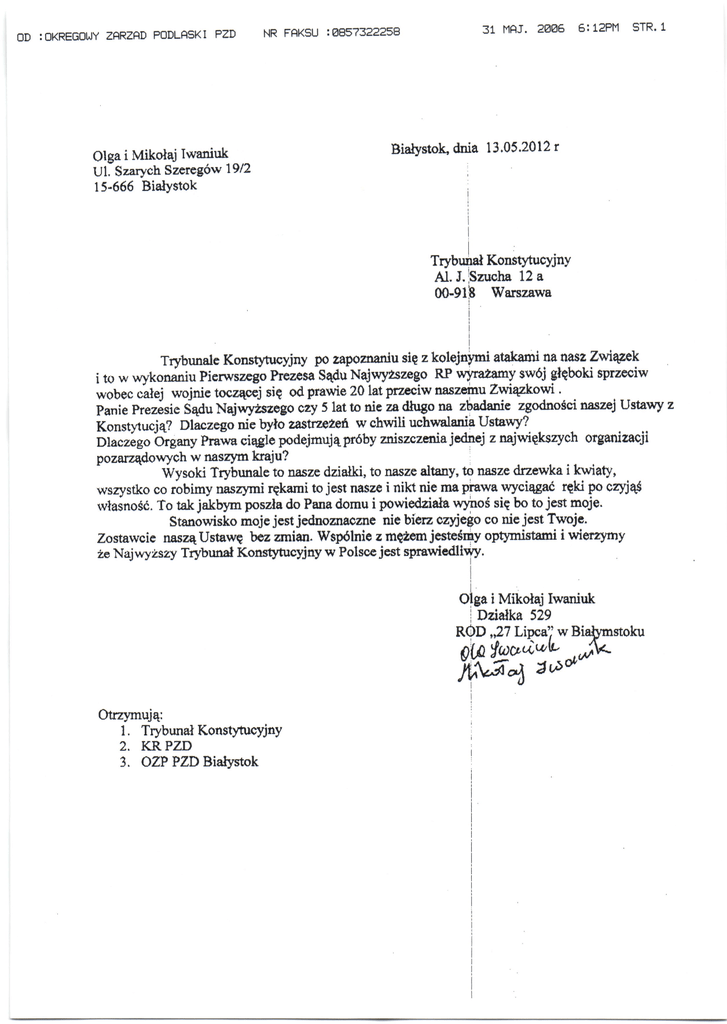 8D : OKREGOI^JY ZRRZRD PBDLRSKI PZD 31 NRJ. 2AA6 5:12PN NR FAKSU :085?322258 Olga i Mikotaj lwanitrk Ul. Szar-vch Szercg6w 19/2 l5-656 Bialystok Bialystoh dnia 13.05,2Q12 gTR' 1 t I I Trybunal KonstytucYjnY Al. J. iszuahp 12 a 0G,91$ Warszawa Trybunalc Konstytucyjny po zapoznaniu siq z kolejni'ni atakami $-nP? l*iqetl i to w wytconaniu Pierwszegb Pre-zesasgduNqiwy*szego RP wyraeany swd $eboki sprzeciw wobec catej wojnie toczqccj siq od prawie 20 lat przeciw naszcinu Zwiq.zkowi . panie prezesie Sqd" N"j"TAngo rry 5 lat to nie ia dhrgo ns 2$"4 nic z,godno$ci naszej ustawy z Konstytucj4? Dlaczego nie Uyto aastrze2ef w chwili uchwnlania Ustawy?. Uf"."lg. big*V Prava ciqgle podejmuj4pr6by zniszczenia jcdncj z n4iwiqksrych organizacji pozarzqdowych w nas4rm kraju? Wysoki Trybunate to nasze dziatki, to nasze altany, to nnsze drzewka i kwiaty, tbbi*y o*"yroi rgkami to jest nasz€ i nikt niemaprawawyci4gac rqki po cqfj4$ wszystko "o wlasno$i. To tak jakbyrn poszla do Pana domu i powiedeiala ruyno$ siE bo to.13st moje. Stanowisko moje jest jedooataozne nie bierz czyjego co nie jcst Twoje. Zostawcic naszqUstawq bez znrian. Wspdlnie z mqitem jcste$my op,qimistami i wie'rzymy te Najwy2szy fryUund Konsrytucyjny w Polscc jcst sprawi€dlin4f. I I, Ofga i Mikolaj Iwaniuk i Dzialka 529 ROD ,27 Lipca'; w Bia$mstoku q|p!,!laa*o nl,fi^lu Otrzymujq: 1. Trybunal Konstyttrcyjny 2. KR PZD 3. AZP PZD Biatystok uriv 81,;o