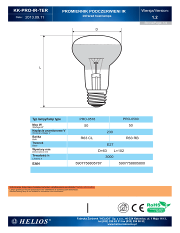 KK-PRO-IR-TER Date : Wersja/Version: PROMIENNIK PODCZERWIENI IR Infrared heat lamps 2013.09.11 1.2 Strona/Page: 1/4 D L PRO-0580 PRO-0578 Typ lampy/lamp type Moc W 50 50 Wattage W Napięcie znamionowe V 230 Nominal voltage V Bańka R63 CL Bulb R63 RB Trzonek E27 Base Wymiary mm D=63 Dimensions mm Trwałość h L=102 3000 Lifetime h EAN B22 5907758805787 5907758805800 Informacje dotyczące bezpieczeństwa użytkowania produktu/ Safety information Lampa grzewcza nie jest przeznazona do oświetlania w pomieszczeń domowych. Infrared heating lamp is not siutable for household room illumination. RoHS Compliant with Zgodny z Fabryka Żarówek ”HELIOS” Sp. z o.o., 40-224 Katowice, ul. 1 Maja 11/13, tel.(032) 258 62 21 fax (032) 259 98 52, www.helios.katowice.pl KK-PRO-IR-TER Date : PROMIENNIK PODCZERWIENI IR Wersja/Version: Infrared heat lamps 2013.09.11 1.2 Strona/Page: 2/4 D IIIIIIIIIIIIIIIIIIIIIIIIIIIIIIIIIIIIIIIIIIIIIIIIIII IIIIIIIIIIII IIIIIIIIIIII L Typ lampy/lamp type Moc W Wattage W PRO-1640 PR-0406 PRO-1523 PRO-1132 PRO-1466 PRO-1465 50 75 100 50 75 100 R80 RB R80 RB R80 RB Napięcie znamionowe V 230 Nominal voltage V Bańka Bulb R80 CL R80 CL Trzonek R80 CL B22 Base Wymiary mm L=115 D=80 Dimensions mm Trwałość h 3000 Lifetime h EAN E27 5907758816400 5907758804063 5907758815236 5907758811320 5907758814666 5907758814659 Informacje dotyczące bezpieczeństwa użytkowania produktu/ Safety information Lampa grzewcza nie jest przeznazona do oświetlania w pomieszczeń domowych. Infrared heating lamp is not siutable for household room illumination. RoHS Compliant with Zgodny z Fabryka Żarówek ”HELIOS” Sp. z o.o., 40-224 Katowice, ul. 1 Maja 11/13, tel.(032) 258 62 21 fax (032) 259 98 52, www.helios.katowice.pl KK-PRO-IR-TER Date : PROMIENNIK PODCZERWIENI IR Infrared heat lamps 2013.09.11 Wersja/Version: 1.2 Strona/Page: 3/4 D IIIIIIIIIIIIIIIIIIIIIIIIIIIIIIIIIIIIIIIIIIIIIIIIIII IIIIIIIIIIII IIIIIIIIIIII L Typ lampy/lamp type PRO-2675 Moc W 60 Napięcie znamionowe V 230 Wattage W Nominal voltage V Bańka R80 ND-MT Bulb Trzonek E27 Base Wymiary mm D=80 Dimensions mm Trwałość h L=115 3000 Lifetime h 5907758827840 EAN Informacje dotyczące bezpieczeństwa użytkowania produktu/ Safety information Lampa grzewcza nie jest przeznazona do oświetlania w pomieszczeń domowych. Infrared heating lamp is not siutable for household room illumination. RoHS Compliant with Zgodny z Fabryka Żarówek ”HELIOS” Sp. z o.o., 40-224 Katowice, ul. 1 Maja 11/13, tel.(032) 258 62 21 fax (032) 259 98 52, www.helios.katowice.pl KK-PRO-IR-TER Date : Wersja/Version: PROMIENNIK PODCZERWIENI IR Infrared heat lamps 2013.09.11 1.2 Strona/Page: 4/4 D IIIIIIIIIIIIIIIIIIIIIIIIIIIIIIIIIIIIIIIIIIIIIIIIIII IIIIIIIIIIII IIIIIIIIIIII L Typ lampy/lamp type PRO-1665 Moc W PRO-0694 150 100 Wattage W Napięcie znamionowe V 230 Nominal voltage V Bańka R95 RB Bulb R95 RB Trzonek E27 Base Wymiary mm D=95 Dimensions mm Trwałość h L=127 3000 Lifetime h EAN B22 5907758816653 5907758806944 Informacje dotyczące bezpieczeństwa użytkowania produktu/ Safety information Lampa grzewcza nie jest przeznazona do oświetlania w pomieszczeń domowych. Infrared heating lamp is not siutable for household room illumination. RoHS Compliant with Zgodny z Fabryka Żarówek ”HELIOS” Sp. z o.o., 40-224 Katowice, ul. 1 Maja 11/13, tel.(032) 258 62 21 fax (032) 259 98 52, www.helios.katowice.pl