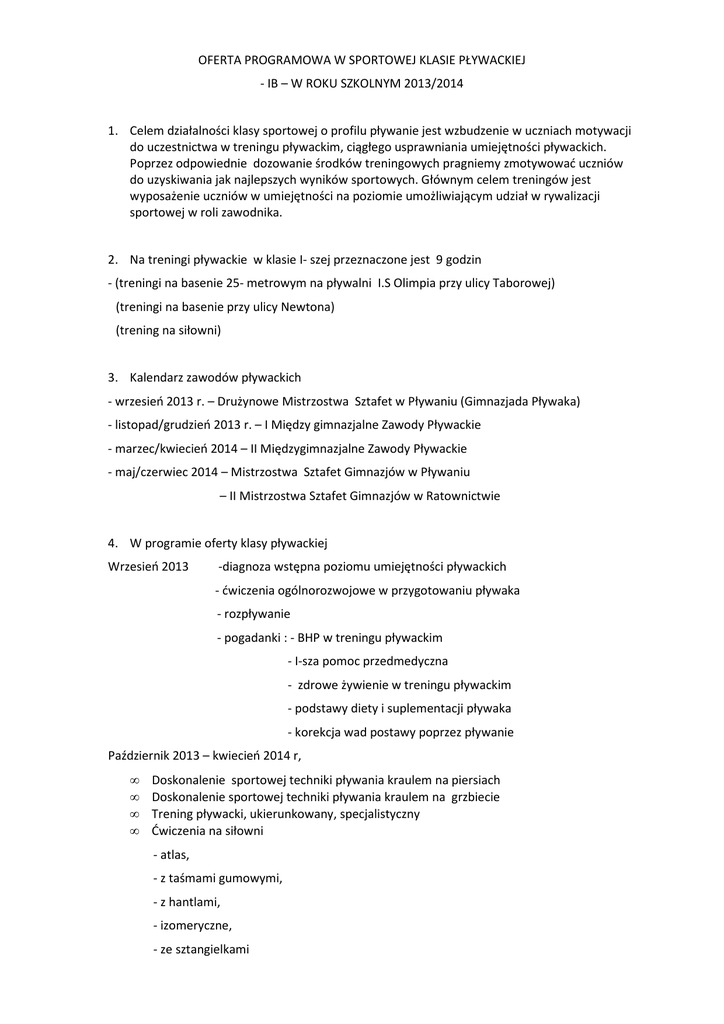 oferta programowa w sportowej klasie pływackiej 2013