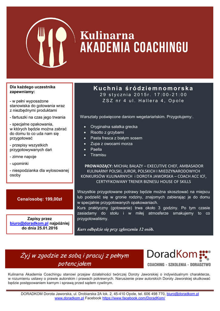 Dla każdego uczestnika zapewniamy: Kuchnia śródziemnomorska 29 stycznia 2015r. 17:00-21:00 ZSZ nr 4 ul. Hallera 4, Opole - w pełni wyposażone stanowiska do gotowania wraz z niezbędnymi produktami - fartuszki na czas jego trwania - specjalne opakowania, w których będzie można zabrać do domu to co uda nam się przygotować - przepisy wszystkich przygotowywanych dań - zimne napoje - upominki - niespodzianka dla wylosowanej osoby Cena/osobę: 199,00zł Zapisy przez [email protected] najpóźniej do dnia 25.01.2016 Warsztaty poświęcone daniom wegetariańskim. Przygotujemy:. Oryginalna sałatka grecka Risotto z grzybami Pasta fresca z białym sosem Zupa z owocami morza Paella Tiramisu .PROWADZĄCY: MICHAŁ BAŁAZY – EXECUTIVE CHEF, AMBASADOR KULINARNY POLSKI, JUROR, POLSKICH I MIEDZYNARODOWYCH KONKURSÓW KULINARNYCH i DOROTA JAWORSKA – COACH ACC ICF, CERTYFIKOWANY TRENER BIZNESU HOUSE OF SKILLS Wszystkie przygotowane potrawy będzie można skosztować na miejscu lub podzielić się w gronie rodziny, znajomych zabierając je do domu w specjalnie przygotowanych opakowaniach. Kurs praktyczny (gotowanie) trwa około 3 godziny. Po tym czasie zasiadamy do stołu i w miłej atmosferze smakujemy to co przygotowaliśmy. Kurs odbędzie się przy zgłoszeniu 12 osób. Żyj w zgodzie ze sobą i pracuj z pełnym potencjałem Kulinarna Akademia Coachingu stanowi przejaw działalności twórczej Doroty Jaworskiej o indywidualnym charakterze, w rozumieniu ustawy o prawie autorskim i prawach pokrewnych. Naruszenie praw autorskich Doroty Jaworskiej skutkować będzie postępowaniem karnym i sprawą przed sądem cywilnym. DORADKOM Dorota Jaworska, ul. Drobiarska 2A lok. 2, 45-410 Opole, tel. 606 498 770, [email protected] www.doradkom.pl Facebook https://www.facebook.com/DoradKom/