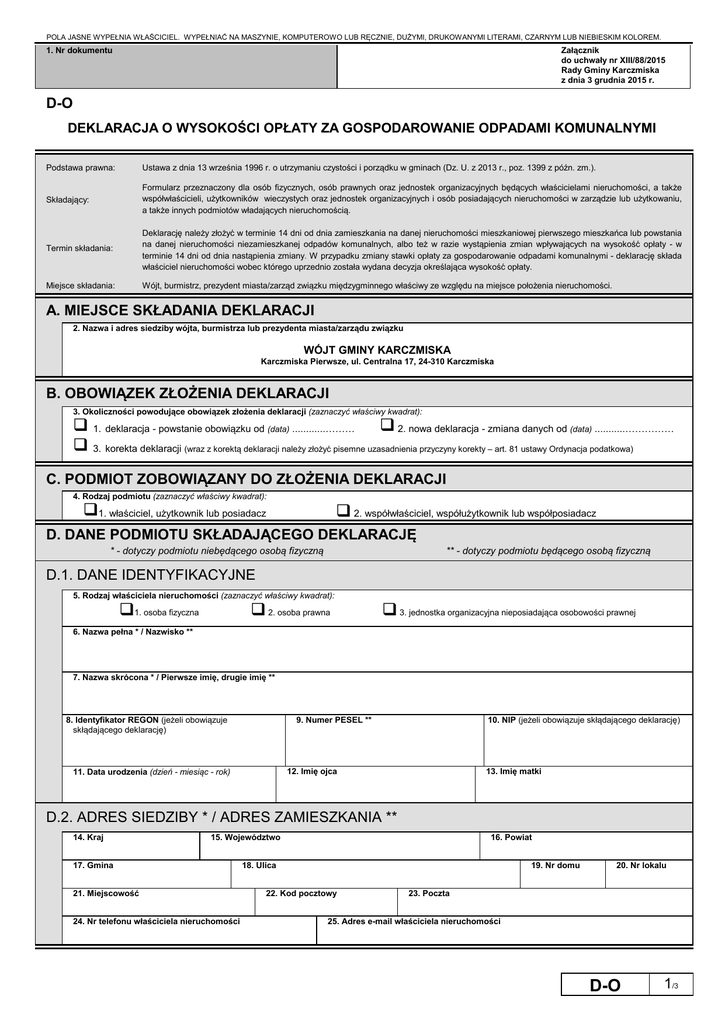 POLA JASNE WYPEŁNIA WŁAŚCICIEL. WYPEŁNIAĆ NA MASZYNIE, KOMPUTEROWO LUB RĘCZNIE, DUŻYMI, DRUKOWANYMI LITERAMI, CZARNYM LUB NIEBIESKIM KOLOREM. Załącznik do uchwały nr XIII/88/2015 Rady Gminy Karczmiska z dnia 3 grudnia 2015 r. 1. Nr dokumentu D-O DEKLARACJA O WYSOKOŚCI OPŁATY ZA GOSPODAROWANIE ODPADAMI KOMUNALNYMI Podstawa prawna: Ustawa z dnia 13 września 1996 r. o utrzymaniu czystości i porządku w gminach (Dz. U. z 2013 r., poz. 1399 z późn. zm.). Składający: Formularz przeznaczony dla osób fizycznych, osób prawnych oraz jednostek organizacyjnych będących właścicielami nieruchomości, a także współwłaścicieli, użytkowników wieczystych oraz jednostek organizacyjnych i osób posiadających nieruchomości w zarządzie lub użytkowaniu, a także innych podmiotów władających nieruchomością. Termin składania: Deklarację należy złożyć w terminie 14 dni od dnia zamieszkania na danej nieruchomości mieszkaniowej pierwszego mieszkańca lub powstania na danej nieruchomości niezamieszkanej odpadów komunalnych, albo też w razie wystąpienia zmian wpływających na wysokość opłaty - w terminie 14 dni od dnia nastąpienia zmiany. W przypadku zmiany stawki opłaty za gospodarowanie odpadami komunalnymi - deklarację składa właściciel nieruchomości wobec którego uprzednio została wydana decyzja określająca wysokość opłaty. Miejsce składania: Wójt, burmistrz, prezydent miasta/zarząd związku międzygminnego właściwy ze względu na miejsce położenia nieruchomości. A. MIEJSCE SKŁADANIA DEKLARACJI 2. Nazwa i adres siedziby wójta, burmistrza lub prezydenta miasta/zarządu związku WÓJT GMINY KARCZMISKA Karczmiska Pierwsze, ul. Centralna 17, 24-310 Karczmiska B. OBOWIĄZEK ZŁOŻENIA DEKLARACJI 3. Okoliczności powodujące obowiązek złożenia deklaracji (zaznaczyć właściwy kwadrat): 1. deklaracja - powstanie obowiązku od (data) ............……… 2. nowa deklaracja - zmiana danych od (data) ...........…………… 3. korekta deklaracji (wraz z korektą deklaracji należy złożyć pisemne uzasadnienia przyczyny korekty – art. 81 ustawy Ordynacja podatkowa) C. PODMIOT ZOBOWIĄZANY DO ZŁOŻENIA DEKLARACJI 4. Rodzaj podmiotu (zaznaczyć właściwy kwadrat): 1. właściciel, użytkownik lub posiadacz 2. współwłaściciel, współużytkownik lub współposiadacz D. DANE PODMIOTU SKŁADAJĄCEGO DEKLARACJĘ * - dotyczy podmiotu niebędącego osobą fizyczną ** - dotyczy podmiotu będącego osobą fizyczną D.1. DANE IDENTYFIKACYJNE 5. Rodzaj właściciela nieruchomości (zaznaczyć właściwy kwadrat): 1. osoba fizyczna 2. osoba prawna 3. jednostka organizacyjna nieposiadająca osobowości prawnej 6. Nazwa pełna * / Nazwisko ** 7. Nazwa skrócona * / Pierwsze imię, drugie imię ** 8. Identyfikator REGON (jeżeli obowiązuje skłądającego deklarację) 10. NIP (jeżeli obowiązuje skłądającego deklarację) 9. Numer PESEL ** 12. Imię ojca 11. Data urodzenia (dzień - miesiąc - rok) 13. Imię matki D.2. ADRES SIEDZIBY * / ADRES ZAMIESZKANIA ** 14. Kraj 15. Województwo 17. Gmina 21. Miejscowość 24. Nr telefonu właściciela nieruchomości 16. Powiat 18. Ulica 19. Nr domu 22. Kod pocztowy 20. Nr lokalu 23. Poczta 25. Adres e-mail właściciela nieruchomości D-O 1/3 POLA JASNE WYPEŁNIA WŁAŚCICIEL. WYPEŁNIAĆ NA MASZYNIE, KOMPUTEROWO LUB RĘCZNIE, DUŻYMI, DRUKOWANYMI LITERAMI, CZARNYM LUB NIEBIESKIM KOLOREM. E. DANE NIERUCHOMOŚCI, NA KTÓREJ POWSTAJĄ ODPADY KOMUNALNE E.1. POŁOŻENIE NIERUCHOMOŚCI 26. Adres E.2. TYTUŁ PRAWNY (zaznaczyć właściwy kwadrat) 27. Rodzaj własności 1. własność 2. współwłasność 29. Rodzaj użytkowania 1. użytkowanie wieczyste 2. współużytkowanie 28. Rodzaj posiadania samoistnego 1. posiadanie 30. Rodzaj posiadania zależnego 1. posiadanie 2. współposiadanie 2. współposiadanie F. OŚWIADCZENIE O DOKONYWANIU SELEKTYWNEGO ZBIERANIA ODPADÓW 31. (zaznaczyć właściwy kwadrat) Oświadczam, że dokonuję selektywnego zbierania odpadów komunalnych na ww. nieruchomości Oświadczam, że nie dokonuję selektywnego zbierania odpadów komunalnych na ww. nieruchomości G. OŚWIADCZENIA DOTYCZĄCE OPŁAT (wybrać opcję właściwą dla danej nieruchomości) 32. Oświadczam, że na terenie nieruchomości zamieszkałej, określonej w części E deklaracji, zamieszkuje ……………. osób (podać ilość osób). 33. Oświadczam, że na nieruchomości niezamieszkałej, określonej w części E deklaracji, odpady komunalne gromadzone są w ilości …………… (podać ilość pojemników) o pojemności …………… (podać pojemność pojemnika -60l, 120l, 240l, 1100l, 7000l) miesięcznie. H. ZWOLNIENIA OD OPŁATY Zwolnienia od opłaty przysługujące na podstawie aktualnej uchwały Rady Gminy Karczmiska w sprawie wprowadzenia zwolnień od opłaty za gospodarowanie odpadami komunalnymi 34. (wskazać zakres zwolnienia) 1) ............................................................................................................................................................................................................................ 2) ……………………………………………………………………………………………………………………………………………………………….......... I. ŁĄCZNA KWOTA OPŁATY (oblicza i wpisuje właściciel nieruchomości – zgodnie z treścią aktualnie obowiazującej uchwały Rady Gminy Karczmiska w sprawie wyboru metod ustalenia opłaty i ustalenia stawek opłaty za gospodarowanie odpadami komunalnymi) I.1. Kwota miesięcznej opłaty z nieruchomości zamieszkałej 35. Ilość osób zamieszkująca gospodarstwo domowe (poz. 32) x wysokość stawki opłaty podanej w obowiązującej uchwale Rady Gminy Karczmiska I.2. Kwota miesięcznej opłaty z nieruchomości niezamieszkałej ………………………… zł 36. Ilość zadeklarowanej liczby pojemników i ich pojemności (poz. 33) x wysokość st