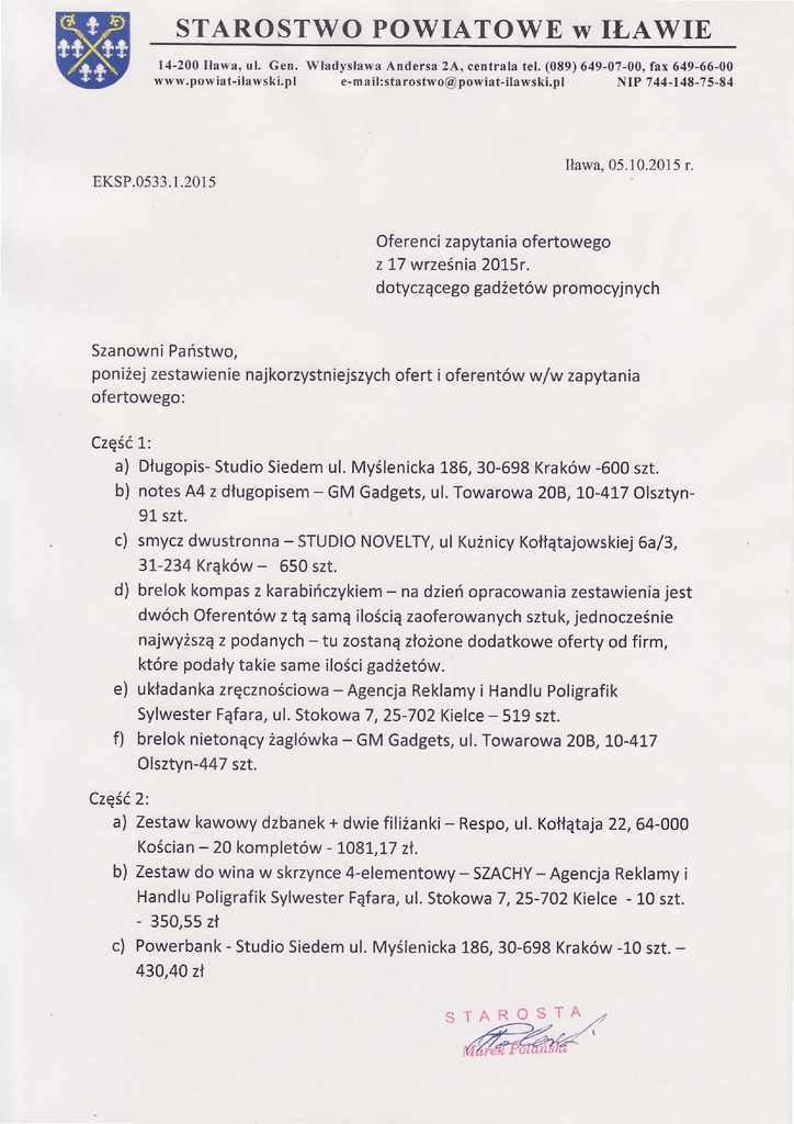 sTARoSTwo PowIATowE w IŁAWIE l4-200 I|awa' ul. Gen. W|adyslawa Andersa 2A, Ćentralatel. (089) 649-07.00,fax ó49.6ó.00 www.powiat-ilawski.pl e-mail:[email protected] NIP 744-148-75-84 Iława' r. 05.10.2015 EKSP.0533.1.2015 Oferencizapytaniaofertowego z 17 września 2015r. gadżetówpromocyjnych dotyczqcego SzanowniPaństwo, poniżejzestawienienajkorzystniejszych oferti oferentóww/w zapytania ofertowego: Część 1.: a) DtugopisStudioSiedemu|.Myś|enicka 186,30-698Kraków-600szt. - GM Gadgets,ul.Towarowa2OB,tO-4I7Olsztynb) notesA4 z dtugopisem 91 szt. c) smyczdwustronna-sTUD|o NOVELTY, u|KuŹnicyKołłqtajowskiej 6a/3, 37-234Krqków- 650szt' - na dzieńopracowania d) bre|okkompasz karabińczykiem jest zestawienia dwóch oferentówz tq samqi|ościq zaoferowanych sztuk,jednocześnie najwyższq z podanych- tu zostanqztożone dodatkoweofertyod firm, którepodatytakiesamei|ości gadżetów. -AgencjaRek|amy e) układanka zręcznościowa i HandIuPo|igrafik sy|westerFąfara,u|.Stokowa7,25-702Kielce- 519 szt' - GM Gadgets,u|.Towarowa2oB,to-477 f) bre|oknietonqcyżag|ówka Olsztyn-447 szt. Część2: - Respo,u|.Kottqtaja a) Zestawkawowydzbanek+dwiefi|iżanki 22,64-000 .7o8I,I7z|. Kościan20 komp|etów - SZACHY- AgencjaReklamyi b) Zestawdo winaw skrzynce4-elementowy Hand|uPo|igrafik Sy|wester Fqfara,ul.Stokowa7,25-702Kie|ce- 10 szt. - 350,55zt - StudioSiedemu|.Mvślenicka c) Powerbank 186'30-698Kraków-10szt 430,40zl STAROST