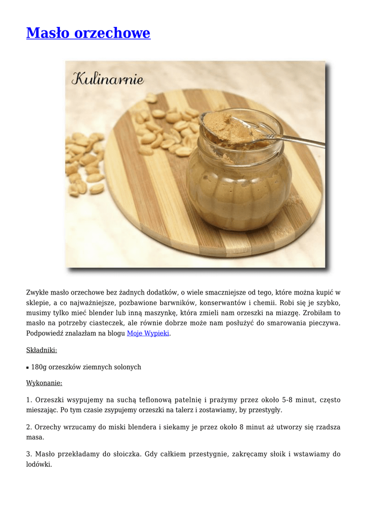 Masło orzechowe Zwykłe masło orzechowe bez żadnych dodatków, o wiele smaczniejsze od tego, które można kupić w sklepie, a co najważniejsze, pozbawione barwników, konserwantów i chemii. Robi się je szybko, musimy tylko mieć blender lub inną maszynkę, która zmieli nam orzeszki na miazgę. Zrobiłam to masło na potrzeby ciasteczek, ale równie dobrze może nam posłużyć do smarowania pieczywa. Podpowiedź znalazłam na blogu Moje Wypieki. Składniki: ■ 180g orzeszków ziemnych solonych Wykonanie: 1. Orzeszki wsypujemy na suchą teflonową patelnię i prażymy przez około 5-8 minut, często mieszając. Po tym czasie zsypujemy orzeszki na talerz i zostawiamy, by przestygły. 2. Orzechy wrzucamy do miski blendera i siekamy je przez około 8 minut aż utworzy się rzadsza masa. 3. Masło przekładamy do słoiczka. Gdy całkiem przestygnie, zakręcamy słoik i wstawiamy do lodówki.