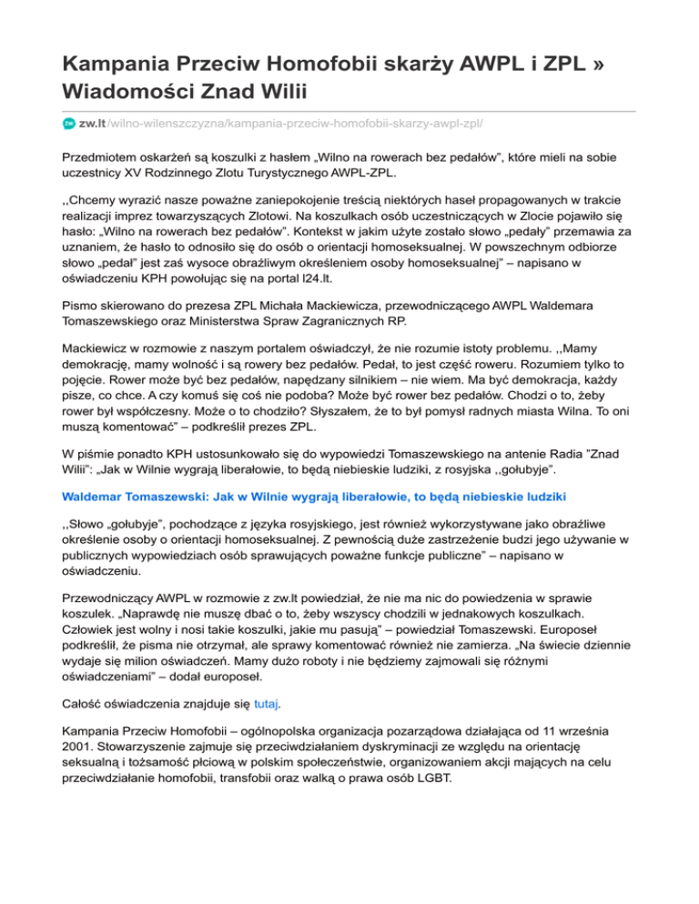 Kampania Przeciw Homofobii skarży AWPL i ZPL » Wiadomości Znad Wilii zw.lt /wilno-wilenszczyzna/kampania-przeciw-homofobii-skarzy-awpl-zpl/ Przedmiotem oskarżeń są koszulki z hasłem „Wilno na rowerach bez pedałów”, które mieli na sobie uczestnicy XV Rodzinnego Zlotu Turystycznego AWPL-ZPL. ,,Chcemy wyrazić nasze poważne zaniepokojenie treścią niektórych haseł propagowanych w trakcie realizacji imprez towarzyszących Zlotowi. Na koszulkach osób uczestniczących w Zlocie pojawiło się hasło: „Wilno na rowerach bez pedałów”. Kontekst w jakim użyte zostało słowo „pedały” przemawia za uznaniem, że hasło to odnosiło się do osób o orientacji homoseksualnej. W powszechnym odbiorze słowo „pedał” jest zaś wysoce obraźliwym określeniem osoby homoseksualnej” – napisano w oświadczeniu KPH powołując się na portal l24.lt. Pismo skierowano do prezesa ZPL Michała Mackiewicza, przewodniczącego AWPL Waldemara Tomaszewskiego oraz Ministerstwa Spraw Zagranicznych RP. Mackiewicz w rozmowie z naszym portalem oświadczył, że nie rozumie istoty problemu. ,,Mamy demokrację, mamy wolność i są rowery bez pedałów. Pedał, to jest część roweru. Rozumiem tylko to pojęcie. Rower może być bez pedałów, napędzany silnikiem – nie wiem. Ma być demokracja, każdy pisze, co chce. A czy komuś się coś nie podoba? Może być rower bez pedałów. Chodzi o to, żeby rower był współczesny. Może o to chodziło? Słyszałem, że to był pomysł radnych miasta Wilna. To oni muszą komentować” – podkreślił prezes ZPL. W piśmie ponadto KPH ustosunkowało się do wypowiedzi Tomaszewskiego na antenie Radia ”Znad Wilii”: „Jak w Wilnie wygrają liberałowie, to będą niebieskie ludziki, z rosyjska ,,gołubyje”. Waldemar Tomaszewski: Jak w Wilnie wygrają liberałowie, to będą niebieskie ludziki ,,Słowo „gołubyje”, pochodzące z języka rosyjskiego, jest również wykorzystywane jako obraźliwe określenie osoby o orientacji homoseksualnej. Z pewnością duże zastrzeżenie budzi jego używanie w publicznych wypowiedziach osób sprawujących poważne funkcje publiczne” – napisano w oświadczeniu. Przewodniczący AWPL w rozmowie z zw.lt powiedział, że nie ma nic do powiedzenia w sprawie koszulek. „Naprawdę nie muszę dbać o to, żeby wszyscy chodzili w jednakowych koszulkach. Człowiek jest wolny i nosi takie koszulki, jakie mu pasują” – powiedział Tomaszewski. Europoseł podkreślił, że pisma nie otrzymał, ale sprawy komentować również nie zamierza. „Na świecie dziennie wydaje się milion oświadczeń. Mamy dużo roboty i nie będziemy zajmowali się różnymi oświadczeniami” – dodał europoseł. Całość oświadczenia znajduje się tutaj. Kampania Przeciw Homofobii – ogólnopolska organizacja pozarządowa działająca od 11 września 2001. Stowarzyszenie zajmuje się przeciwdziałaniem dyskryminacji ze względu na orientację seksualną i tożsamość płciową w polskim społeczeństwie, organizowaniem akcji mających na celu przeciwdziałanie homofobii, transfobii oraz walką o prawa osób LGBT.