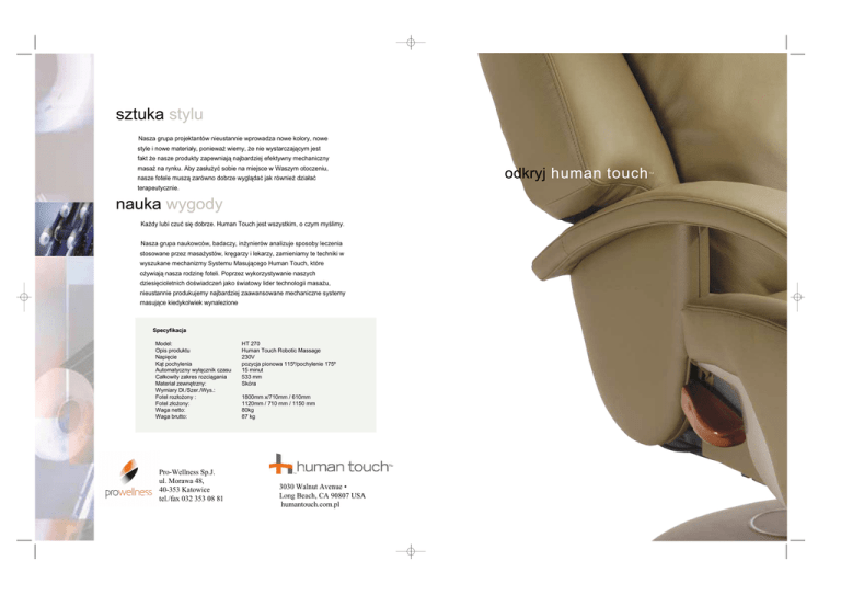 sztuka stylu Nasza grupa projektantów nieustannie wprowadza nowe kolory, nowe style i nowe materiały, ponieważ wiemy, że nie wystarczającym jest fakt że nasze produkty zapewniają najbardziej efektywny mechaniczny masaż na rynku. Aby zasłużyć sobie na miejsce w Waszym otoczeniu, nasze fotele muszą zarówno dobrze wyglądać jak również działać terapeutycznie. nauka wygody Każdy lubi czuć się dobrze. Human Touch jest wszystkim, o czym myślimy. Nasza grupa naukowców, badaczy, inżynierów analizuje sposoby leczenia stosowane przez masażystów, kręgarzy i lekarzy, zamieniamy te techniki w wyszukane mechanizmy Systemu Masującego Human Touch, które ożywiają nasza rodzinę foteli. Poprzez wykorzystywanie naszych dziesięcioletnich doświadczeń jako światowy lider technologii masażu, nieustannie produkujemy najbardziej zaawansowane mechaniczne systemy masujące kiedykolwiek wynalezione Specyfikacja Model: Opis produktu Napięcie Kąt pochylenia Automatyczny wyłącznik czasu Całkowity zakres rozciągania Materiał zewnętrzny: Wymiary Dł./Szer./Wys.: Fotel rozłożony : Fotel złożony: Waga netto: Waga brutto: Pro-Wellness Sp.J. ul. Morawa 48, 40-353 Katowice tel./fax 032 353 08 81 HT 270 Human Touch Robotic Massage 230V pozycja pionowa 115º/pochylenie 175º 15 minut 533 mm Skóra 1800mm x/710mm / 610mm 1120mm / 710 mm / 1150 mm 80kg 87 kg 3030 Walnut Avenue • Long Beach, CA 90807 USA humantouch.com.pl odkryj human touch ™ twój prywatny masażysta Wałkowanie: Ugniatanie Uciskanie Ostukiwanie Nauka komfortu • Rozciąganie całego ciała • Penetracyjny masaż karku • Programy masażu pleców • Programy masażu łydek i stóp • Masaż z różnymi prędkościami • Automatyczne składanie fotela • Komfortowe regulacje wzrostu i szerokości Pod tą luksusową skórą znajdują się „ręce” wykwalifikowanego profesjonalnego masażystygotowego zapewnić Ci dopasowany masaż pleców, nóg i stóp za naciśnięciem przycisku. Musisz to poczuć, aby uwierzyć.. Nasz wielo-patentowy System Masażu Human Touch dokładnie naśladuje terapeutyczne techniki stosowane przez profesjonalistów od kręgosłupa i pleców, który preferowany Masaż łydek Wałkowanie: Przypomina łagodne ręce masażysty, mocno naciskającego wzdłuż kręgosłupa. Likwiduje napięcie i rozluźnia mięśnie, aby przygotować plecy na intensywniejszy masaż. Ugniatanie: Przypomina kciuki mocno uciskające ruchem okrężnym po obu stronach kręgosłupa. Ten terapeutyczny ruch wnika głębiej, unosząc i rozciągając mięśnie, aby poprawić krążenie. Nowe! Ugniatanie + Ostukiwanie. W tej funkcji trzy silniczki są angażowane, aby zapewnić Ci energiczny, głęboko tkankowy masaż. Jest to najbardziej intensywny, agresywny masaż z dostępnych. Uciskanie: (wyłącznie w HTT). Przypomina ręce profesjonalnego terapeuty mocno naciskającego na przemian wzdłuż każdej strony kręgosłupa. Ten rodzaj masażu pomaga w polepszeniu poruszania się i postawy. Ostukiwanie: Przypomina pięści lub krawędzie dłoni szybko klepiących mięśnie pleców. Jest to intensywna terapia mięśni popularna medycynie sportowej. Napina stawy kręgosłupa, wyrównuje ciśnienie i ożywia całe plecy. jest przez Amerykańskie Kolegium Ortopedów Kręgarzy oraz Światową Federacje Chiropraktyków. Jest tak zaprojektowany, aby dopasować się do naturalnego konturu Twojego kręgosłupa i poruszać się trójwymiarowo w czterech różnych trybach Twój osobisty automatyczny masażysta 24/7 HT-270 robi to, co mu powiesz, od ergonomicznego podgłówka do obrotowego masażysty łydek i stóp. Dopasowujesz każdy ruch do swoich własnych preferencji. Pilot zapewnia Ci bezpośredni dostęp do trzech indywidualnych zaprogramowanych już sesji trwających 15 minut każda Odkryj szczyt mechanicznego masażu, opakowanego w stylowe, świetnej jakości obicie, który jest praktycznie bezobsługowy. Funkcje Obrotowy Rozciąganie całego ciała. wieloprędkościowy Wgłębienia na masaż łydek przytrzymują nogi, masażysta stóp i łydek. Przypominający mocny kiedy fotel przyjmuje pozycje półleżącą, aby trójwymiarowy masaż łydek i stóp wykonywany przez silne ręce Masaż łydek System Masujący HumanTouch rozpoczyna się od opatentowanego mechanizmu, który działa jak „nadgarstki i ramiona”. Dodaliśmy ‘ręce” rolki masujące, które poruszają się trójwymiarowo po konturze pleców. Efektem jest mechaniczny masaż, który niezwykle przypomina ludzki. Wałkowanie: Ugniatanie: Ugniatanie +Ostukiwanie: Uciskanie: Ostukiwanie: Regulacja: -wysokości -szerokości Ręczna regulacja góra/dół: 1 Prędkość 1 program, 2 prędkości 1 program, 2 prędkości 2 prędkości 1 program, 2 prędkości 2 opcje 3 poziomy wysokości 3 ustawienia w masażu wałkującym i ostukującym Ręczne przesuwanie rolek masujących do pożądanego miejsca w ugniataniu, uciskaniu i ostukiwaniu Zaprogramowane sesje masażu: 3 ożywiające 15 minutowe zaprogramowane sesje Oparcie: Uruchomienie pozycji półleżącej/pochylania Podnóżek: Uruchomienie rozkładania/składania 1 program, 2 prędkości Masaż łydek/stóp: Stop, auto park: Auto przywracanie: Zatrzymuje wszystkie funkcje masażu i parkuje rolki w najwyzszej pozycji Zatrzymuje wszystkie funkcje masujące i przywraca oparcie i podnóżek odpowiedni do ich pozycji wyjściowych