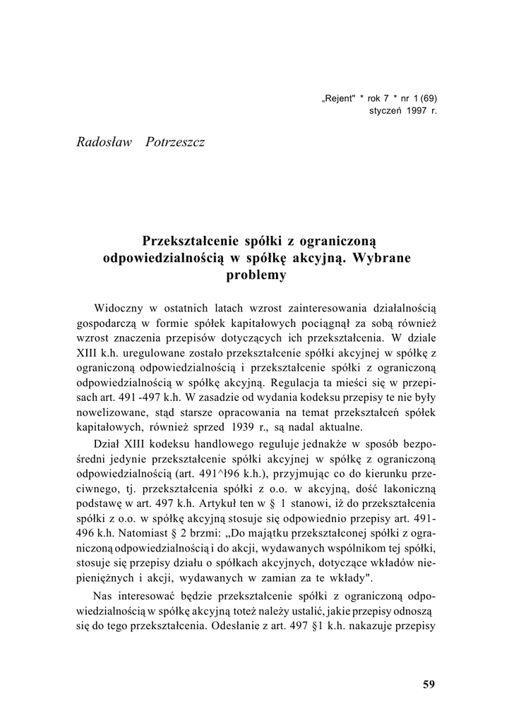 „Rejent" * rok 7 * nr 1 (69) styczeń 1997 r. Radosław Potrzeszcz Przekształcenie spółki z ograniczoną odpowiedzialnością w spółkę akcyjną. Wybrane problemy Widoczny w ostatnich latach wzrost zainteresowania działalnością gospodarczą w formie spółek kapitałowych pociągnął za sobą również wzrost znaczenia przepisów dotyczących ich przekształcenia. W dziale XIII k.h. uregulowane zostało przekształcenie spółki akcyjnej w spółkę z ograniczoną odpowiedzialnością i przekształcenie spółki z ograniczoną odpowiedzialnością w spółkę akcyjną. Regulacja ta mieści się w przepisach art. 491 -497 k.h. W zasadzie od wydania kodeksu przepisy te nie były nowelizowane, stąd starsze opracowania na temat przekształceń spółek kapitałowych, również sprzed 1939 r., są nadal aktualne. Dział XIII kodeksu handlowego reguluje jednakże w sposób bezpośredni jedynie przekształcenie spółki akcyjnej w spółkę z ograniczoną odpowiedzialnością (art. 491^ł96 k.h.), przyjmując co do kierunku przeciwnego, tj. przekształcenia spółki z o.o. w akcyjną, dość lakoniczną podstawę w art. 497 k.h. Artykuł ten w § 1 stanowi, iż do przekształcenia spółki z o.o. w spółkę akcyjną stosuje się odpowiednio przepisy art. 491496 k.h. Natomiast § 2 brzmi: „Do majątku przekształconej spółki z ograniczoną odpowiedzialnością i do akcji, wydawanych wspólnikom tej spółki, stosuje się przepisy działu o spółkach akcyjnych, dotyczące wkładów niepieniężnych i akcji, wydawanych w zamian za te wkłady". Nas interesować będzie przekształcenie spółki z ograniczoną odpowiedzialnością w spółkę akcyjną toteż należy ustalić, jakie przepisy odnoszą się do tego przekształcenia. Odesłanie z art. 497 §1 k.h. nakazuje przepisy 59 Radosław Potrzeszcz art. 491-496 stosować odpowiednio, co oznacza, iż nie wszystkie znajdą zastosowanie, a część tych, które zastosować się da, będzie musiała przy ocenie przekształcenia spółki z o.o. w akcyjną zostać zmodyfikowana1. Z powyższego wynika, iż podstawą przekształcenia spółki z o.o. w akcyjną są generalnie przepisy art. 491-496 w zw. z art. 497 § 1 k.h. Oznacza to identyczny schemat przekształcenia w obu kierunkach, tzn. podjęcie uchwały (art. 492), czynności przygotowawcze (art. 493) oraz zgłoszenie i rejestrację przekształcenia (art. 495)2. Dodatkowa regulacja dotycząca wyłącznie omawianego tu przekształcenia obejmuje w zw. z art. 497 § 2 k.h. stosowanie tych przepisów działu XII k.h., które dotyczą wkładów niepieniężnych i akcji aportowych. Zachodzi więc konieczność zastosowania m.in. art. 312,313,325,328,347 k.h. Zważyć jednak należy, iż przepisy art. 491-497 k.h. stanowią osobny dział kodeksu, co stanowi o założonej przez ustawodawcę wyłączności tych przepisów do przekształcenia, z uwzględnieniem innych przepisów w następujących sytuacjach: a) w związku z odesłaniem z art. 495 § 1 w zw. z art. 497 § 1 konieczne jest stosowanie przepisów działu XII k.h. stanowiących „ogólne warunki przepisane dla wpisu spółki akcyjnej"; b) co do sporządzenia wymaganego w art. 492 § 1 k.h. bilansu obowiązują zasady zawarte w ustawie z 29 września 1994 r. o rachunkowości (Dz.U. Nr 121, poz. 591); c) w niektórych przypadkach zajść może potrzeba stosowania przepisów o zawiązaniu spółki akcyjnej (art. 314 i 315 albo art. 316 i n. k.h.); d) do zgłoszenia i rejestracji przekształcenia zastosowanie mają przepisy k.h. o rejestrze handlowym (Dział II), przepisy rozporządzenia Ministra Sprawiedliwości z 1 lipca 1934 r. o rejestrze handlowym (Dz.U. Nr 59, poz. 511) oraz przepisy k.p.c. o postępowaniu nieprocesowym; e) zupełnie incydentalnie do przekształcenia stosowane mogą być ustawy szczególne, jak np.: ustawa z 24 marca 1920 r. o nabywaniu nieruchomości przez cudzoziemców (tekst jedn.: Dz.U. z 1996 r. Nr 54, poz. 245), ustawa z dnia 28.07.1990 r. o działalności ubezpieczeniowej (tekst 1 J . N o w a c k i , Analogia legis, Warszawa 1965, s. 141-144; A. W o 1 t e r , Prawo cywilne. Zarys części ogólnej, Warszawa 1997, s. 82; podobnie I. W e i s s, Przekształcanie spółek kapitałowych (I), „Przegląd Prawa Handlowego" 1933, nr 14, s. 10. 2 Zob. uzasadnienie do postanowienia SN z dn. 13 grudnia 1991 r. III CRN 321/91, OSN 1992, z. 7-8, poz. 142, s. 128-131. 60 Przekształcenie spółki z ograniczoną odpowiedzialnością ... jedn.: Dz.U. z 1996 r. Nr 11, poz. 62), ustawa z 15 lutego 1992 r. o podatku dochodowym od osób prawnych (Dz.U. Nr 21, poz. 86 z późn. zm.); f) do przekształcenia odnosi się w samodzielny sposób regulacja ustawy z 24 lutego 1990 r. o przeciwdziałaniu praktykom monopolistycznym (Dz.U. z 1995 r. Nr 80, poz. 405). W poniższych rozważaniach nie będzie omawiany szczegółowo cały przebieg przekształcenia spółki z ograniczoną odpowiedzialnością w spółkę akcyjną. Pragnę jedynie zwrócić uwagę na pewne dość kontrowersyjne w literaturze zagadnienia związane z tym przekształceniem, a dotyczące: - charakteru przekształcenia, co zresztą odnosi się jednakowo do obu kierunków przekształcenia, - uchwały o przekształceniu: jej charakteru i trybu podejmowania, - kapitału akcyjnego spółki akcyjnej wynikłej z przekształcenia w nią spółki z o.o., - skutków nieprawidłowości przekształcenia, a wynikłych po jego zarejestrowaniu i wreszcie - majątku spółki z ograniczoną odpowiedzialnością przekształcanej w spółkę akcyjną co wiąże się ze swoistą regulacją art. 497 § 2 k.h. Charakter prawny przekształcenia „Przekształcenie spółki z o.o. na spółkę akcyjną nie powoduje żadnych zmian w jej stosunku do osób trzecich" - art. 491 w zw. z art. 497 § 1 k.h. Przepis ten jest punktem wyjścia do rozważań na temat omawianego przekształcenia. W literaturze wcześniejszej ugruntował się jednolity pogląd 0 tożsamości podmiotu, tj. spó
