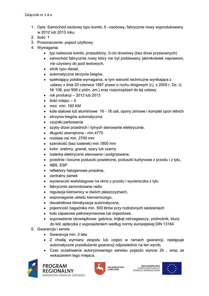 Załącznik nr 1 A e 1. Opis: Samochód osobowy typu kombi, 5 –osobowy, fabrycznie nowy wyprodukowany w 2012 lub 2013 roku 2. Ilość: 1 3. Przeznaczenie: pojazd użytkowy 4. Wymagania: typ nadwozia kombi, przeszklony, 5-cio drzwiowy (bez drzwi przesuwnych) samochód fabrycznie nowy który nie był poddawany jakimkolwiek naprawom, nie używany do jazd testowych, silnik typu diesel, automatyczna skrzynia biegów, spełniający polskie wymagania, w tym warunki techniczne wynikające z ustawy z dnia 20 czerwca 1997 prawo o ruchu drogowym (t.j. z 2005 r. Dz. U. Nr 108, poz 908 z późn. zm.) oraz rozporządzeń do tej ustawy. rok produkcji – 2012 lub 2013 ilość miejsc – 5 moc min. 160 KM koła stalowe lub aluminiowe 16 - 18 cali, opony zimowe i komplet opon letnich skrzynia biegów automatyczna czujniki parkowania szyby drzwi przednich i tylnych sterowanie elektrycznie, długość zewnętrzna - min.4770 rozstaw osi min. 2700 mm szerokość (bez lusterek) min.1800 mm kolor srebrny, granat, szary lub czarny lusterka elektryczne sterowane i podgrzewane, przednie i boczne poduszki powietrzne, poduszki kurtynowe z przodu i z tyłu, ABS, ESP reflektory halogenowe przednie, centralny zamek wycieraczki wielobiegowe na okno z przodu i wycieraczka z tyłu fabrycznie zamontowane radio regulacja kierownicy w dwóch płaszczyznach, wspomaganie układu kierowniczego, dwustrefowa klimatyzacja automatyczna, pojemność bagażnika min. 500 litrów przy rozłożonych siedzeniach koło zapasowe pełnowymiarowe lub dojazdowe, wyposażenie obowiązkowe: gaśnica, trójkąt ostrzegawczy, podnośnik, klucz do kół, apteczka z wyposażeniem według normy europejskiej DIN 13164 5. Gwarancja i serwis Gwarancja min. 2 lata Z chwilą wymiany zespołu lub części w ramach gwarancji, następuje automatyczne przedłużenie gwarancji odpowiednio na ten wyrób, Czas oczekiwania autoryzowanego serwisu pojazdu wynosi 2h , wraz ze wskazaniem tego miejsca. Załącznik nr 1 A e Gwarancja Wykonawcy dotycząca skuteczności zabezpieczenia antykorozyjnego: min. 5 lat Okres gwarancji biegnie od dnia odbioru samochodu przez Zamawiającego 6. Pozostałe warunki zamówienia 2 komplety kluczy Wykonawca gwarantuje pełnienie wymagań rejestracyjnych obowiązujących w dniu dostawy Odbiór samochodu nastąpi do dnia 30 marzec 2013 roku po sprawdzeniu kompletności dostawy i wymaganych dokumentów. Dostawę uważa się za kompletną jeżeli dostarczony samochód będzie zgodny z podpisaną umową, dołączone będą wszystkie wymagane przepisami dokumenty, certyfikaty, gwarancje, instrukcje obsługi i zostanie podpisany przez Zamawiającego i Wykonawcę bez zastrzeżeń protokół zdawczo - odbiorczy. Wszystkie ww. dokumenty muszą być sporządzone w języku polskim.