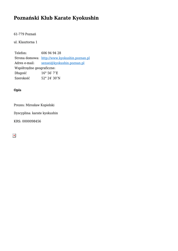 Poznański Klub Karate Kyokushin 61-779 Poznań ul. Klasztorna 1 Telefon: 606 94 94 28 Strona domowa: http://www.kyokushin.poznan.pl Adres e-mail: [email protected] Współrzędne geograficzne: Długość 16° 56′ 7″E Szerokość 52° 24′ 30″N Opis Prezes: Mirosław Kopielski Dyscyplina: karate kyokushin KRS: 0000098456