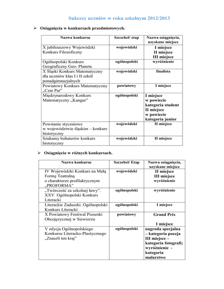 Sukcesy uczniów w roku szkolnym 2012/2013 Osiągnięcia w konkursach przedmiotowych. Szczebel/ etap Nazwa osiągnięcia, uzyskane miejsce X jubileuszowy Wojewódzki Konkurs Filozoficzny wojewódzki I miejsce II miejsce III miejsce Ogólnopolski Konkurs Geograficzny Geo- Planeta X Śląski Konkurs Matematyczny dla uczniów klas I i II szkół ponadgimnazjalnych Powiatowy Konkurs Matematyczny „Czar Par” Międzynarodowy Konkurs Matematyczny „Kangur” ogólnopolski wyróżnienie wojewódzki finalista powiatowy I miejsce ogólnopolski I miejsce w powiecie kategoria student II miejsce w powiecie kategoria junior Powstanie styczniowe w województwie śląskim – konkurs historyczny Szukamy bohaterów konkurs historyczny wojewódzki II miejsce wojewódzki II miejsce Nazwa konkursu Osiągnięcia w różnych konkursach. Nazwa konkursu Szczebel/ Etap Nazwa osiągnięcia, uzyskane miejsce IV Wojewódzki Konkurs na Małą Formę Teatralną o charakterze profilaktycznym „PROFORMA” „Twórczość za szkolnej ławy”. XXV Ogólnopolski Konkurs Literacki Literackie Zaduszki. Ogólnopolski Konkurs Literacki X Powiatowy Festiwal Piosenki Obcojęzycznej w Siewierzu wojewódzki II miejsce III miejsce V edycja Ogólnopolskiego Konkursu Literacko-Plastycznego „Znaszli ten kraj” wyróżnienie ogólnopolski wyróżnienie ogólnopolski I miejsce powiatowy Grand Prix ogólnopolski I miejsce nagroda specjalna – kategoria poezja III miejsce – kategoria fotografi; wyróżnienie kategoria malarstwo XXII Ogólnopolski Konkurs Mickiewiczowski „Adamus 2012” ogólnopolski wyróżnienie Wojewódzki Konkurs Recytatorski „Poezja wolnościowa okresu PRL-u” Regionalny Festiwal Piosenki Anglojęzycznej SING UP FESTIVAL Powiatowy Festiwal Piosenki LOVESONG wojewódzki III miejsce wojewódzki II miejsce powiatowy wyróżnienie II miejsce Powiatowy Turniej Komputerowych Gier Logicznych II Powiatowy Konkurs Debat Szkół Ponadgimnazjalnych „Złote Usta” powiatowy III miejsce II miejsce powiatowy I miejsce Osiągnięcia w sporcie – drużynowo. Dyscyplina Szczebel miejski powiatowy rejonowy Uzyskane miejsce I miejsce I miejsce II miejsce Sztafetowe Biegi Przełajowe Chłopcy miejski powiatowy rejonowy I miejsce I miejsce II miejsce Liga Lekkoatletyczna Dziewczyny miejski powiatowy rejonowy I miejsce I miejsce II miejsce Liga Lekkoatletyczna Chłopcy miejski powiatowy rejonowy I miejsce I miejsce III miejsce Tenis stołowy miejski powiatowy rejonowy III miejsce III miejsce III miejsce Piłka ręczna miejski powiatowy II miejsce III miejsce Siatkówka dziewcząt Rejonowy III miejsce Siatkówka plażowa dziewcząt VII Zagłębiowski Turniej Piłki Plażowej Dziewcząt rejonowy rejonowy III miejsce I miejsce Sztafetowe Biegi Przełajowe Dziewczyny Przedsięwzięcia organizowane przez szkołę w roku szkolnym 2012/2013. VIII Powiatowy Konkurs Fotograficzny „Drzewo w kadrze” III Powiatowe Konfrontacje Gimnazjalne GIGANCI 2013 Spotkania Uniwersyteckie Wyspiana – wykłady i warsztaty przedstawicieli sądu, prokuratury i wyższych Uczelni X Koncert IX Muz w Teatrze Dzieci Zagłębia w Będzinie Święto Szkoły Wystawienie spektaklu na deskach Teatru Dzieci Zagłębia w oparciu o dramat S. Mrożka „Śmierć porucznika” Wystawienie spektaklu na deskach Teatru Dzieci Zagłębia w oparciu o dramat Wojcieszka „Made in Poland” VI Powiatowy Obcojęzyczny Konkurs Literacki dla gimnazjalistów „Nie ma dzieci, są ludzie” – historyczno-literacki konkurs nt. Janusza Korczaka - konkurs dla gimnazjalistów Wyspiański Artystycznie koncert dla gimnazjalistów w kinie Nowość w Będzinie III Turniej Piłki Nożnej Chłopców o Puchar Dyrekcji II Liceum Ogólnokształcącego w Będzinie Wyspian Dzieciom Dzień Dziecka dla dzieci z Domu Dziecka w Sarnowie Spektakl charytatywny „Bóg – Woodiego Allena” Teatr Dzieci Zagłębia w Będzinie Naukowe Spotkania Młodych - Kultura i media warsztaty Dni Otwarte Szkoły II Powiatowy Konkurs Debat Szkół Ponadgimnazjalnych „Złote Usta” Warsztaty Humanistyczne „Szalom” we współpracy z Instytutem Pamięci Narodowej oddział w Katowicach. Warsztaty matematyczne „Podwieczorek z matematyką” Warsztaty Humanistyczne „Nocne Polaków Rozmowy” ludobójstwo w Ruandzie Terenowe Warsztaty Matematyczne - Sławków Dzień Języków Obcych Dzień Sportu Dzień bez Przemocy Dzień Nauk Przyrodniczych