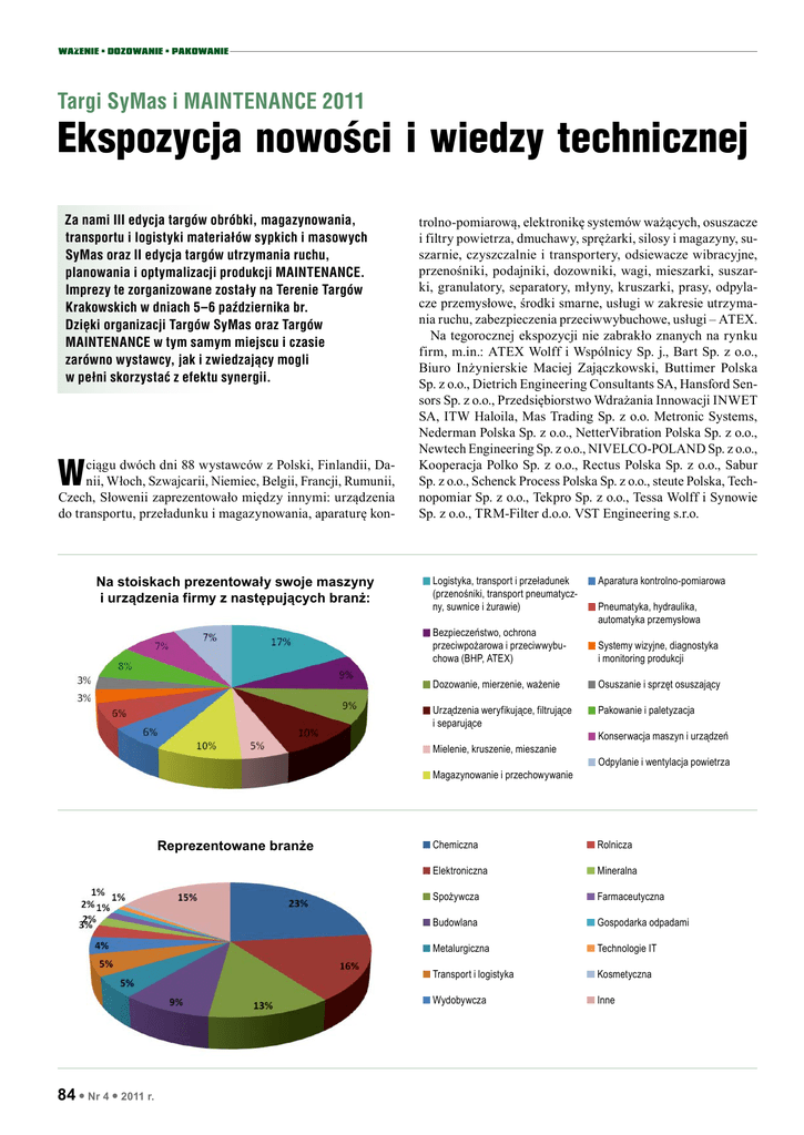 WAZENIE n DOZOWANIE n PAKOWANIE Targi SyMas i MAINTENANCE 2011 Ekspozycja nowości i wiedzy technicznej Za nami III edycja targów obróbki, magazynowania, transportu i logistyki materiałów sypkich i masowych SyMas oraz II edycja targów utrzymania ruchu, planowania i optymalizacji produkcji MAINTENANCE. Imprezy te zorganizowane zostały na Terenie Targów Krakowskich w dniach 5–6 października br. Dzięki organizacji Targów SyMas oraz Targów MAINTENANCE w tym samym miejscu i czasie zarówno wystawcy, jak i zwiedzający mogli w pełni skorzystać z efektu synergii. W ciągu dwóch dni 88 wystawców z Polski, Finlandii, Danii, Włoch, Szwajcarii, Niemiec, Belgii, Francji, Rumunii, Czech, Słowenii zaprezentowało między innymi: urządzenia do transportu, przeładunku i magazynowania, aparaturę kon- Na stoiskach prezentowały swoje maszyny i urządzenia firmy z następujących branż: trolno-pomiarową, elektronikę systemów ważących, osuszacze i filtry powietrza, dmuchawy, sprężarki, silosy i magazyny, suszarnie, czyszczalnie i transportery, odsiewacze wibracyjne, przenośniki, podajniki, dozowniki, wagi, mieszarki, suszarki, granulatory, separatory, młyny, kruszarki, prasy, odpylacze przemysłowe, środki smarne, usługi w zakresie utrzymania ruchu, zabezpieczenia przeciwwybuchowe, usługi – ATEX. Na tegorocznej ekspozycji nie zabrakło znanych na rynku firm, m.in.: ATEX Wolff i Wspólnicy Sp. j., Bart Sp. z o.o., Biuro Inżynierskie Maciej Zajączkowski, Buttimer Polska Sp. z o.o., Dietrich Engineering Consultants SA, Hansford Sensors Sp. z o.o., Przedsiębiorstwo Wdrażania Innowacji INWET SA, ITW Haloila, Mas Trading Sp. z o.o. Metronic Systems, Nederman Polska Sp. z o.o., NetterVibration Polska Sp. z o.o., Newtech Engineering Sp. z o.o., NIVELCO-POLAND Sp. z o.o., Kooperacja Polko Sp. z o.o., Rectus Polska Sp. z o.o., Sabur Sp. z o.o., Schenck Process Polska Sp. z o.o., steute Polska, Technopomiar Sp. z o.o., Tekpro Sp. z o.o., Tessa Wolff i Synowie Sp. z o.o., TRM-Filter d.o.o. VST Engineering s.r.o. L ogistyka, transport i przeładunek (przenośniki, transport pneumatyczny, suwnice i żurawie) ezpieczeństwo, ochrona B przeciwpożarowa i przeciwwybuchowa (BHP, ATEX) ystemy wizyjne, diagnostyka S i monitoring produkcji Osuszanie i sprzęt osuszający rządzenia weryfikujące, filtrujące U i separujące Pakowanie i paletyzacja Magazynowanie i przechowywanie 84 l Nr 4 l 2011 r. neumatyka, hydraulika, P automatyka przemysłowa Dozowanie, mierzenie, ważenie Mielenie, kruszenie, mieszanie Reprezentowane branże Aparatura kontrolno-pomiarowa Konserwacja maszyn i urządzeń Odpylanie i wentylacja powietrza Chemiczna Rolnicza Elektroniczna Mineralna Spożywcza Farmaceutyczna Budowlana Gospodarka odpadami Metalurgiczna Technologie IT Transport i logistyka Kosmetyczna Wydobywcza Inne WAZENIE Zakres tematyczny imprezy oraz jej branżowość okazały się dużym atutem i zostały pozytywnie ocenione przez odwiedzających, reprezentujących głównie przemysł chemiczny, elektroniczny, spożywczy, budowlany, metalurgiczny, transportowy i logistyczny. Targi odwiedziły osoby podejmujące kluczowe decyzje w przedsiębiorstwach, a przez to mające wpływ na kwestie związane z zakupem nowego sprzętu czy wdrażaniem nowoczesnych technologii. Na Targach obecni byli zarówno właściciele i prezesi zakładów, jak również inżynierowie, technolodzy i kierownicy produkcji czy specjaliści ds. technicznych. Zwiedzający Targi SyMas mogli z bliska zobaczyć i przetestować prezentowane na stoiskach maszyny i urządzenia, a także wymienić doświadczenie w zakresie nowoczesnych rozwiązań stosowanych w przemyśle. Organizatorzy zapewnili odwiedzającym dodatkowe możliwości zgłębienia wiedzy o branży. Stałym punktem imprez organizowanych pod szyldem easyFairs® są warsztaty learnShops™. Cykl prezentacji i miniwykładów przygotowanych przez najlepszych specjalistów z branży miał na celu poszerzenie wiedzy zwiedzających na temat nowych technologii i rozwiązań, co stanowiło doskonałą okazję, aby w czasie wizyty na Targach uzupełnić zarówno teoretyczną, jak i praktyczną wiedzę z zakresu materiałów sypkich i masowych oraz utrzymania ruchu. W ramach tegorocznych Targów odbyły się również dwie imprezy towarzyszące: Międzynarodowe Seminarium INDEX: „Zabezpieczenia przeciwwybuchowe ATEX”, organizowane przez firmę Tessa Wolff i Synowie, oraz V Krakowskie Seminarium z cyklu Energia – Media – Utrzymanie ruchu: „Diagnostyka – Bezpieczeństwo – Systemy informatyczne. Zysk energetyczny w utrzymaniu ruchu”, organizowane przez firmę humac. Wyniki ankiet przeprowadzonych wśród gości targowych pokazują, że zdecydowana większość, bo ponad 70% ankietowanych, oceniła pozytywnie ofertę prezentowaną na Targach. n DOZOWANIE n PAKOWANIE Goście docenili również estetyczną zabudowę stoisk, dobrą organizację i profesjonalną obsługę, a przede wszystkim atmosferę panującą na Targach. Ze względu na ściśle branżowy charakter Targi odwiedzili wyłącznie specjaliści z branży materiałów sypkich i masowych oraz utrzymania ruchu. Znacząco ułatwiło to nawiązywanie kontaktów, a w przyszłości zapewne przełoży się na wiele zrealizowanych kontraktów. Z uznaniem ze strony wystawców i gości targowych spotkały się seminaria i konferencje przewidziane w programie towarzyszącym Targom. Podsumowując minioną już edycję Targów SyMas i MAINTENANCE, warto zauważyć, że jest to impreza zyskująca sobie z roku na rok coraz większe grono zarówno wystawców, jak i odwiedzających. Świadczy to niewątpliwie o potrzebie ściśle branżowego spotkania ukierunkowanego przede wszystkim na nawiązywanie kontaktów biznesowych i poszerzanie wiedzy o nowościach produktowych i technologicznych. n Nr 4 l 2011 r. l 85