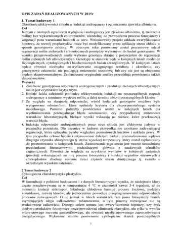 OPIS ZADAŃ REALIZOWANYCH W 2015r 1. Temat badawczy 1 Określenie efektywności chłodu w indukcji androgenezy i ograniczeniu zjawiska albinizmu. Cel Jednym z istotnych ograniczeń wydajności androgenezy jest zjawisko albinizmu, tj. tworzenia rośliny bez wykształconych chloroplastów, niezdolnej do prowadzenia procesu fotosyntezy i wegetacji poza warunkami hodowli in vitro. Wnioskowany projekt zakłada zweryfikowanie hipotezy, że rozwój proplastydów może być modyfikowany przez aplikację stresu chłodu w sposób genotypowo zależny. W obecnym roku porównany został procentowy udział regeneracji roślin zielonych i albinotycznych pomiędzy wybranymi do badań genotypami. W wyniku przeprowadzonych analiz wybrano genotypy skrajne z potencjałem do regeneracji roślin zielonych lub albinotycznych. Genotypy te stanowić będą w kolejnych latach model do fizjologicznych, cytologicznych i biochemicznych badań szczegółowych. W kolejnych latach będzie również niezbędne zweryfikowanie osiągniętego rezultatu i określenie, czy genotypowe zależności nie podlegają zmienności sezonowej lub czy nie jest są obarczone błędem eksperymentalnym. Zaplanowane oryginalnie analizy przewidują powtórzenie takich eksperymentów. Wnioski 1. Zależność genotypowa odpowiedzi androgenicznych i produkcji zielonych/albinotycznych roślin jest czynnikiem krytycznym. 2. Istnieje ścisła zależność pomiędzy efektywnością indukcji na poszczególnych etapach androgenezy a terminem wysiewu roślin, a dalej terminu zbioru poszczególnych kłosów. 3. Ze względu na skrajność odpowiedzi, wśród badanych genotypów możliwe było wytypowane odmian/linii, które spełniały kryteria dla eksperymentalnego systemu modelowego. Pomimo potrzeby powtórzenia analiz w kolejnych latach dla wyeliminowania potencjalnego błędu sezonowości, czy przypadkowej zmienności warunków laboratoryjnych, bieżące wyniki wskazują na różnice, które przekraczają wartości błędu. 4. Indukcja odpowiedzi androgenicznych przez stres chłodu jest efektywna jedynie w przypadku pszenżyta. Dla pszenicy w żadnym przypadku nie uzyskano zadawalającej regeneracji, która opłacalna byłaby względem poniesionych kosztów i nakładu pracy. W tym przypadku celowe będzie kontynuowanie dalszych badań i przeanalizowanie wpływu drugiego czynnika abiotycznego tj. stresu wysokiej temperatury, który został zaplanowany do przetestowania w kolejnych latach. Zastosowanie tego stresu jest mocno uzasadnione przesłankami literaturowymi, pochodzącymi głównie z naukowych ośrodków zagranicznych. Również ze względu na uzyskanie wyników w kolejnych zadaniach (poniżej) wskazujących na rolę procesu fotosyntezy i indukcji sygnałów stresowych z chloroplastów zbadany zostanie trzeci czynnik stresu abiotycznego tj. światło o określonym wysokim natężeniu. 2 Temat badawczy 2 Cytologiczna charakterystyka plastydów. Cel W konsultacji z polskimi hodowcami i z danych literaturowych wynika, że niedojrzałe kłosy często przechowywane są w temperaturze 4 °C w ciemności nawet 3-4 tygodnie, aż do momentu izolacji mikrospor. Inkubacja chłodowa hamuje procesy życiowe, podziały komórkowe, rozwój kłosów, ale jednocześnie powoduje przeprogramowanie odpowiednich procesów rozwojowych. O ile jednak w takich warunkach faza jasna fotosyntezy tkanek asymilujących ulega całkowitemu zahamowaniu, o tyle procesy rozwojowe nie są zredukowane całkowicie. Dlatego celem tematu jest zweryfikowanie hipotezy, czy brak dopływu produktów fotosyntezy może powodować eliminację plastydów, nie tylko w wyniku priorytetowego rozwoju gametofitowego, ale również niezbalansowanego zapotrzebowania energetycznego. Wykonane zostało porównanie cytologiczne tkanek poszczególnych 1 genotypów z uwzględnieniem obecności plastydów (proplastydy, chloroplasty, amyloplasty) podczas indukcji procesu androgenezy po zastosowaniu standardowo stosowanego chłodu. Analiza plastydów przeprowadzona była w mikrosporach, oraz kalusie/strukturach androgenicznych i regeneratach. Określone zostało, który etap androgenezy jest krytyczny dla prawidłowego formowania chloroplastów oraz znaczenie zaawansowania rozwoju mikrospor. Wnioski 1. Zróżnicowanie wieku mikrospor w obrębie kłosa może być wskaźnikiem, informującym o prawidłowym przebiegu przyszłego procesu androgenezy. 2. Wstępna analiza mikroskopowa nie potwierdziła występowania chloroplastów/proplastydów w mikrosporach. 3. Indukcja struktur androgenicznych i regeneracji były w niewielkim stopniu skorelowana, podobnie jak procentowy udział zregenerowanych roślin albinotycznych względem całkowitej liczby zregenerowanych roślin. 4. U roślin zakwalifikowanych wizualnie jako albinotyczne obecne są plastydy, ale nie namnażają się w komórkach miękiszu liścia w sposób typowy, upośledzona jest w nich synteza chlorofilu i aparatu fotosyntetycznego. 3 Temat badawczy 5 Określenie stanu energetycznego komórek. Cel Indukcja przeprogramowania rozwoju mikrospor najczęściej przebiega w ciemności i w chłodzie. W takich warunkach niemożliwe jest prowadzenie procesu fotosyntezy, a zgromadzone substancje zapasowe liści są wycofywane i stopniowo rozkładane. Zaopatrzenie wewnętrznych tkanek w składniki odżywcze zależeć może zatem od efektywności fotosyntezy przed indukcją oraz szybkości degeneracji tkanek zielonych podczas indukcji. Również kolejny etap - pierwsza faza po wyłożeniu pylników na pożywkę do uzyskania struktur podobnych do zarodka odbywa się w ciemności w obecności cukru w podłożu (5-6 tygodni). W warunkach takich rozwój chloroplastów nie może przebiegać prawidłowo. Przekształcanie plastydów w chloroplasty teoretycznie możliwe jest dopiero w dalszych fazach androgenezy: na pożywce regeneracyjnej, która prowadzona jest na świetle. Dlatego temat badawczy 5 skoncentrowany jest na określeniu w jakim stopniu następuje degenera