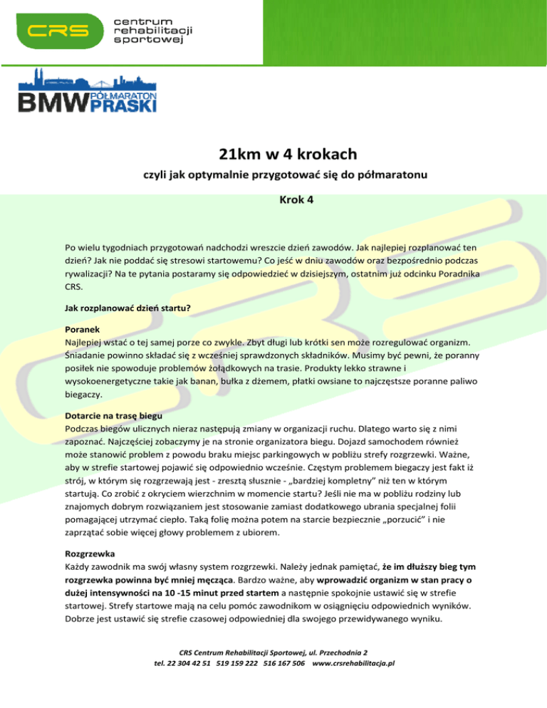 21km w 4 krokach czyli jak optymalnie przygotować się do półmaratonu Krok 4 Po wielu tygodniach przygotowań nadchodzi wreszcie dzień zawodów. Jak najlepiej rozplanować ten dzień? Jak nie poddać się stresowi startowemu? Co jeść w dniu zawodów oraz bezpośrednio podczas rywalizacji? Na te pytania postaramy się odpowiedzieć w dzisiejszym, ostatnim już odcinku Poradnika CRS. Jak rozplanować dzień startu? Poranek Najlepiej wstać o tej samej porze co zwykle. Zbyt długi lub krótki sen może rozregulować organizm. Śniadanie powinno składać się z wcześniej sprawdzonych składników. Musimy być pewni, że poranny posiłek nie spowoduje problemów żołądkowych na trasie. Produkty lekko strawne i wysokoenergetyczne takie jak banan, bułka z dżemem, płatki owsiane to najczęstsze poranne paliwo biegaczy. Dotarcie na trasę biegu Podczas biegów ulicznych nieraz następują zmiany w organizacji ruchu. Dlatego warto się z nimi zapoznać. Najczęściej zobaczymy je na stronie organizatora biegu. Dojazd samochodem również może stanowić problem z powodu braku miejsc parkingowych w pobliżu strefy rozgrzewki. Ważne, aby w strefie startowej pojawić się odpowiednio wcześnie. Częstym problemem biegaczy jest fakt iż strój, w którym się rozgrzewają jest - zresztą słusznie - „bardziej kompletny” niż ten w którym startują. Co zrobić z okryciem wierzchnim w momencie startu? Jeśli nie ma w pobliżu rodziny lub znajomych dobrym rozwiązaniem jest stosowanie zamiast dodatkowego ubrania specjalnej folii pomagającej utrzymać ciepło. Taką folię można potem na starcie bezpiecznie „porzucić” i nie zaprzątać sobie więcej głowy problemem z ubiorem. Rozgrzewka Każdy zawodnik ma swój własny system rozgrzewki. Należy jednak pamiętać, że im dłuższy bieg tym rozgrzewka powinna być mniej męcząca. Bardzo ważne, aby wprowadzić organizm w stan pracy o dużej intensywności na 10 -15 minut przed startem a następnie spokojnie ustawić się w strefie startowej. Strefy startowe mają na celu pomóc zawodnikom w osiągnięciu odpowiednich wyników. Dobrze jest ustawić się strefie czasowej odpowiedniej dla swojego przewidywanego wyniku. CRS Centrum Rehabilitacji Sportowej, ul. Przechodnia 2 tel. 22 304 42 51 519 159 222 516 167 506 www.crsrehabilitacja.pl Strategia Biegu Strategia zależy od długości biegu, nachylenia trasy czy też warunków atmosferycznych, zatem trzeba ją dynamicznie dostosowywać do warunków. Wielu biegaczy pierwszą połowę trasy pokonuje szybciej poddając się naturalnemu zmęczeniu. Inni starają się biec idealnie równym tempem a jeszcze inni pokonują drugą połowę dystansu szybciej. Ostatnią opcję polecam szczególnie dla mniej doświadczonych biegaczy. Mają oni bowiem tendencje do zbyt wysokiego tempa w pierwszej części dystansu co powoduje potem często fatalne skutki (wycieńczenie, marsz zamiast biegu) w drugiej części dystansu. Zatem lepiej nie szarżować na początku, by zachować siły na przyciśnięcie w końcówce. Jak radzić sobie ze stresem związanym ze startem? Występ w półmaratonie to nie lada wyzwanie. Nawet jeśli jesteśmy dobrze przygotowani do startu mając za sobą wiele dni spędzonych na treningach, start zawsze stanowi pewną niewiadomą. A to już samo w sobie rodzi stres. Bo przecież w praktyce dopiero w czasie biegu okaże się jaką faktycznie mamy formę. Musimy też zakończyć bieg, by przekonać się dopiero czy zakładane cele zostały osiągnięte. Gdy dodać do tego jeszcze czynniki, na które nie mamy żadnego wpływu, jak pogoda czy inni uczestnicy biegu i nagle okazuje się, że udział w półmaratonie rodzi naprawdę poważny stres. Warto podkreślić, że taki stres jest czymś zupełnie normalnym. Podobnie jak my czuje się większość innych uczestników. Co zatem zrobić, aby obniżyć zbyt wysoki poziom stresu i czerpać większą przyjemność z samego biegu? Już sama aktywność fizyczna jest skutecznym sposobem radzenia sobie ze stresem – oczywiście pod pewnymi warunkami: - nie traktujmy ćwiczeń jako sposobu na przekraczanie swoich fizycznych możliwości. Nie przesadzajmy z wysiłkiem. Ćwiczmy spokojnie i ze spokojem, powoli podnosząc sobie poprzeczkę; - ćwiczenia powinny sprawiać radość. Nie traktujmy tego zbyt poważnie. Współzawodnictwo za wszelką cenę zamiast odstresowywać działa odwrotnie. Bardzo ważna sprawa – jeszcze przed startem powinniśmy dać sobie prawo do nie ukończenia biegu! I to bez względu na powód takiej decyzji! Robienie czegoś na siłę zwłaszcza, kiedy organizm mówi stop nie jest dobrym rozwiązaniem. Każdy wie ile kosztowało go przygotowanie do startu. Bez siły charakteru, odwagi i codziennego pokonywania własnych ograniczeń nie byłoby nas na starcie. Już sam fakt, że jesteśmy na starcie bez najmniejszych wątpliwości pozwala nazwać się zwycięzcą! Uznając ten fakt łatwiej zrzucić z siebie presję i tym samym pozbyć choć części stresu. Co jeść w dniu biegu? Na temat odżywiania przed i w dniu startu mówiliśmy już w poprzednich odcinkach Poradnika CRS. Teraz zatem tylko przypomnienie najważniejszych punktów: - pamiętaj o sprawdzonym śniadaniu zawierającym węglowodany złożone; - posiłek spożyj odpowiednie wcześnie przed biegiem; - na trasie używaj tylko wypróbowanych żeli oraz napojów; - pij z umiarem; CRS Centrum Rehabilitacji Sportowej, ul. Przechodnia 2 tel. 22 304 42 51 519 159 222 516 167 506 www.crsrehabilitacja.pl - po zakończeniu biegu pamiętaj o pełnowartościowym posiłku zawierającym białko oraz węglowodany – dzięki temu twoja regeneracja będzie szybsza. Do startu pozostały zaledwie dwa dni. Wierzę, że wskazówki i porady, które staraliśmy się przekazać w czterech „krokach” - odcinkach naszego Poradnika CRS przydadzą się Wam zarówno w ramach przygotowań do BMW Półmaratonu Praskiego, jak i w kolejnych biegach. W następnym kroku