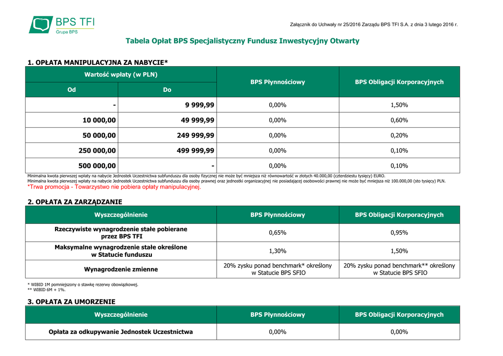 Załącznik do Uchwały nr 25/2016 Zarządu BPS TFI S.A. z dnia 3 lutego 2016 r. Tabela Opłat BPS Specjalistyczny Fundusz Inwestycyjny Otwarty 1. OPŁATA MANIPULACYJNA ZA NABYCIE* Wartość wpłaty (w PLN) Od BPS Płynnościowy BPS Obligacji Korporacyjnych Do - 9 999,99 0,00% 1,50% 10 000,00 49 999,99 0,00% 0,60% 50 000,00 249 999,99 0,00% 0,20% 250 000,00 499 999,99 0,00% 0,10% 500 000,00 - 0,00% 0,10% Minimalna kwota pierwszej wpłaty na nabycie Jednostek Uczestnictwa subfunduszu dla osoby fizycznej nie może być mniejsza niż równowartość w złotych 40.000,00 (czterdziestu tysięcy) EURO. Minimalna kwota pierwszej wpłaty na nabycie Jednostek Uczestnictwa subfunduszu dla osoby prawnej oraz jednostki organizacyjnej nie posiadającej osobowości prawnej nie może być mniejsza niż 100.000,00 (sto tysięcy) PLN. *Trwa promocja - Towarzystwo nie pobiera opłaty manipulacyjnej. 2. OPŁATA ZA ZARZĄDZANIE Wyszczególnienie BPS Płynnościowy BPS Obligacji Korporacyjnych Rzeczywiste wynagrodzenie stałe pobierane przez BPS TFI 0,65% 0,95% Maksymalne wynagrodzenie stałe określone w Statucie funduszu 1,30% 1,50% Wynagrodzenie zmienne 20% zysku ponad benchmark* określony w Statucie BPS SFIO 20% zysku ponad benchmark** określony w Statucie BPS SFIO Wyszczególnienie BPS Płynnościowy BPS Obligacji Korporacyjnych Opłata za odkupywanie Jednostek Uczestnictwa 0,00% 0,00% * WIBID 1M pomniejszony o stawkę rezerwy obowiązkowej. ** WIBID 6M + 1%. 3. OPŁATA ZA UMORZENIE Informacje o opłatach: Opłata manipulacyjna za nabycie Opłata manipulacyjna jest pobierana od każdej wpłaty do subfunduszu, a jej wysokość jest liczona jako wartość procentowa wpłaty dokonanej przez nabywcę Jednostek Uczestnictwa i zależy od: a) rodzaju subfunduszu, b) wysokości wpłaty oraz bieżącej wartości środków zgromadzonych przez uczestnika na subrejestrach w subfunduszu, którego dotyczy wpłata (zasada kumulacji). Do obliczenia bieżącej wartości środków zgromadzonych przez Uczestnika na subrejestrach w subfunduszu stosuje się tę samą cenę Jednostki Uczestnictwa, po której rozliczana jest wpłata, czyli cenę bieżącą Jednostki Uczestnictwa uwzględnianą do realizacji transakcji. Opłata manipulacyjna za zamianę lub konwersję Nabycie Jednostek Uczestnictwa subfunduszu w ramach zamiany lub konwersji podlega opłacie manipulacyjnej. Opłata za zamianę lub konwersję pobierana jest przez Towarzystwo w subfunduszu, w którym nabywane są Jednostki Uczestnictwa (subfundusz docelowy), od kwoty zamienianych lub konwertowanych środków. Podstawą ustalenia ostatecznej wysokości stawki opłaty manipulacyjnej za zamianę lub konwersję jest wartość Jednostek Uczestnictwa posiadanych przez Uczestnika w subfunduszu źródłowym w dniu wyceny zlecenia zamiany lub konwersji. Stawka opłaty za zamianę lub konwersję stanowi różnicę pomiędzy stawką opłaty manipulacyjnej za nabycie Jednostek Uczestnictwa dla subfunduszu, w którym nabywane są Jednostki Uczestnictwa (subfundusz docelowy), a stawką opłaty manipulacyjnej za nabycie Jednostek Uczestnictwa w subfunduszu, z którego odkupywane są Jednostki Uczestnictwa (subfundusz źródłowy), z zastrzeżeniem, że stawka ta jest nieujemna, przy czym podstawę ustalenia wysokości stawki określa się jak powyżej.Opłata manipulacyjna nie jest pobierana, gdy zamiana następuje z subfunduszu, w którym opłaty za nabycie Jednostek Uczestnictwa są wyższe od ustalonych w subfunduszu docelowym. Odkupienie Jednostek Uczestnictwa subfunduszu w ramach zamiany lub konwersji nie podlega opłacie manipulacyjnej. Opłata za odkupienie (umorzenie) Towarzystwo nie pobiera opłat manipulacyjnych z tytułu odkupywania Jednostek Uczestnictwa. Opłata za zarządzanie Stawka procentowa opłaty, liczona od wartości aktywów netto danego subfunduszu, podawana jest w skali całego roku liczonego jako 365 lub 366 dni w roku przestępnym. Opłata jest pobierana bezpośrednio z aktywów funduszu, związana jest z funkcjonowaniem danego subfunduszu i uwzględniona w publikowanej codziennie wartości Jednostki Uczestnictwa. Reinwestycja Nabycie nowych Jednostek Uczestnictwa danego subfunduszu przez Uczestnika, od którego Fundusz odkupił Jednostki Uczestnictwa tego samego subfunduszu, w ciągu 60 dni od dnia tego odkupienia, jest zwolnione z obowiązku uiszczania opłaty manipulacyjnej do wysokości kwoty, jaką ten Uczestnik otrzymał w zamian za odkupienie poprzednio posiadanych Jednostek Uczestnictwa. Uprawnienie to dotyczy sumy wartości odkupionych Jednostek Uczestnictwa – niezależnie od tego, czy odkupienia dokonano na podstawie jednego czy większej liczby żądań Uczestnika, z zastrzeżeniem, że okres 60 dni liczony jest od dnia wyceny pierwszego odkupienia uwzględnionego w sumowaniu. Zwolnienie, o którym mowa powyżej, przysługuje jeden raz w roku kalendarzowym i dotyczy zleceń nabycia Jednostek Uczestnictwa, dla których środki na nabycie wpłynęły przed upływem 31 grudnia danego roku kalendarzowego. Obowiązki podatkowe klientów indywidualnych Stosownie do art. 17 ust. 1 pkt 5), art. 23 ust. 1 pkt 38) oraz art. 30a ust. 1 pkt 5) ustawy z dnia 26 lipca 1991 r. o podatku dochodowym od osób fizycznych (tekst jednolity Dz.U. z 2010 r. nr 51 poz. 307) od uzyskanych na terytorium Rzeczypospolitej Polskiej dochodów z tytułu odkupienia bądź konwersji jednostek uczestnictwa w funduszach inwestycyjnych pobierany jest podatek w wysokości 19% dochodu. Dochód stanowi różnica pomiędzy sumą przychodów uzyskanych przez Uczestnika z tytułu odkupienia Jednostek Uczestnictwa a wydatkami poniesionymi przez niego na ich nabycie. Dochodu tego nie łączy się z dochodami opodatkowanymi na zasadach ogólnych.