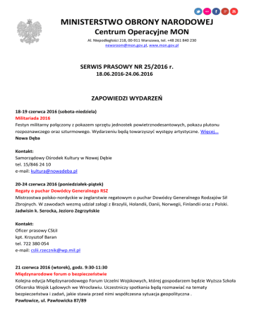MINISTERSTWO OBRONY NARODOWEJ Centrum Operacyjne MON Al. Niepodległości 218, 00-911 Warszawa, tel. +48 261 840 230 [email protected], www.mon.gov.pl SERWIS PRASOWY NR 25/2016 r. 18.06.2016-24.06.2016 ZAPOWIEDZI WYDARZEŃ 18-19 czerwca 2016 (sobota-niedziela) Militariada 2016 Festyn militarny połączony z pokazem sprzętu jednostek powietrznodesantowych, pokazu plutonu rozpoznawczego oraz szturmowego. Wydarzeniu będą towarzyszyć występy artystyczne. Więcej... Nowa Dęba Kontakt: Samorządowy Ośrodek Kultury w Nowej Dębie tel. 15/846 24 10 e-mail: [email protected] 20-24 czerwca 2016 (poniedziałek-piątek) Regaty o puchar Dowódcy Generalnego RSZ Mistrzostwa polsko-nordyckie w żeglarstwie regatowym o puchar Dowódcy Generalnego Rodzajów Sił Zbrojnych. W zawodach wezmą udział załogi z Brazylii, Holandii, Danii, Norwegii, Finlandii oraz z Polski. Jadwisin k. Serocka, Jezioro Zegrzyńskie Kontakt: Oficer prasowy CSŁiI kpt. Krzysztof Baran tel. 722 380 054 e-mail: [email protected] 21 czerwca 2016 (wtorek), godz. 9:30-11:30 Międzynarodowe forum o bezpieczeństwie Kolejna edycja Międzynarodowego Forum Uczelni Wojskowych, której gospodarzem będzie Wyższa Szkoła Oficerska Wojsk Lądowych we Wrocławiu. Uczestniczy spotkania będą rozmawiać na tematy bezpieczeństwa i zadań, jakie stawia przed nimi współczesna sytuacja geopolityczna . Pawłowice, ul. Pawłowicka 87/89 Kontakt: mjr Piotr Pietrakowski tel.: 508 411 656 e-mail: [email protected] por. Małgorzata Kowalska tel.: 261 658 185, kom. 601 922 784 e-mail: [email protected] 23 czerwca 2016 (czwartek) Akredytacje na szczyt NATO Akredytacje dla dziennikarzy na lipcowy szczyt NATO w Warszawie trwają do 23 czerwca. Więcej... Warszawa Kontakt: Joanna Wajda Tel.: +48 22 523 71 83 Email: [email protected] KRONIKA 12 czerwca 2016 (niedziela) Minister Macierewicz w Nowej Dębie Macie możliwość od kilku dni oglądać największe, najbardziej skomplikowane i najistotniejsze ćwiczenia, Ankonda−16 − powiedział minister Antoni Macierewicz podczas niedzielnego pobytu u żołnierzy ćwiczących na poligonie w Nowej Dębie. Więcej... 13 czerwca 2016 (poniedziałek) Prezydent RP i szef MON na ćwiczeniu Anakonda-16 W poniedziałek Prezydent RP, Zwierzchnik Sił Zbrojnych Andrzej Duda oraz minister obrony narodowej Antoni Macierewicz wizytowali żołnierzy uczestniczących w ćwiczeniu Anakonda-16. Więcej... 15 czerwca 2016 (środa) Spotkanie ministrów obrony państw NATO Faktyczne bezpieczeństwo Polski uległo zasadniczej zmianie. (..) Została podjęta decyzja co do wysuniętej trwałej obecności w postaci czterech grup batalionowych w Polsce oraz w krajach bałtyckich – powiedział we wtorek w Brukseli szef MON Antoni Macierewicz na spotkaniu ministrów obrony państw NATO. Więcej... 15 czerwca 2016 (środa) Spotkanie Krajowych Dyrektorów ds. Uzbrojenia V4 W środę 15 czerwca br. w Pradze w Czechach odbyło się spotkanie Krajowych Dyrektorów ds. Uzbrojenia (NAD) Grupy Wyszehradzkiej, w którym uczestniczył sekretarz stanu w MON Bartosz Kownacki. Więcej... 16 czerwca 2016 (czwartek) Minister Antoni Macierewicz na poligonie w Drawsku Fundamentem polskiej armii, fundamentem NATO jest skuteczna obrona – powiedział na poligonie w Drawsku Pomorskim minister obrony narodowej Antoni Macierewicz. Więcej... 17 czerwca 2016 (piątek) Uroczyste zakończenie ćwiczenia Anakonda-16 W piątek o godz. 9.00 na terenie Akademii Obrony Narodowej odbył się uroczysty apel kończący ćwiczenie Anakonda-16, w którym uczestniczył minister obrony narodowej Antoni Macierewicz, dowódca sił USA w Europie gen. Ben Hodges, dowódca operacyjny RSZ gen. broni Marek Tomaszycki, dowódca generalny RSZ gen. broni Mirosław Różański. Więcej...