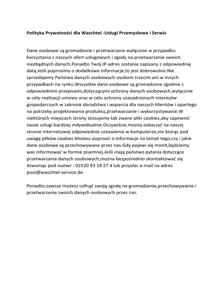 Polityka Prywatności dla Waschtel ‐Usługi Przemysłowe i Serwis Dane osobowe są gromadzone i przetwarzane wyłącznie w przypadku korzystania z naszych ofert usługowych i zgody na przetwarzanie swoich niezbędnych danych.Ponadto Twój IP‐adres zostanie zapisany z odpowiednią datą.Jeśli poprosimy o dodatkowe informacje,to jest dobrowolne.Nie sprzedajemy Państwa danych osobowych osobom trzecim ani w innych przypadkach na rynku.Wszystkie dane osobowe są gromadzone zgodnie z odpowiednimi przepisami,dotyczącymi ochrony danych osobowych,wyłącznie w celu realizacji umowy oraz w celu ochrony uzasadnionych interesów gospodarczych w zakresie doradztwa i wsparcia dla naszych klientów i opartego na potrzeby projektowania produktu,przetwarzanie i wykorzystywanie.W niektórych miejscach strony stosujemy tak zwane pliki cookies,aby zapewnić nasze usługi bardziej indywidualnie.Oczywiście,można zobaczyć na naszej stronie internetowej odpowiednie ustawienia w komputerze,nie biorąc pod uwagę plików cookies.Możesz poprosić o informacje na temat tego,czy i jakie dane osobowe są przechowywane przez nas.Gdy pojawi się monit,będziemy was informować w formie pisemnej.Jeśli mają państwo pytania dotyczące przetwarzania danych osobowych,można bezpośrednio skontaktować się dzwoniąc pod numer : 02520 93 19 27 4 lub przysłac e‐mail na adres post@waschtel‐service.de. Ponadto,zawsze możesz cofnąć swoją zgodę na gromadzenie,przechowywanie i przetwarzanie swoich danych osobowych przez nas.