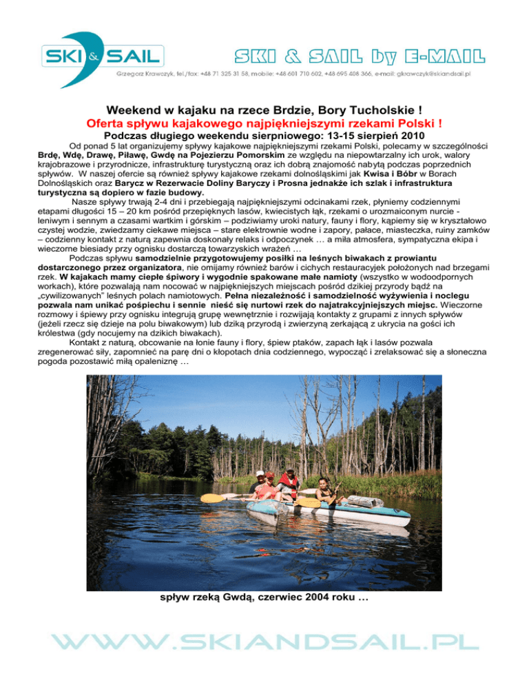 Weekend w kajaku na rzece Brdzie, Bory Tucholskie ! Oferta spływu kajakowego najpiękniejszymi rzekami Polski ! Podczas długiego weekendu sierpniowego: 13-15 sierpień 2010 Od ponad 5 lat organizujemy spływy kajakowe najpiękniejszymi rzekami Polski, polecamy w szczególności Brdę, Wdę, Drawę, Piławę, Gwdę na Pojezierzu Pomorskim ze względu na niepowtarzalny ich urok, walory krajobrazowe i przyrodnicze, infrastrukturę turystyczną oraz ich dobrą znajomość nabytą podczas poprzednich spływów. W naszej ofercie są również spływy kajakowe rzekami dolnośląskimi jak Kwisa i Bóbr w Borach Dolnośląskich oraz Barycz w Rezerwacie Doliny Baryczy i Prosna jednakże ich szlak i infrastruktura turystyczna są dopiero w fazie budowy. Nasze spływy trwają 2-4 dni i przebiegają najpiękniejszymi odcinakami rzek, płyniemy codziennymi etapami długości 15 – 20 km pośród przepięknych lasów, kwiecistych łąk, rzekami o urozmaiconym nurcie leniwym i sennym a czasami wartkim i górskim – podziwiamy uroki natury, fauny i flory, kąpiemy się w kryształowo czystej wodzie, zwiedzamy ciekawe miejsca – stare elektrownie wodne i zapory, pałace, miasteczka, ruiny zamków – codzienny kontakt z naturą zapewnia doskonały relaks i odpoczynek … a miła atmosfera, sympatyczna ekipa i wieczorne biesiady przy ognisku dostarczą towarzyskich wrażeń … Podczas spływu samodzielnie przygotowujemy posiłki na leśnych biwakach z prowiantu dostarczonego przez organizatora, nie omijamy również barów i cichych restauracyjek położonych nad brzegami rzek. W kajakach mamy ciepłe śpiwory i wygodnie spakowane małe namioty (wszystko w wodoodpornych workach), które pozwalają nam nocować w najpiękniejszych miejscach pośród dzikiej przyrody bądź na „cywilizowanych” leśnych polach namiotowych. Pełna niezależność i samodzielność wyżywienia i noclegu pozwala nam unikać pośpiechu i sennie nieść się nurtowi rzek do najatrakcyjniejszych miejsc. Wieczorne rozmowy i śpiewy przy ognisku integrują grupę wewnętrznie i rozwijają kontakty z grupami z innych spływów (jeżeli rzecz się dzieje na polu biwakowym) lub dziką przyrodą i zwierzyną zerkającą z ukrycia na gości ich królestwa (gdy nocujemy na dzikich biwakach). Kontakt z naturą, obcowanie na łonie fauny i flory, śpiew ptaków, zapach łąk i lasów pozwala zregenerować siły, zapomnieć na parę dni o kłopotach dnia codziennego, wypocząć i zrelaksować się a słoneczna pogoda pozostawić miłą opaleniznę … spływ rzeką Gwdą, czerwiec 2004 roku … Niezbędny ekwipunek uczestnika spływu: namiot 1-2-sobowy, karimata, śpiwór, latarka, strój kąpielowy, klapki, okulary przeciwsłoneczne, nakrycie głowy, kurtka przeciwdeszczowa, rękawiczki bezpalcowe do wiosłowania, ciepłe ubranie (na chłodniejsze noce), preparaty antykomarowe, worki wodoodporne, olejek lub krem do opalania, sztućce, menażka, kubek, środki higieny osobistej, uwaga!!! całość sprzętu i prowiantu zabieramy do kajaków więc proszę nie przesadzać z ilością odzieży … Miejsce spływu: rzeka Brda, Bory Tucholskie Termin: 13-15 sierpień 2010 roku (piątek-niedziela - 3 dni) Noclegi: w namiotach na polach biwakowych i leśnych polanach … Wyżywienie: HB, śniadania (kawa, herbata, chleb, masło, ser żółty, wędlina, warzywa +dodatki), lunch (gorące kubki, chleb ze smalcem, kabanosy), obiadokolacje (kiełbasa, pierś z kurczaka z ogniska, warzywa + dodatki) - przygotowywane przez uczestników spływu na butlach gazowych lub ognisku z zakupionego przez organizatora prowiantu … Sprzęt: kajaki dwuosobowe z wyposażeniem (wiosło, kapok) Dojazd: indywidualny do miejsca rozpoczęcia spływu, miejscowości Rytel, 365 km z Wrocławia, czas przejazdu około 5 h … Długość trasy spływu: : początek spływu Rytel – 106 km rzeki zakończenie spływu Gostycyń Nogawica – 81 km rzeki długość spływu – 25 km ilość dni – 3 średnie etapy dzienne – 8,3 km Cena: 200,00 PLN od osoby, zawiera: wypożyczenie dwuosobowych kajaków wraz z wyposażeniem, opłaty pól biwakowych, transport kajaków, transport osób po zakończeniu spływu, ubezpieczenie, usługi pilota i przewodnika, prowiant i wyżywienie HB (przygotowywane przez uczestników spływu na jego trasie na butli gazowej lub ognisku), kontakt z dziką naturą i przyrodą, niesamowite wrażenia i widoki, spokój i wyciszenie, miłą atmosferę, totalny luz, pamiątkowe zdjęcia i filmik … Zaliczka i zgłoszenia: zaliczka 50,00 PLN od osoby do dnia 15 lipca 2010 roku Brda: zaliczana do najatrakcyjniejszych szlaków wodnych w Polsce, jest lewym dopływem Wisły o długości 238 km i powierzchni dorzecza 4817 km, na które składają się 43 bezpośrednie dopływy oraz liczne jeziora. Przepływając wąskimi dolinami przemyka się tunelem zieleni otoczonym urwistymi, malowniczymi brzegami, pośród mieszanych rozległych lasów (Bory Tucholskie), rynnowymi jeziorami posiada niezwykle urozmaicony kręty bieg i liczne boczne szlaki oraz tworzy liczne przełomy, z których najbardziej znany Piekłem stanowi rezerwat przyrody przyciągający dzikością i niezwykłością. Na szlaku można podziwiać unikatowe skrzyżowanie dróg wodnych rzeki z jej kanałem oraz ścieżkę przyrodniczodydaktyczną. Brda jest szlakiem łatwym dostępnym dla początkujących kajakarzy, nieco uciążliwym jedynie w górnym biegu, z nielicznymi stałymi przeszkodami, bardzo dobrze zagospodarowanym turystycznie z polami biwakowymi wyposażonymi w natryski, paleniska i punkty gastronomiczne. Uwagi praktyczne: spływ przebiega dzikimi rzekami wśród lasów i łąk z ograniczonym dostępem do sklepów (konieczność zrobienia ulubionych zakupów np. piwo, słodycze i inne produkty na kilka dni), toalet (parudniowy brak kontaktu z ciepłą wodą), wc (las wita was), elektryczności (przydatne latarki i pełne baterie telefonów i aparatów fotograficznych), podczas spływu