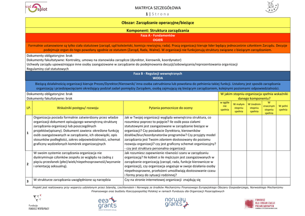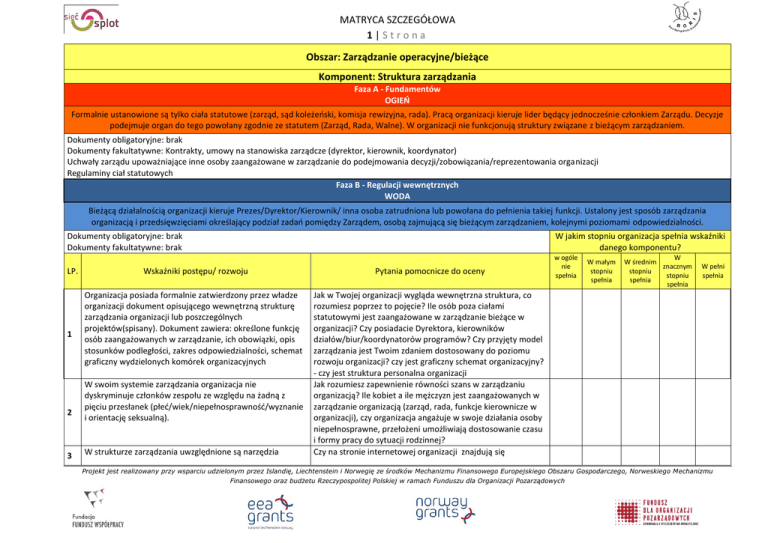 MATRYCA SZCZEGÓŁOWA 1|Strona Obszar: Zarządzanie operacyjne/bieżące Komponent: Struktura zarządzania Faza A - Fundamentów OGIEŃ Formalnie ustanowione są tylko ciała statutowe (zarząd, sąd koleżeoski, komisja rewizyjna, rada). Pracą organizacji kieruje lider będący jednocześnie członkiem Zarządu. Decyzje podejmuje organ do tego powołany zgodnie ze statutem (Zarząd, Rada, Walne). W organizacji nie funkcjonują struktury związane z bieżącym zarządzaniem. Dokumenty obligatoryjne: brak Dokumenty fakultatywne: Kontrakty, umowy na stanowiska zarządcze (dyrektor, kierownik, koordynator) Uchwały zarządu upoważniające inne osoby zaangażowane w zarządzanie do podejmowania decyzji/zobowiązania/reprezentowania organizacji Regulaminy ciał statutowych Faza B - Regulacji wewnętrznych WODA Bieżącą działalnością organizacji kieruje Prezes/Dyrektor/Kierownik/ inna osoba zatrudniona lub powołana do pełnienia takiej funkcji. Ustalony jest sposób zarządzania organizacją i przedsięwzięciami określający podział zadao pomiędzy Zarządem, osobą zajmującą się bieżącym zarządzaniem, kolejnymi poziomami odpowiedzialności. Dokumenty obligatoryjne: brak Dokumenty fakultatywne: brak W jakim stopniu organizacja spełnia wskaźniki danego komponentu? LP. w ogóle nie spełnia 1 2 3 Wskaźniki postępu/ rozwoju Pytania pomocnicze do oceny Organizacja posiada formalnie zatwierdzony przez władze organizacji dokument opisującego wewnętrzną strukturę zarządzania organizacji lub poszczególnych projektów(spisany). Dokument zawiera: określone funkcję osób zaangażowanych w zarządzanie, ich obowiązki, opis stosunków podległości, zakres odpowiedzialności, schemat graficzny wydzielonych komórek organizacyjnych Jak w Twojej organizacji wygląda wewnętrzna struktura, co rozumiesz poprzez to pojęcie? Ile osób poza ciałami statutowymi jest zaangażowane w zarządzanie bieżące w organizacji? Czy posiadacie Dyrektora, kierowników działów/biur/koordynatorów programów? Czy przyjęty model zarządzania jest Twoim zdaniem dostosowany do poziomu rozwoju organizacji? czy jest graficzny schemat organizacyjny? - czy jest struktura personalna organizacji Jak rozumiesz zapewnienie równości szans w zarządzaniu organizacją? Ile kobiet a ile mężczyzn jest zaangażowanych w zarządzanie organizacją (zarząd, rada, funkcje kierownicze w organizacji), czy organizacja angażuje w swoje działania osoby niepełnosprawne, przełożeni umożliwiają dostosowanie czasu i formy pracy do sytuacji rodzinnej? Czy na stronie internetowej organizacji znajdują się W swoim systemie zarządzania organizacja nie dyskryminuje członków zespołu ze względu na żadną z pięciu przesłanek (płed/wiek/niepełnosprawnośd/wyznanie i orientację seksualną). W strukturze zarządzania uwzględnione są narzędzia W małym stopniu spełnia W W średnim znacznym stopniu stopniu spełnia spełnia W pełni spełnia Projekt jest realizowany przy wsparciu udzielonym przez Islandię, Liechtenstein i Norwegię ze środków Mechanizmu Finansowego Europejskiego Obszaru Gospodarczego, Norweskiego Mechanizmu Finansowego oraz budżetu Rzeczypospolitej Polskiej w ramach Funduszu dla Organizacji Pozarządowych MATRYCA SZCZEGÓŁOWA 2|Strona wykorzystujące zdobycze społeczeostwa informacyjnego (internet, telefon, itd.) informacje o osobach pełniących funkcję w organizacji(imiona i nazwiska wraz z funkcjami we władzach), funkcjonują adresy e-mail w domenie organizacji w tym do osób zajmujących się zarządzaniem organizacją. Czy komunikacja internetowa jest wykorzystywana w zarządzaniu organizacją (grupy dyskusyjne, e-mail, komunikatory)? Maksymalna ilośd punktów w fazie = 12 Suma uzyskanych przez organizację punktów w danej fazie: Wskaźnik procentowy = Uzyskana liczba punktów*100% /maksymalna ilośd punktów Faza C - Spójności ZIEMIA Organizacja posiada wewnętrzną strukturę, np. biura, wydzielone projekty/programy oraz osoby odpowiedzialne za poszczególne komórki. Podział zadao pomiędzy Zarządem/Dyrektorem/niższymi szczeblami podejmowania decyzji jest dostosowany do wielkości organizacji oraz przyjętej struktury. Podejmowanie decyzji jest dokonywane na niższych poziomach Członkowie Zarządu wspierają bieżące zarządzanie organizacją. Dokumenty obligatoryjne: brak W jakim stopniu organizacja spełnia wskaźniki Dokumenty fakultatywne: brak danego komponentu? LP. Wskaźniki postępu/ rozwoju Pytania pomocnicze do oceny 1 Organizacja dokumentuje podejmowanie decyzji W jakim stopniu decyzje podejmowane przez ciała statutowe (zarząd, inne) są udokumentowane uchwałami? 2 Członkowie władz zatrudnieni w organizacji mają jasno rozgraniczone obowiązki wynikające z pełnienia funkcji we władzach organizacji od obowiązków projektowych/merytorycznych Co dokumentuje rozgraniczenie obowiązków władz statutowych od ich działalności na rzecz organizacji (nieodpłatnej, odpłatnej)? w ogóle nie spełnia W małym stopniu spełnia W W średnim znacznym stopniu stopniu spełnia spełnia W pełni spełnia Maksymalna ilośd punktów w fazie = 8 Suma uzyskanych przez organizację punktów w danej fazie: Wskaźnik procentowy = Uzyskana liczba punktów*100% /maksymalna ilośd punktów Projekt jest realizowany przy wsparciu udzielonym przez Islandię, Liechtenstein i Norwegię ze środków Mechanizmu Finansowego Europejskiego Obszaru Gospodarczego, Norweskiego Mechanizmu Finansowego oraz budżetu Rzeczypospolitej Polskiej w ramach Funduszu dla Organizacji Pozarządowych MATRYCA SZCZEGÓŁOWA 3|Strona Faza D - Zrównoważonego rozwoju POWIETRZE Przedstawiciele Zarządu biorą udział w bieżącym zarządzaniu organizacją, np. spotkaniach zespołu, grup tematycznych. Osoby z Zarządu odpowiedzialne za poszczególne obszary działania organizacji są angażowane w podejmowanie strategicznych decyzji. Biura, wydzielone projekty/programy oraz ich koordynatorzy posiadaj
