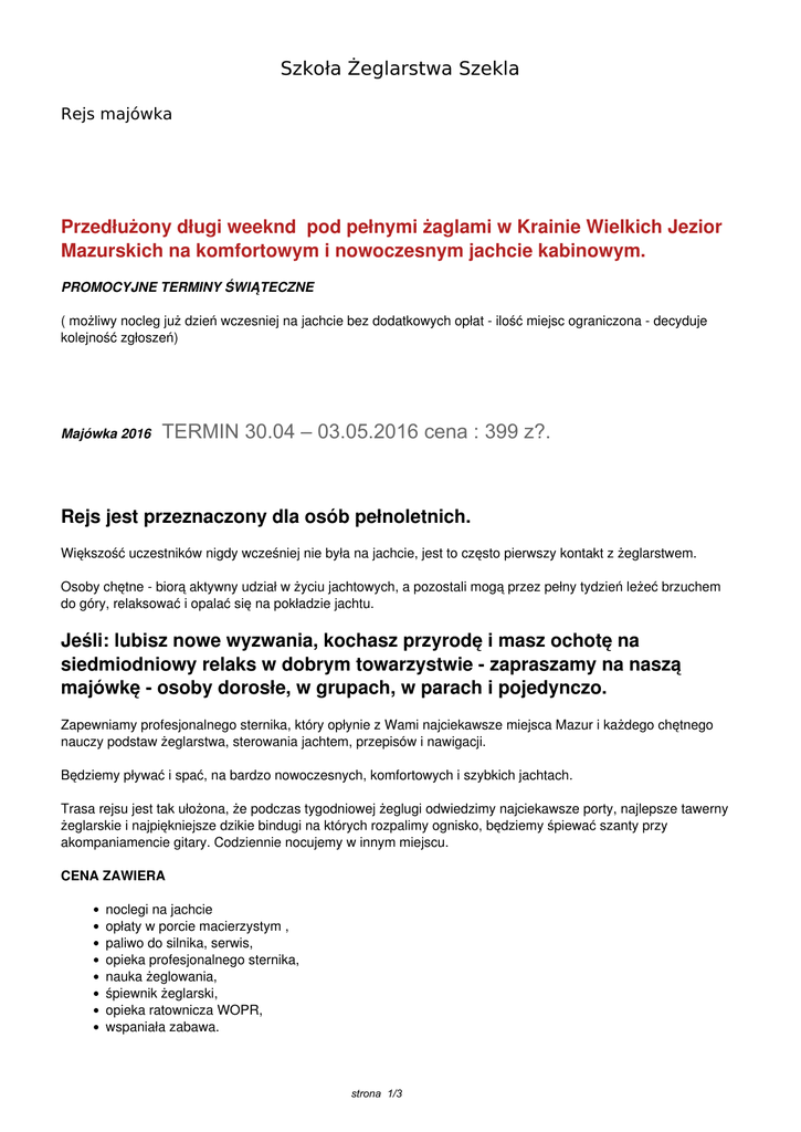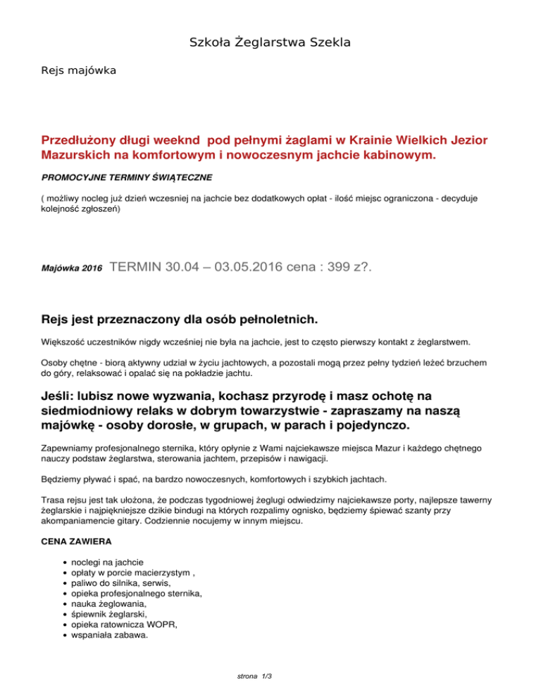 Szkoła Żeglarstwa Szekla Rejs majówka Przedłużony długi weeknd pod pełnymi żaglami w Krainie Wielkich Jezior Mazurskich na komfortowym i nowoczesnym jachcie kabinowym. PROMOCYJNE TERMINY ŚWIĄTECZNE ( możliwy nocleg już dzień wczesniej na jachcie bez dodatkowych opłat - ilość miejsc ograniczona - decyduje kolejność zgłoszeń) Majówka 2016 TERMIN 30.04 – 03.05.2016 cena : 399 z?. Rejs jest przeznaczony dla osób pełnoletnich. Większość uczestników nigdy wcześniej nie była na jachcie, jest to często pierwszy kontakt z żeglarstwem. Osoby chętne - biorą aktywny udział w życiu jachtowych, a pozostali mogą przez pełny tydzień leżeć brzuchem do góry, relaksować i opalać się na pokładzie jachtu. Jeśli: lubisz nowe wyzwania, kochasz przyrodę i masz ochotę na siedmiodniowy relaks w dobrym towarzystwie - zapraszamy na naszą majówkę - osoby dorosłe, w grupach, w parach i pojedynczo. Zapewniamy profesjonalnego sternika, który opłynie z Wami najciekawsze miejsca Mazur i każdego chętnego nauczy podstaw żeglarstwa, sterowania jachtem, przepisów i nawigacji. Będziemy pływać i spać, na bardzo nowoczesnych, komfortowych i szybkich jachtach. Trasa rejsu jest tak ułożona, że podczas tygodniowej żeglugi odwiedzimy najciekawsze porty, najlepsze tawerny żeglarskie i najpiękniejsze dzikie bindugi na których rozpalimy ognisko, będziemy śpiewać szanty przy akompaniamencie gitary. Codziennie nocujemy w innym miejscu. CENA ZAWIERA noclegi na jachcie opłaty w porcie macierzystym , paliwo do silnika, serwis, opieka profesjonalnego sternika, nauka żeglowania, śpiewnik żeglarski, opieka ratownicza WOPR, wspaniała zabawa. strona 1/3 CENA NIE ZAWIERA Dojazdu Wyżywienia ( w tym załoga gwarantuje wyżywienie dla sternika ) Opłat portowych ( z wspólnej kasy jachtowej w zależności od portu około 4 zł/ dzień os) poza portem macierzystym Dodatkowego paliwa do silnika ( o ile będzie potrzebne - gwarantujemy 1 pełny bak ) Gwarantujemy: doborowe towarzystwo, dobrą zabawę i niezapomniane wrażenia. Majówka pod żaglami to dobry wybór na krótki, pełen przeżyć urlop. ZAPRASZAMY Majówka to idealny termin na żagle. Otwarcie sezonu tyrustycznego, piękna przyroda a jednocześnie brak tłumów , spokój i przyjemność żeglowania bez ryku motorówek i skuterów wodnych, które w tym czasie jeszcze nie zakłócają ciszy mazurskich jezior. INFORMACJE TECHNICZNE CO ZABRAĆ NA REJS? TRASA REJSU BEZPIECZEŃSTWO NASZA BAZA . POCZĄTEK REJSU NAJCZESTSZE PYTANIA SPIEWNIKK ŻEGLARSKI W PREZENCIE ZNIŻKI: 5% dla grup powyżej 2 osób dla osób, które płyną z nami kolejny raz UWAGA: ZNIŻKA 100% dla osoby , która zbierze całą załogę 7 osób PROMOCYJNE TERMINY ŚWIĄTECZNE strona 2/3 strona 3/3 Powered by TCPDF (www.tcpdf.org)